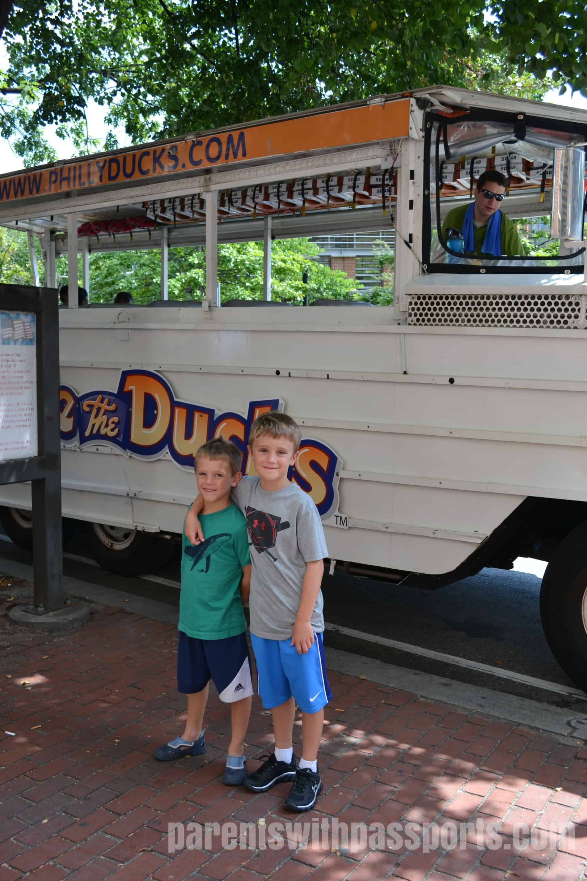 The drive was easy and to simplify things we parked right in the parking garage at the Independence Visitor Center.  Aside from providing convenient (though expensive) parking, the visitor center actually had a lot to offer.  The visitor center has some really nicely done exhibits, as well as a theater showing free historical films about Philadelphia during the American Revolution.  You can also purchase tickets to practically any attraction in the city.  We figured that the duck boat would be a fun and easy way for the kids to tour the city, so we bought our Ride the Ducks tickets (along with quackers of course!) and headed the few blocks to the start of the tour.