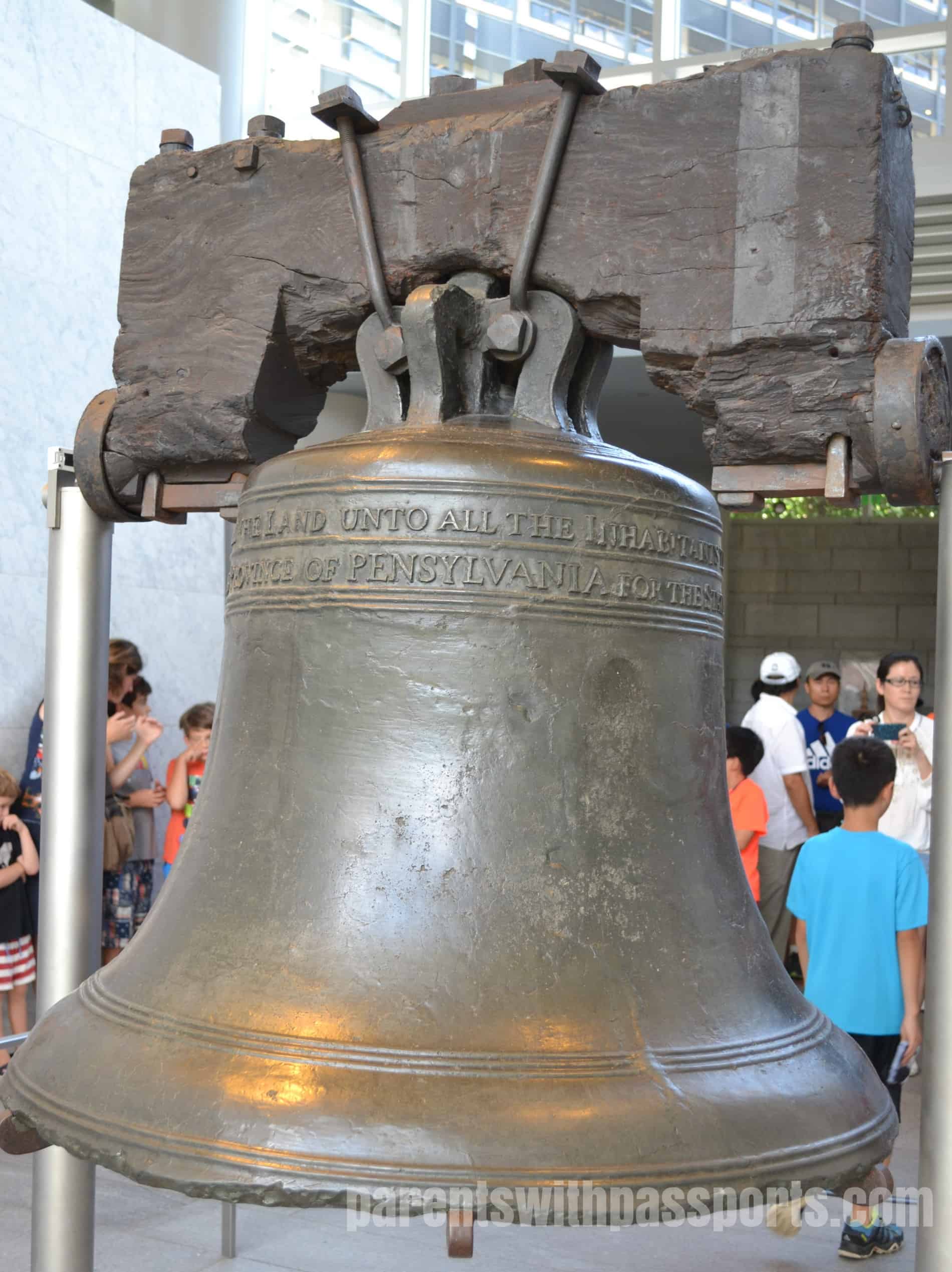 After the tour, we headed back to the visitor center where we took advantage of their cafe area to cool down and enjoy a picnic lunch we had packed.  When we were done recharging, we headed across the street to the Liberty Bell.  Tickets are not required – just hop on the end of the line.  We waited for a little bit outside and then went through security screening before continuing indoors.  There are some interesting exhibits about the construction and history of the bell, as well as a 10 minute video.  At the end of the exhibit hall, the Liberty Bell is displayed against a backdrop of tall glass windows.  With a light shining down on it from above and the natural light pouring through the windows, it is a dramatic and beautiful display.