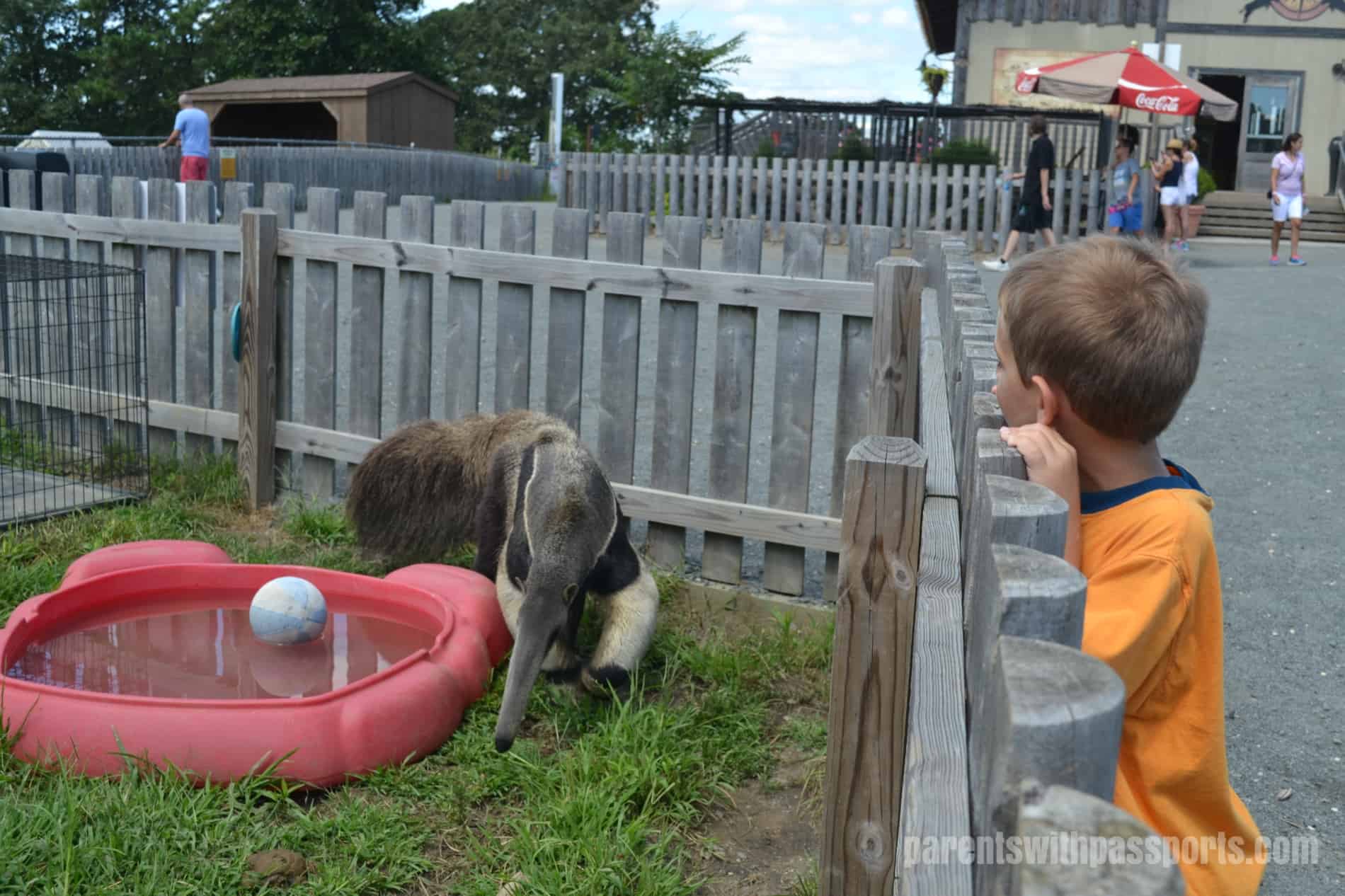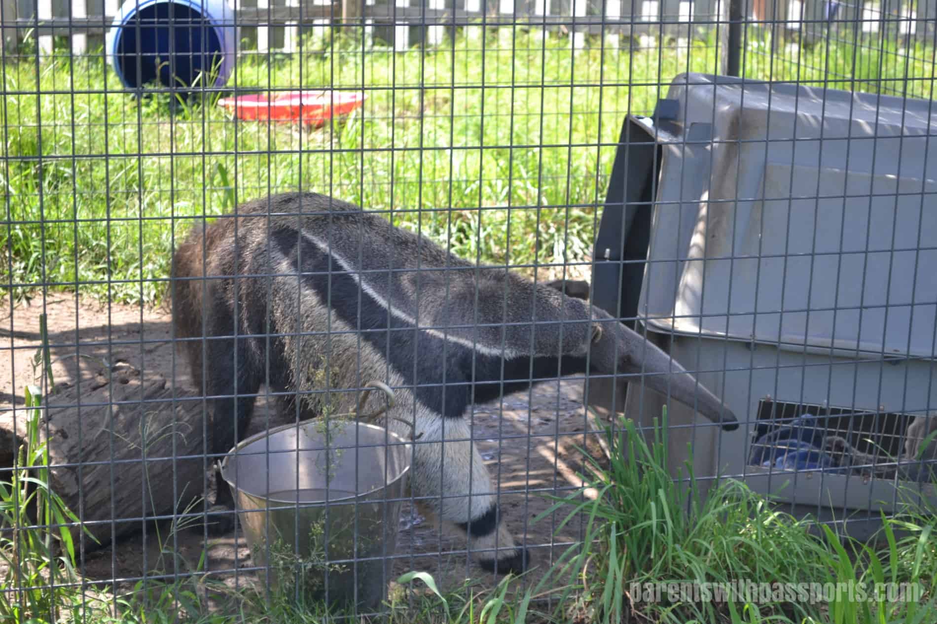 Exiting out the back of the reptile house, you enter the main area of the camp. They have several enclosures with different types of animals – some birds, some small mammals, and usually a baby animal or two that are waiting to be big enough to be introduced to the main safari. By far the animal that fascinated our group the most was the anteater. What a bizarre looking creature! JB must have spent 20 minutes talking to the keeper, peppering her with questions about the animal.