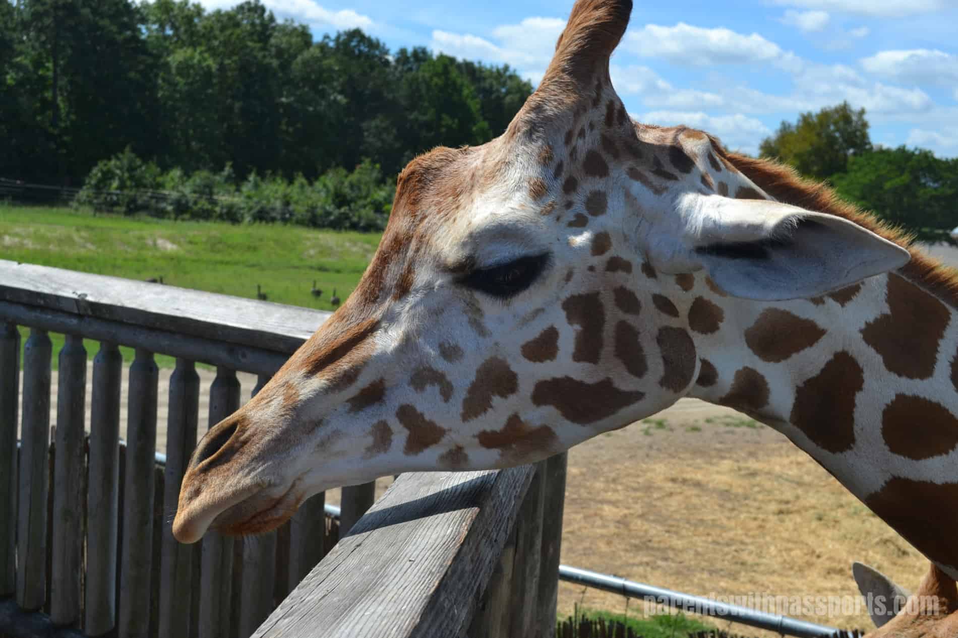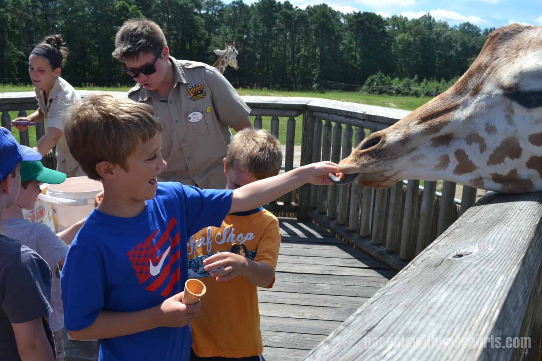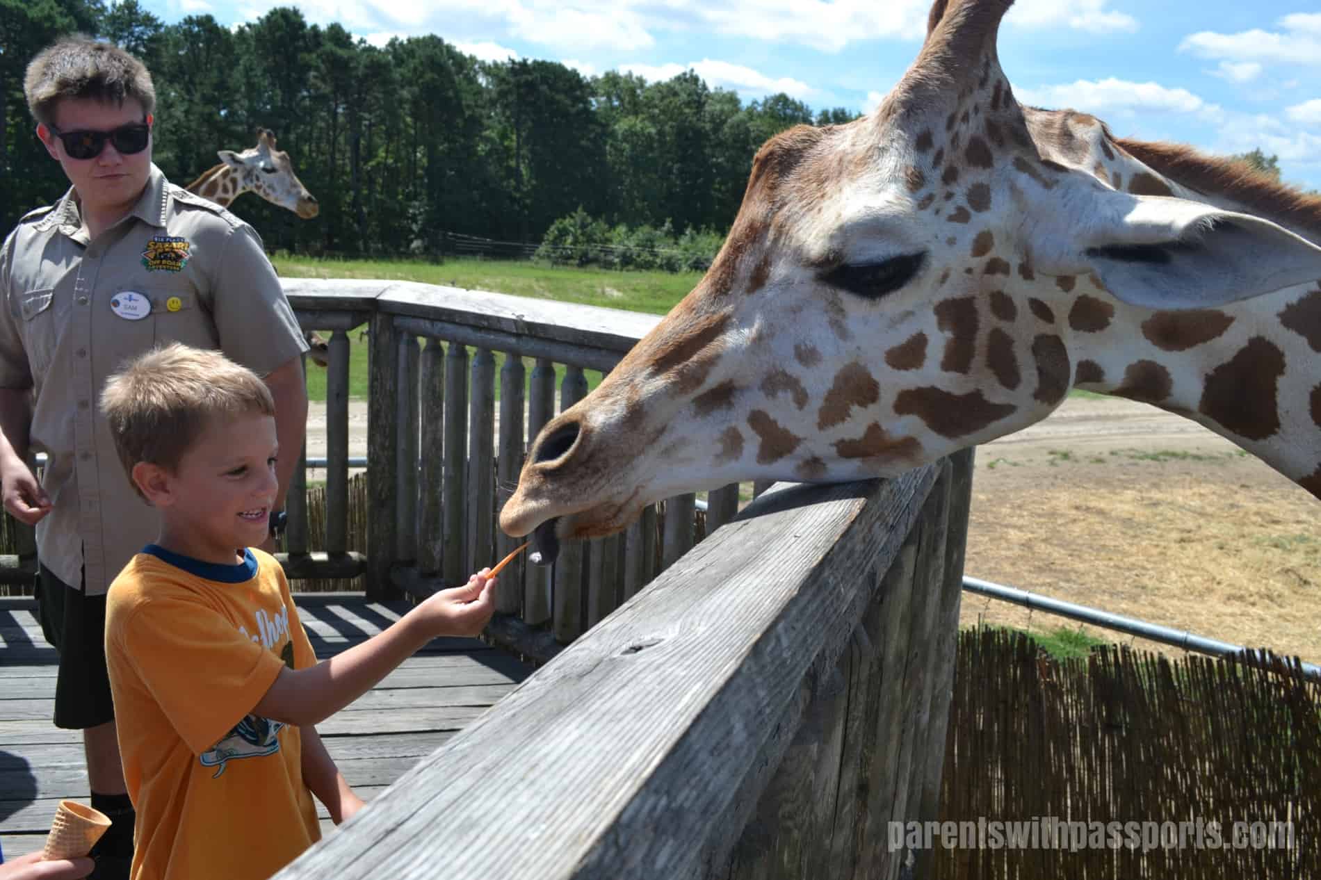 After exploring the different animals in the enclosures, we went to feed the giraffes. Each ticket holder received an ice cream cone filled with carrot sticks. The boys loved holding the sticks out and seeing the giraffe’s long, purplish tongue come out and wrap around the food.