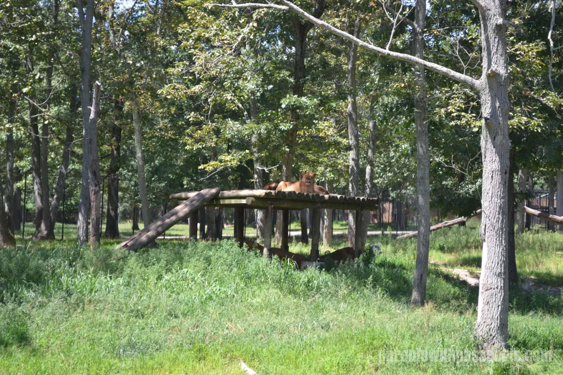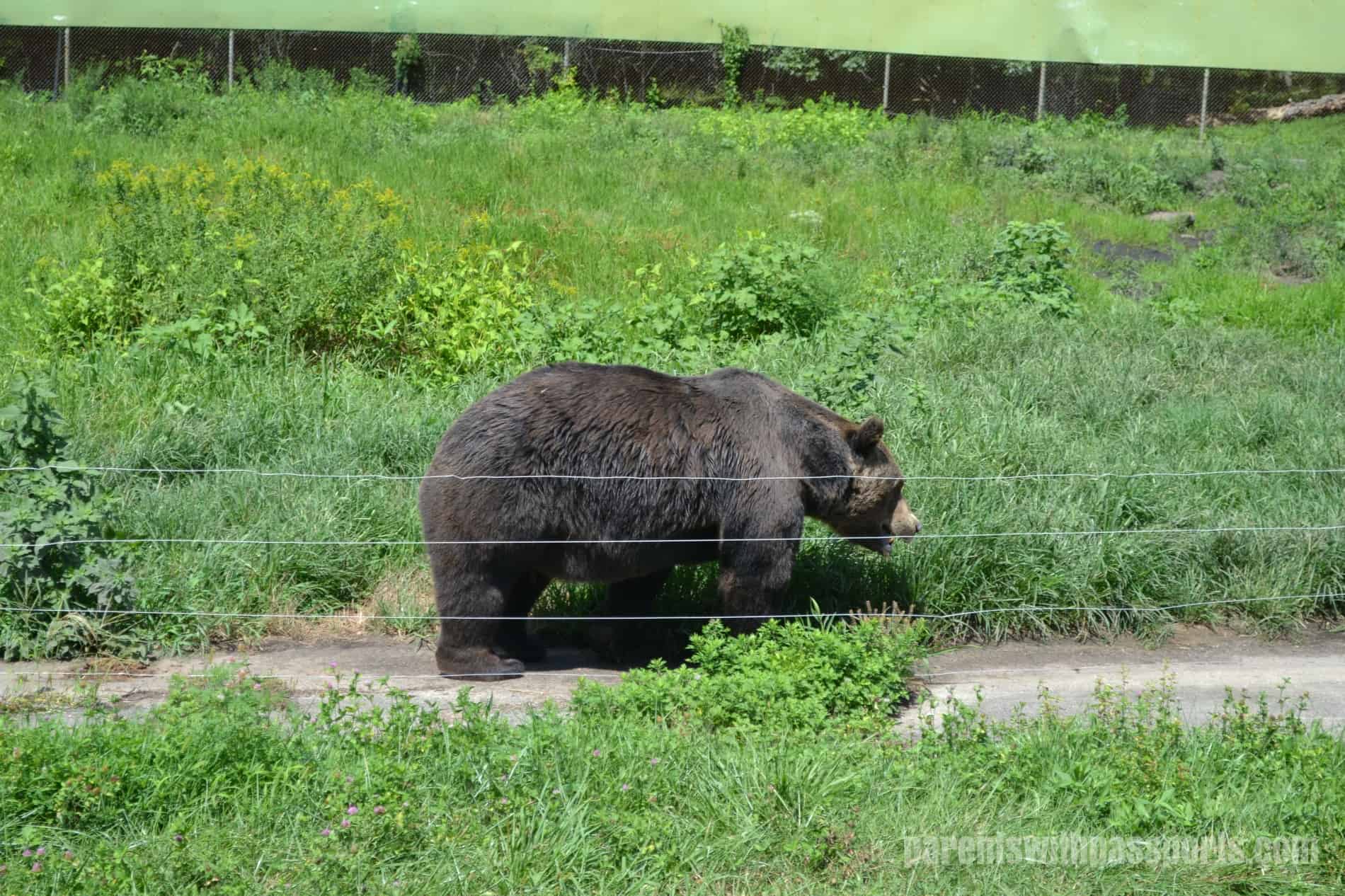 When we finished feeding the giraffes the carrot sticks (and the ice cream cone!) we headed back to hop on the next jeep (they come approximately every 5 minutes). On our way out we noticed a playful bear cub in his enclosure. We watched in amusement as he sat in a big plastic tub (presumably a pool or bath to cool down in) and flipped himself over and rolled all around, doing somersaults while adeptly still remaining in the tub. He was quite entertaining and seemed to enjoy his audience.