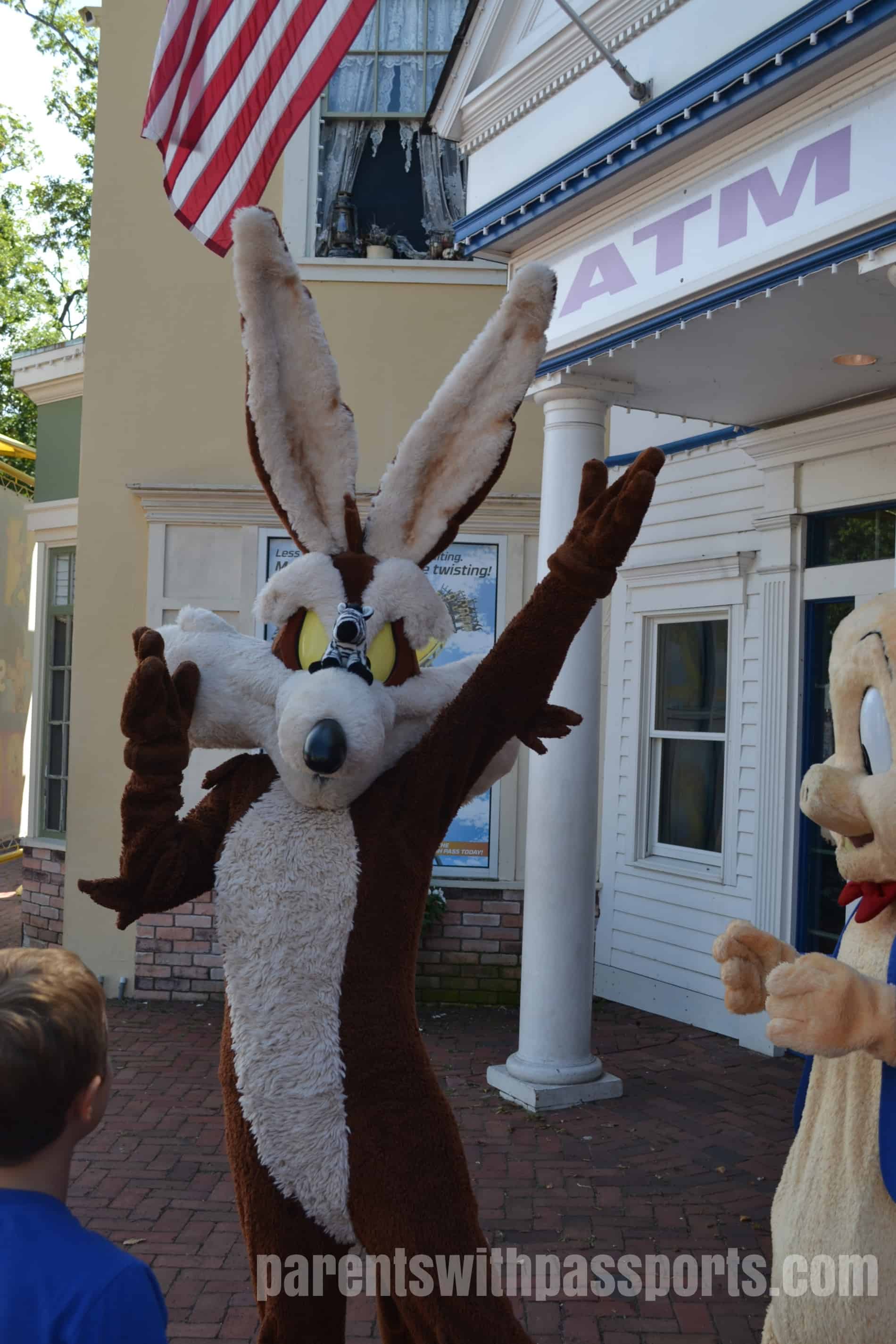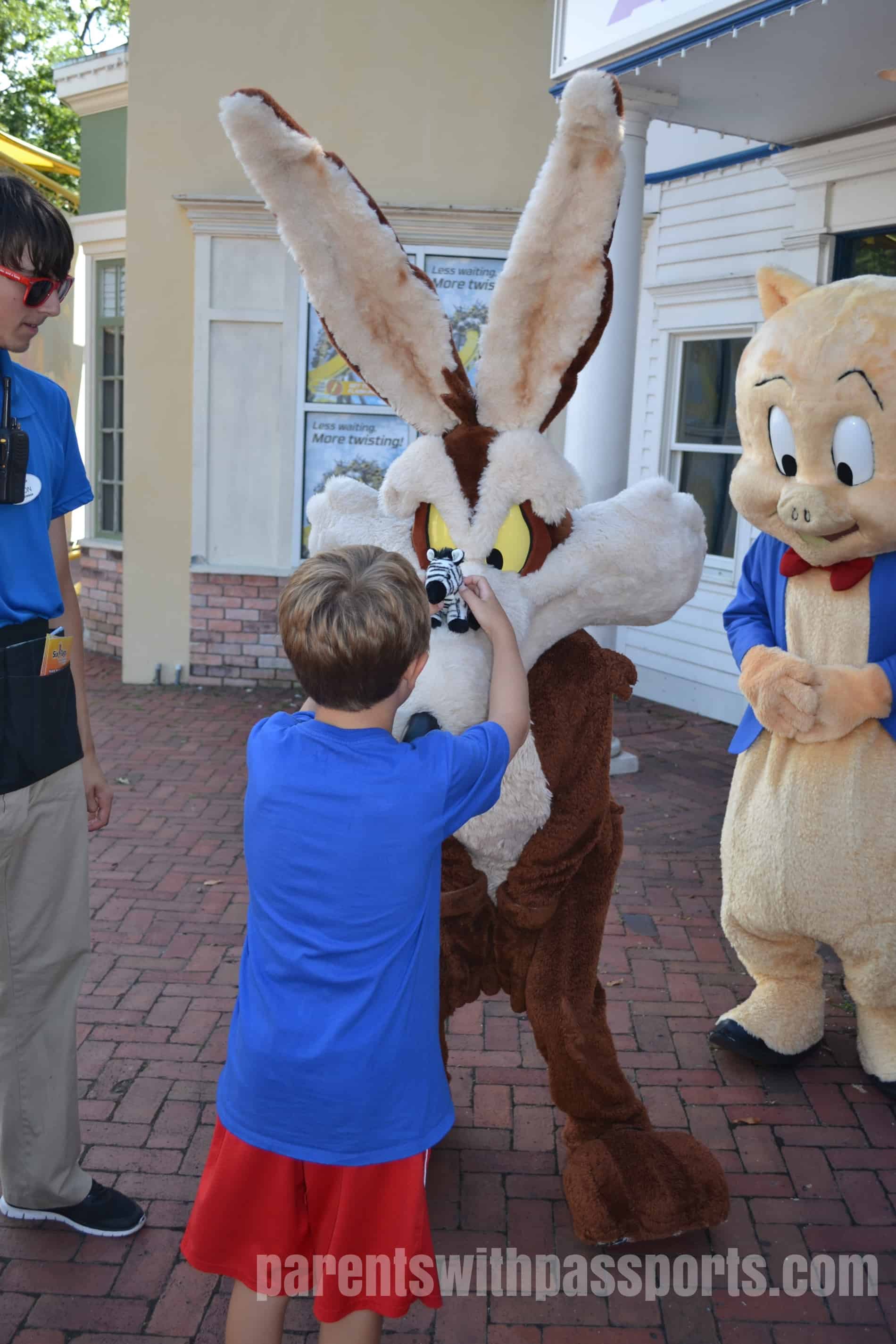 On the way out of the park, we had to make one last stop for some prime character interaction. Looney Tunes is definitely not in my kid’s regular TV rotation and in fact they only knew who the characters were at all because they had watched Space Jam at basketball camp earlier in the summer. But JB underwent a complete transformation while on our Disney cruise and is now obsessed with any character he can meet. We found Wile E Coyote and Porky Pig hanging out on Main Street. JB immediately started joking around with them and then Wile E Coyote took RB’s stuffed zebra and balanced it on his nose. The characters were really interactive and fun and did a great job entertaining the kids.