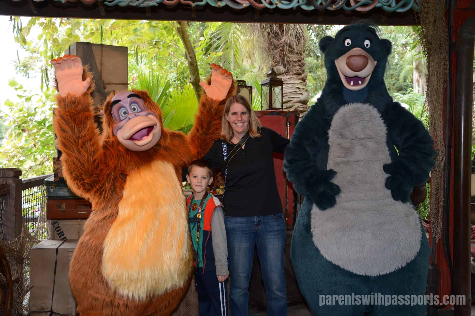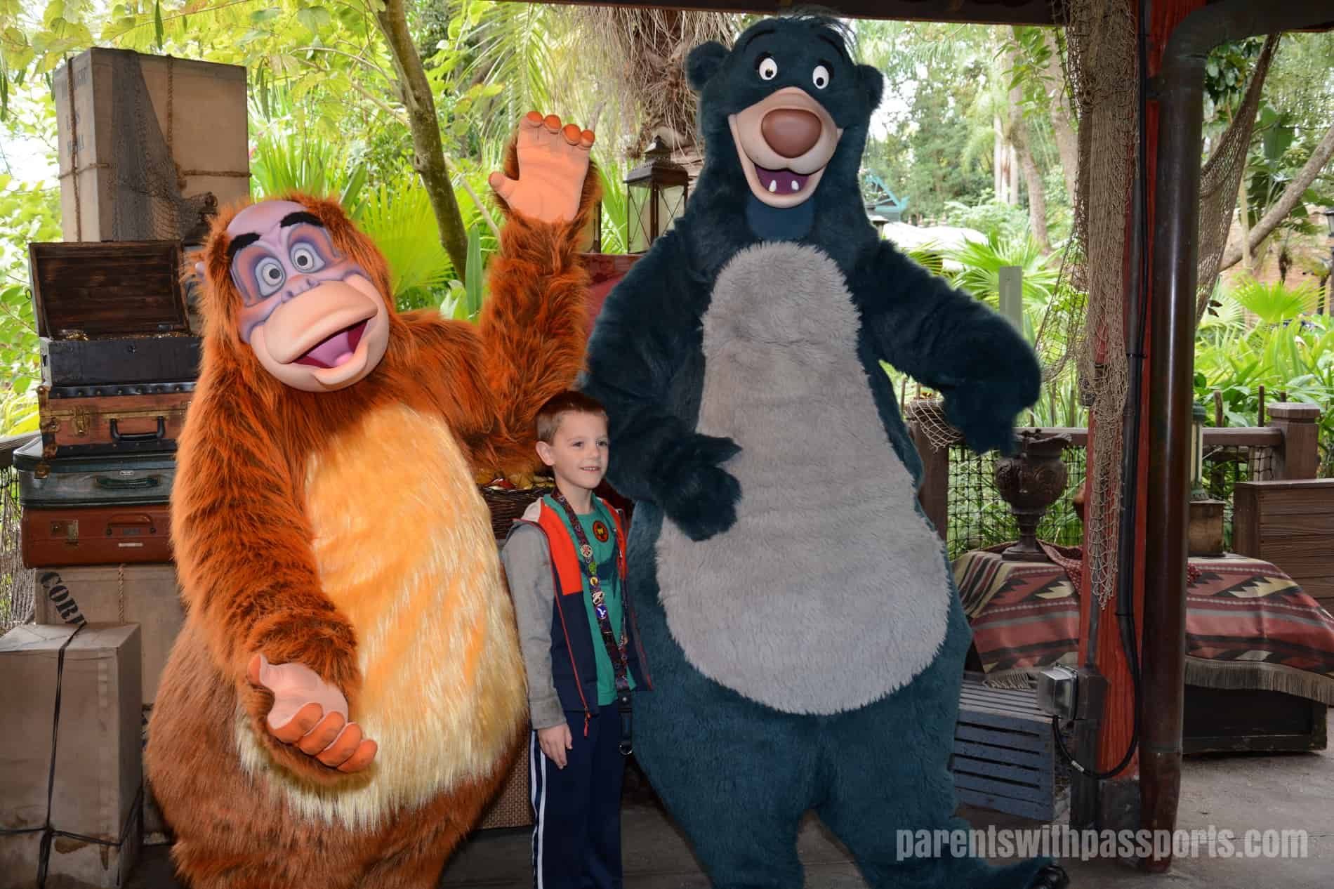 After the show we decided to head to Dinoland but were sidetracked again, this time by Baloo and King Louie. They walked right past us as they were headed to their character meet spot and JB automatically fell in line behind them. So as was often the case on this trip, we split up again – Blair and RB for more rides, me and JB for more characters. Despite them just arriving, the line backed up quickly but it was worth the wait. The character interaction was great. King Louie played around with JB, messing up his hair, giving him high fives, and stealing his pen and holding it way up high so he couldn’t reach it.