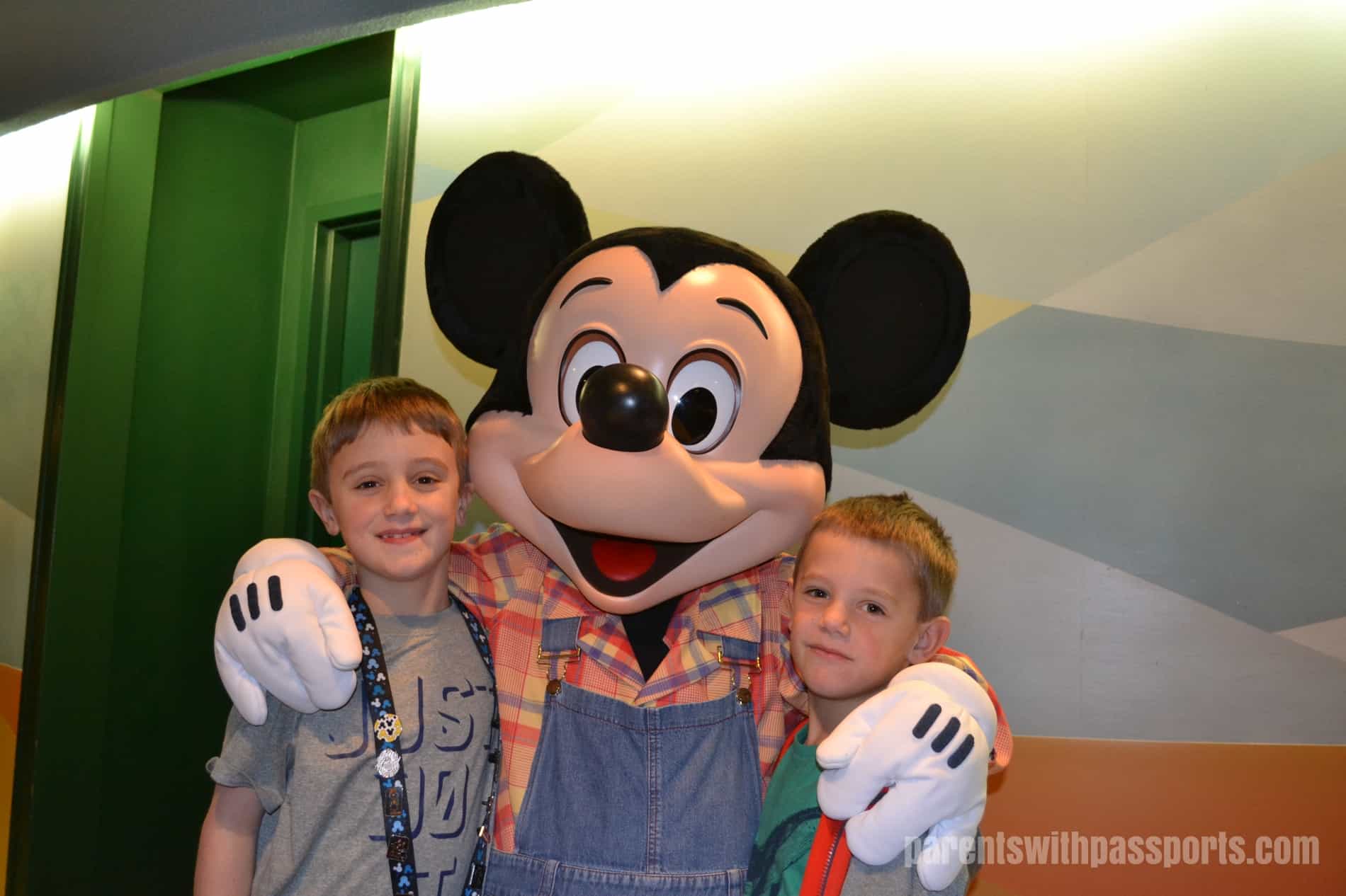 The restaurant was not at all full when we got there but they seated us at an inside table, which annoyed me a little. Part of the appeal of the restaurant was being able to look down into the Living with the Land ride, which we couldn’t do from our seats. But since it was nearly empty we still had a decent view from above and the boys could go down for a closer look whenever they wanted. The characters immediately started making the rounds – Mickey stopped by first and then Pluto. They were not rushed at all and spent some time signing autographs and goofing around with the boys. Chip and Dale soon followed and were up to similar antics. JB got his autograph book signed and both boys had some great interactions with all of the characters.