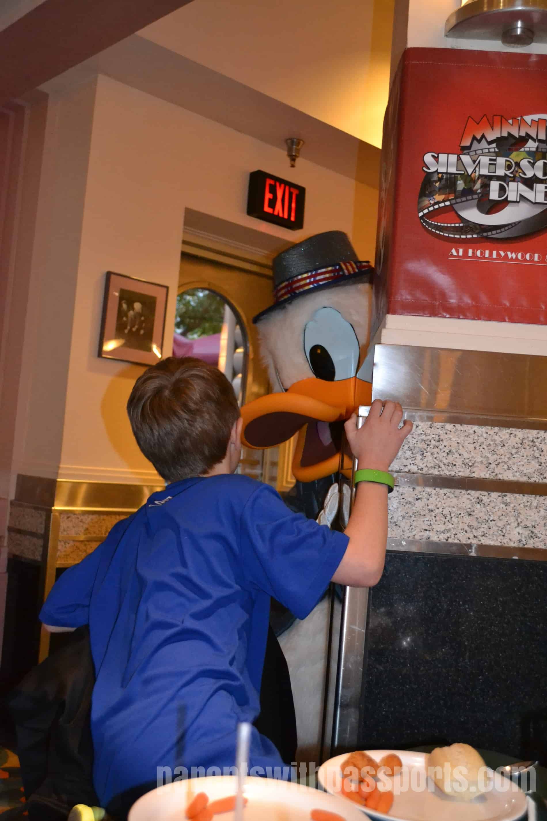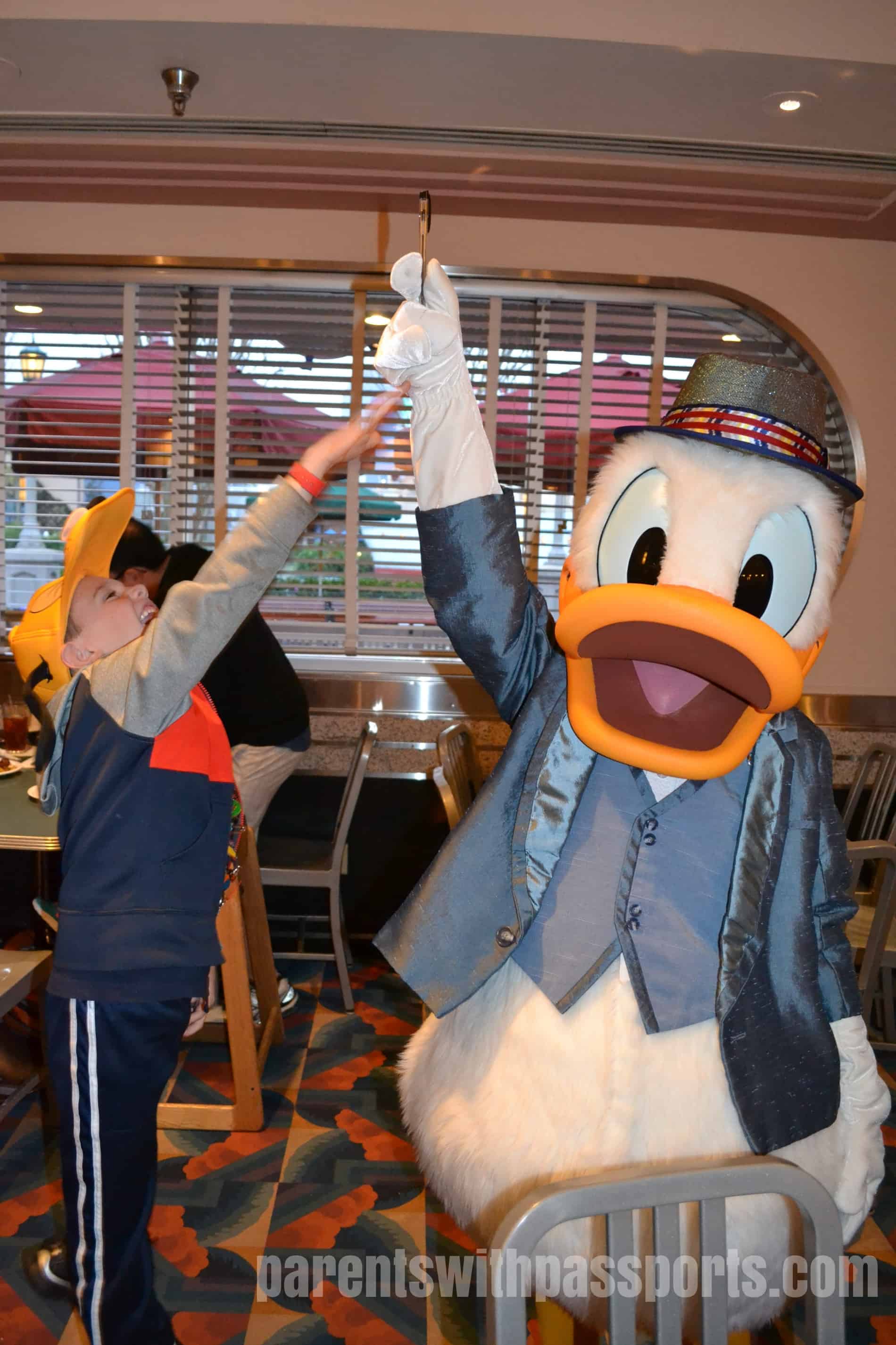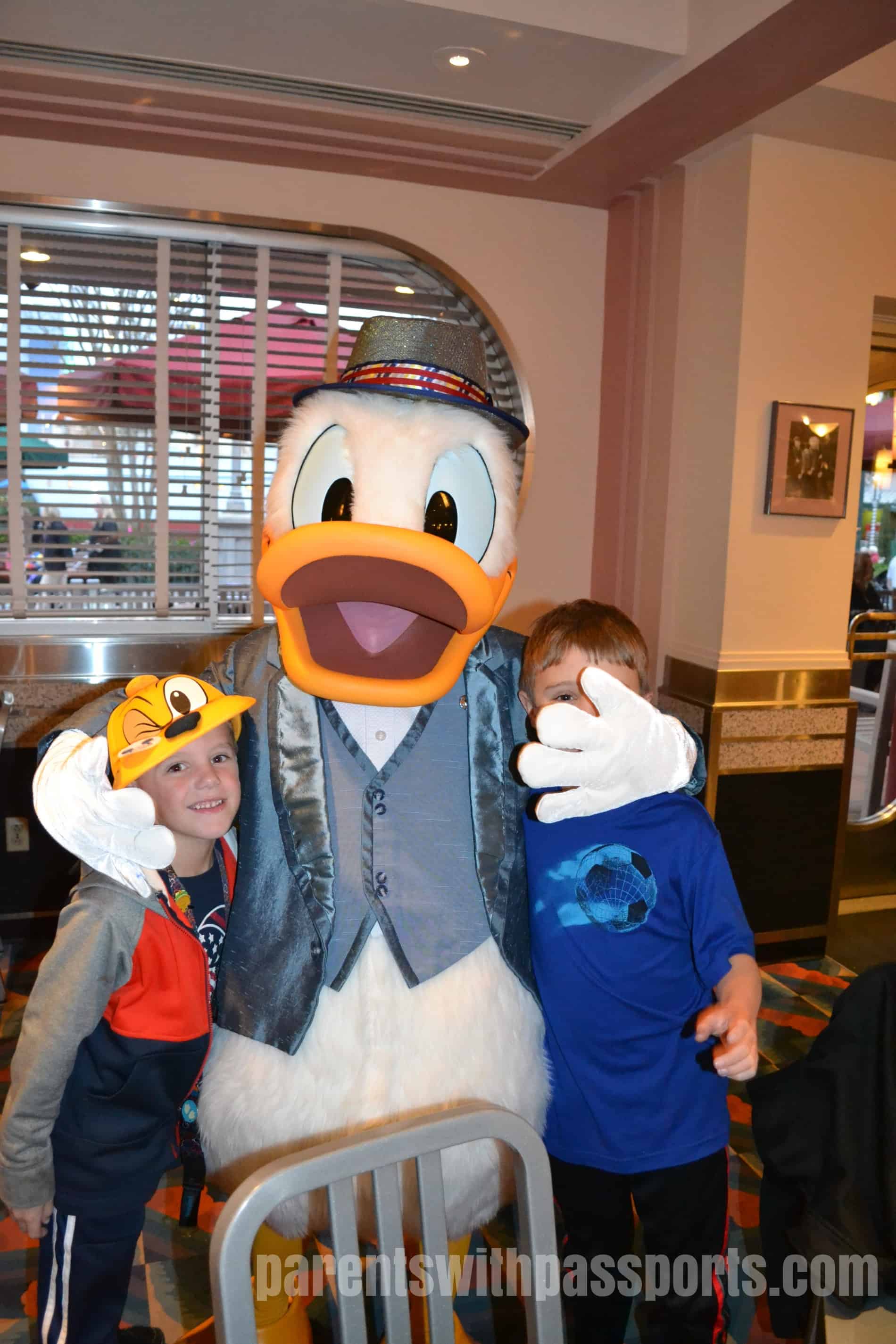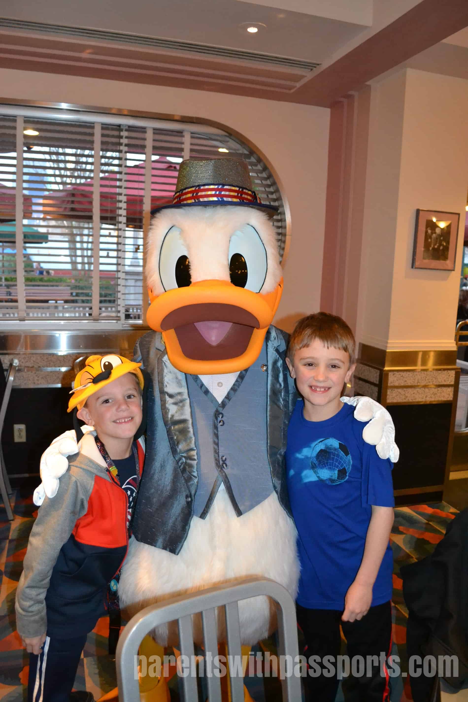 We waited for a while even though we had a reservation. But it was a fun character meal because you got 5 of the main Disney characters in one place – Mickey, Minnie, Donald, Daisy, and Goofy. Mickey stays at the front of the restaurant for a photo opportunity on your way out and the other 4 rotate around the restaurant visiting tables. All of them were dressed to the nines in their Hollywood best. Donald was the most fun – he hid behind the pillar and kept reaching around to tap RB on the shoulder and after he signed JB’s book he held the pen up in the air and made him jump to catch it.