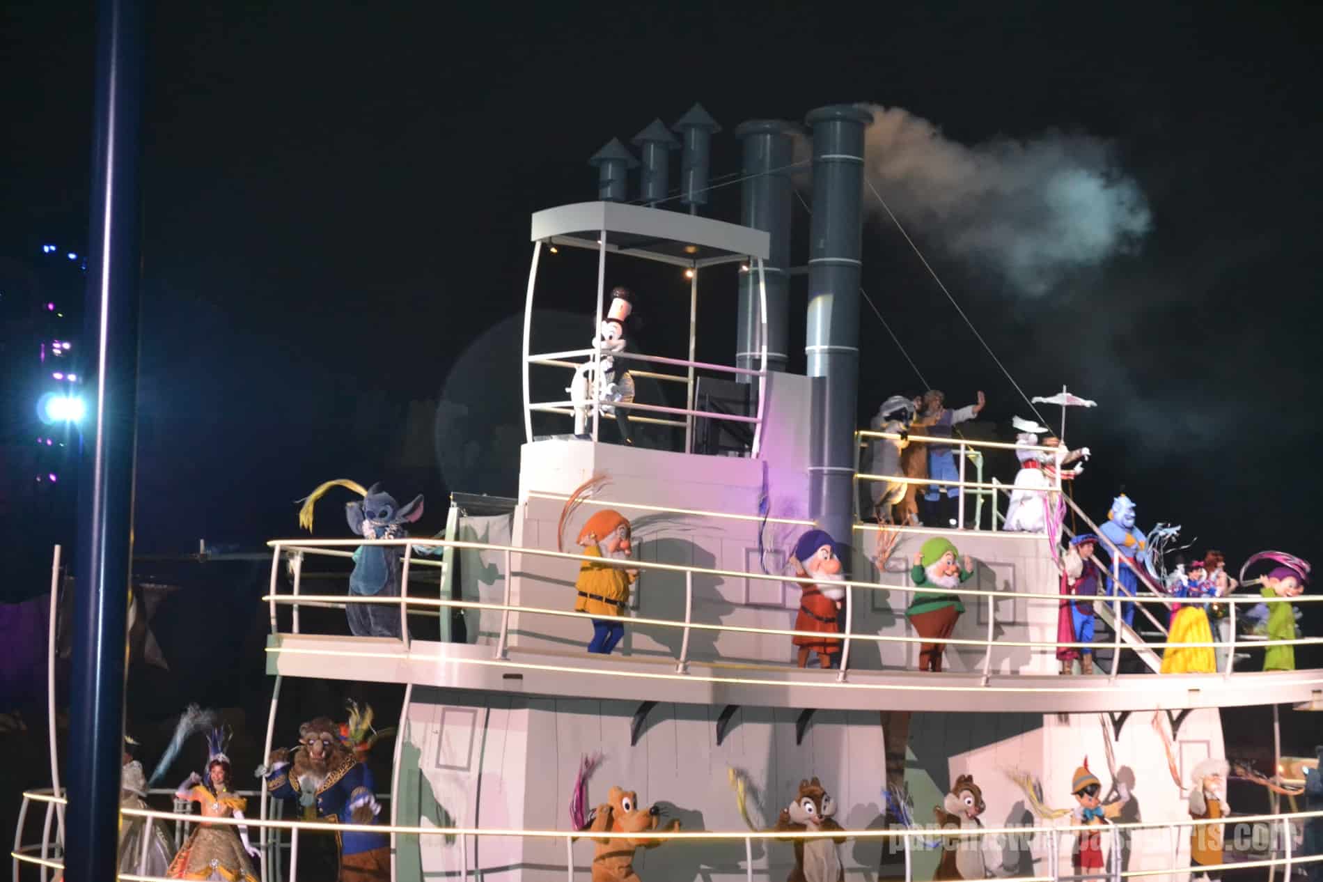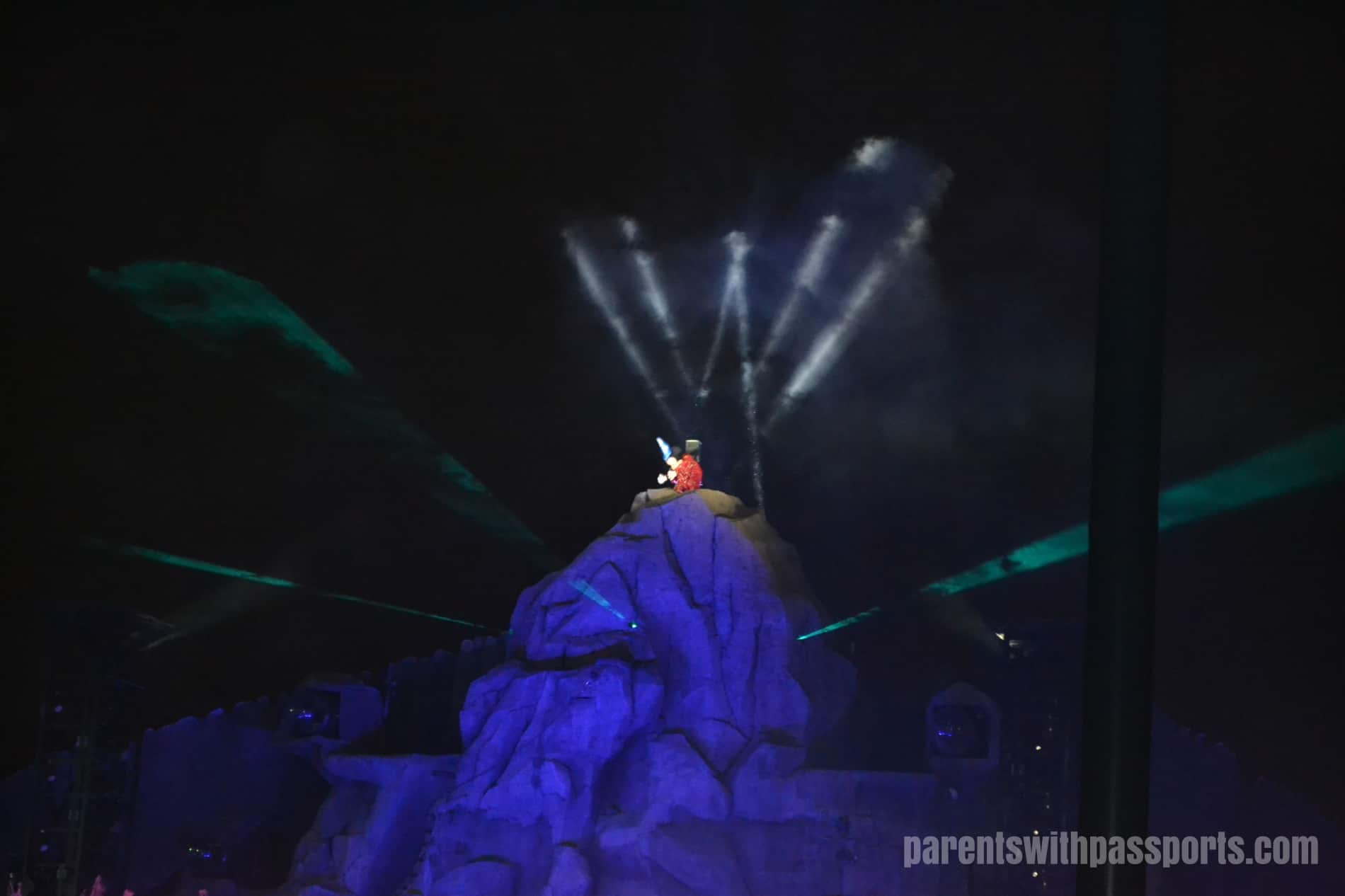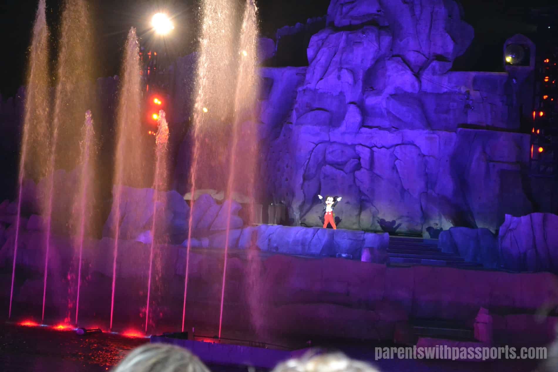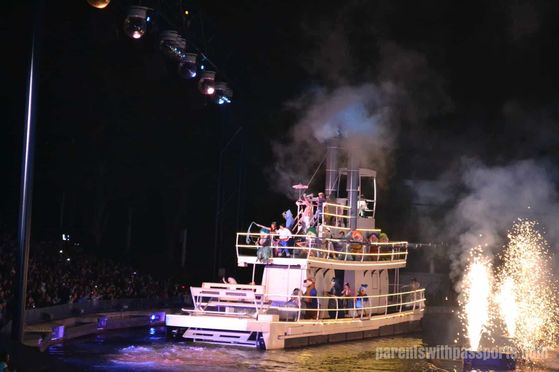 But all was not lost. As intense and scary as some parts were, the effects were amazing and the kids were blown away by the pyrotechnics, laser lights, shooting water, and projected animations. And then a literal boatload of characters rode in to save the day (or night). When Steamboat Willie captained in a riverboat full of 25+ Disney characters dancing and singing, I knew everything would be ok.