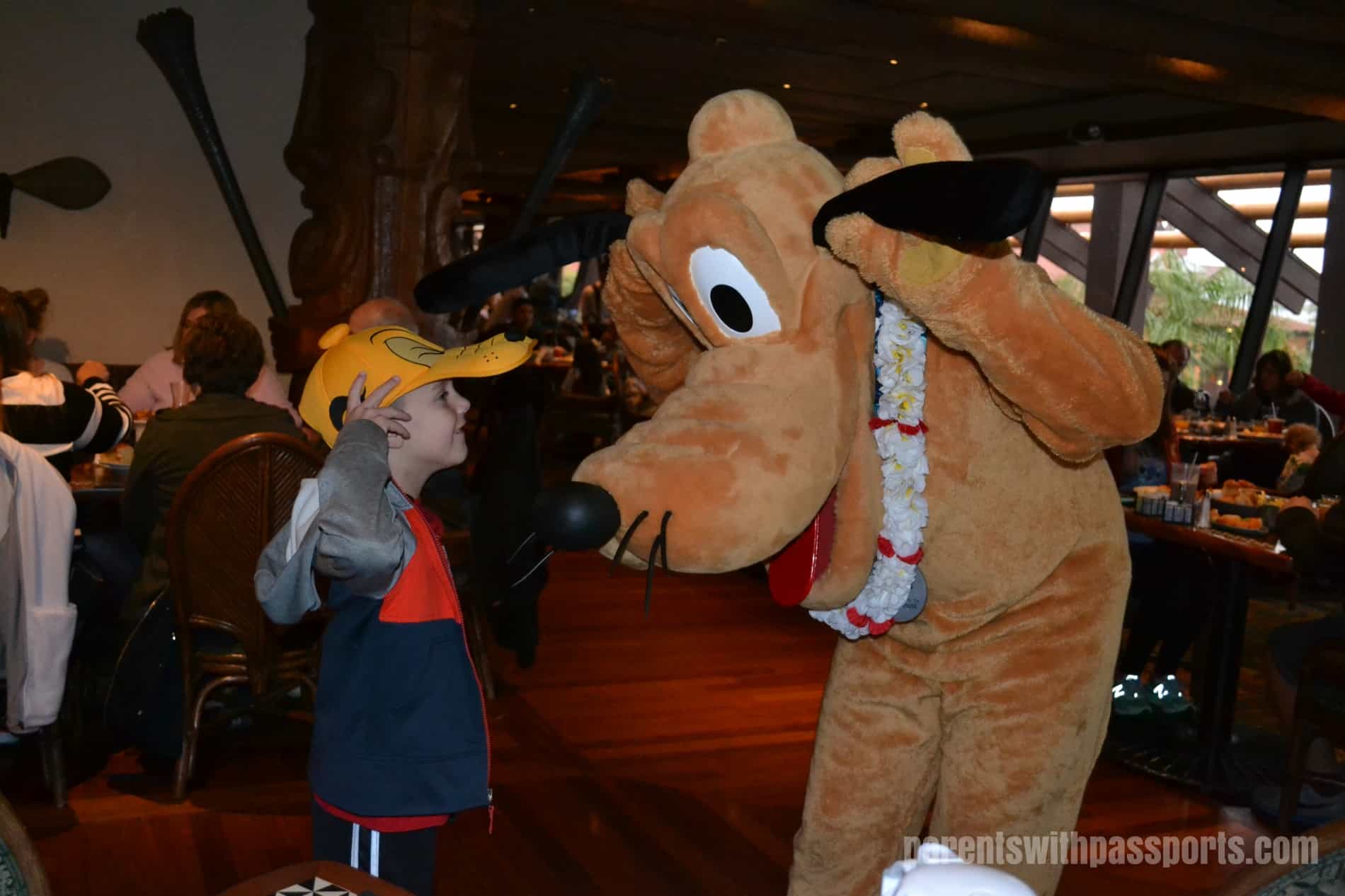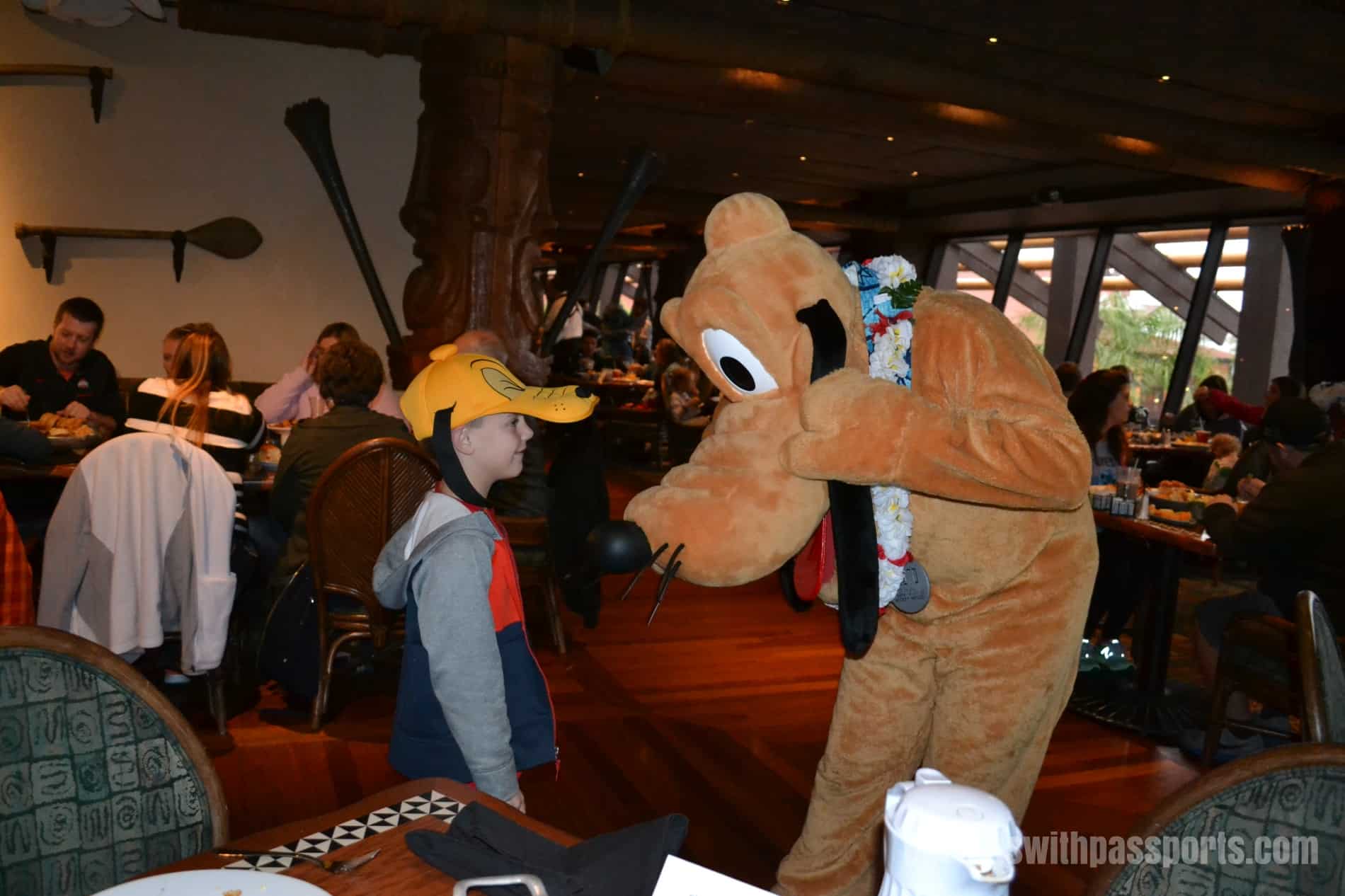Soon after we sat down a parade broke out around the restaurant. With the music playing, Mickey and Pluto led the kids around the restaurant. JB grabbed some maracas and fell in behind Pluto. It was a fun way to start off the meal. After that the characters made their way around the tables – we saw Pluto, Mickey, Stitch and Lilo in that order.