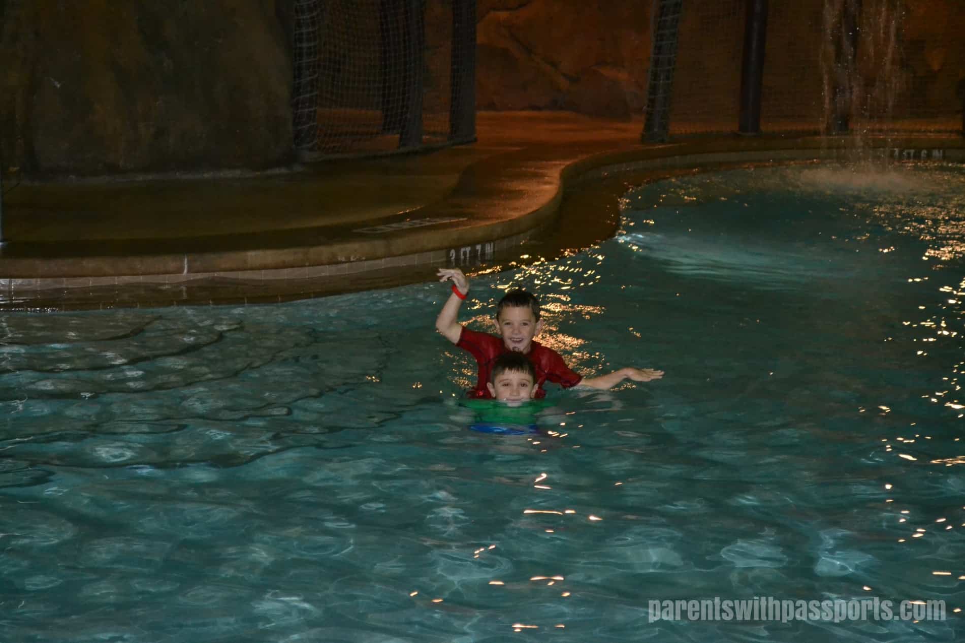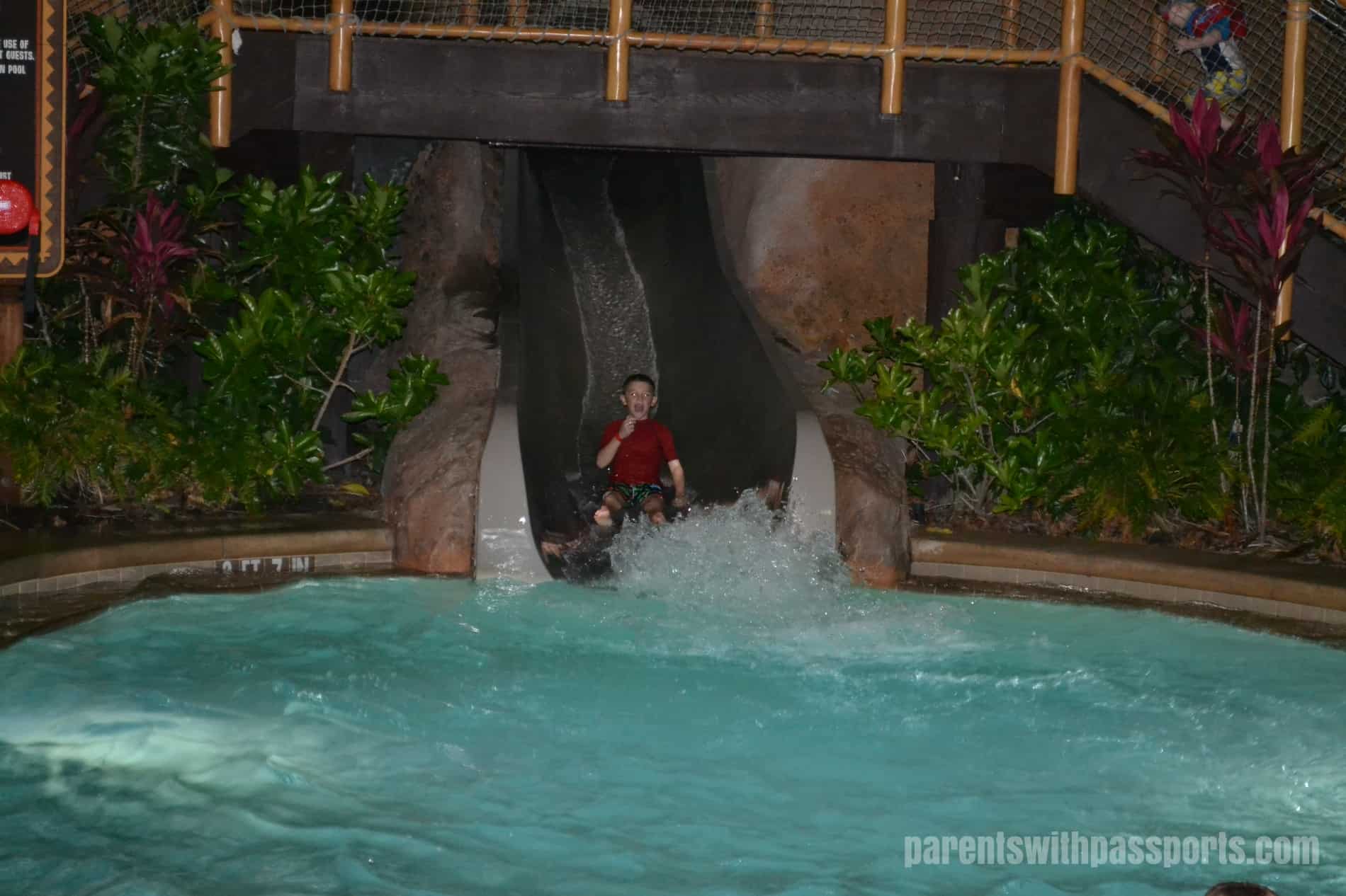 The Polynesian has two pools – the Lava Pool is the main pool and the Oasis Pool is the smaller and quieter pool. The boys loved the Lava pool, where they were able to climb the volcano to ride down a 142 foot long water slide. We only had one night warm enough for the pool but they took full advantage of it.