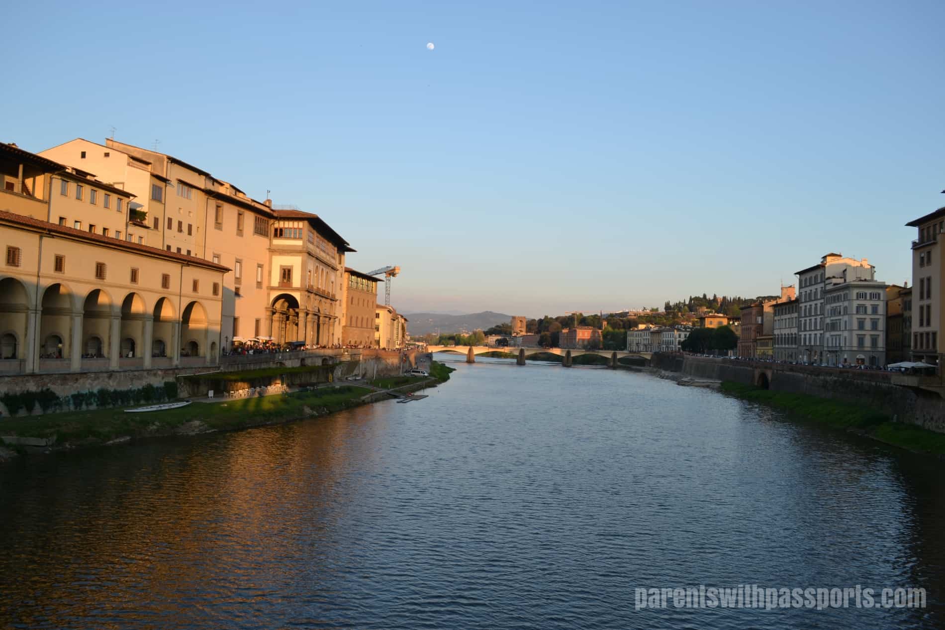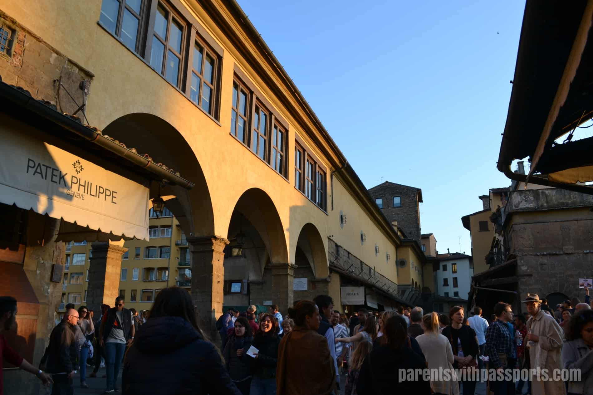 Today you will find throngs of tourists buying souvenirs from the street vendors and jewelry from the shopkeepers. It was ridiculously crowded when we were there and since neither cheap souvenirs nor expensive jewelry are my thing, we didn’t stay long. I found the Ponte Vecchio best appreciated for its views – the bridge itself is fascinating to see, with its almost 700 year old shops built out over the edge of the bridge, and it provides a beautiful view down river of the Ponte alle Grazie in one direction and Ponte Santa Trinity in the other. With the sun starting to hang low in the sky, the lighting on both bridges and the buildings along the river was beautiful.
