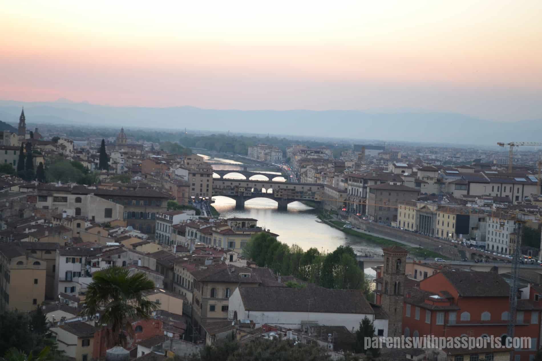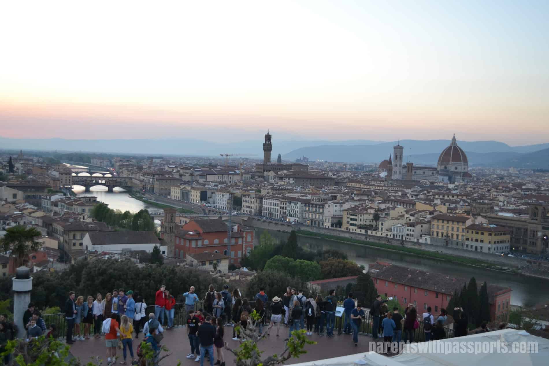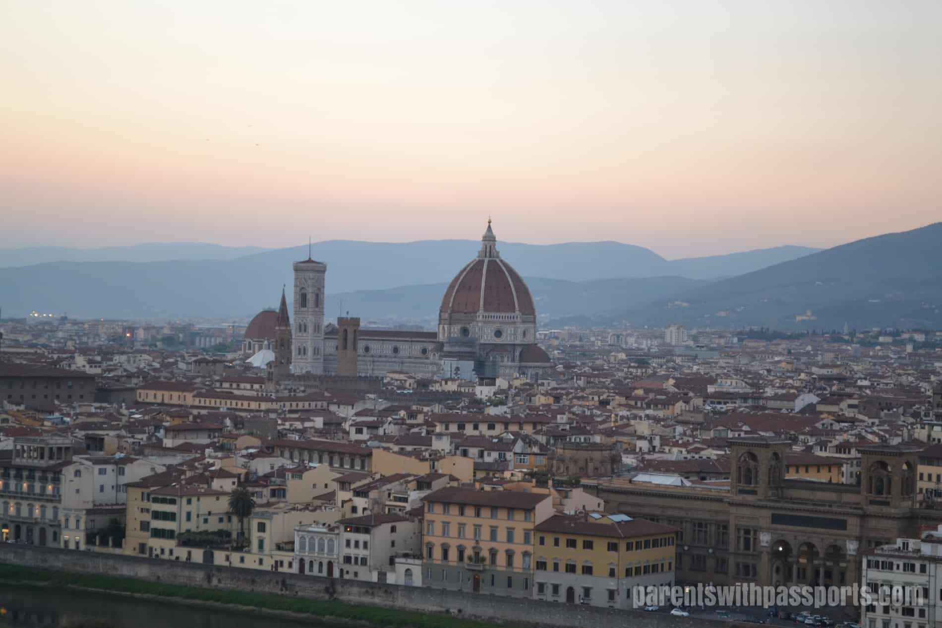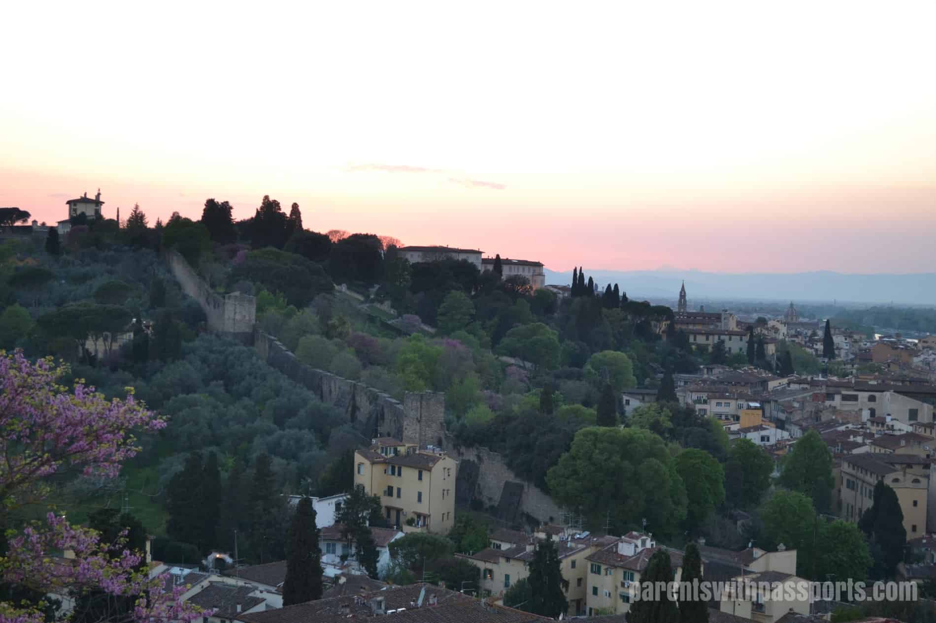 As pretty as the sun setting on the buildings along the river was, we wanted to try to catch the sunset over all of Florence so we had to high tail it to Piazzale Michelangelo. It was a long, hot, uphill walk to get there but absolutely worth it for the views. With the sky changing colors and the mountains in the background, Florence looked stunning.