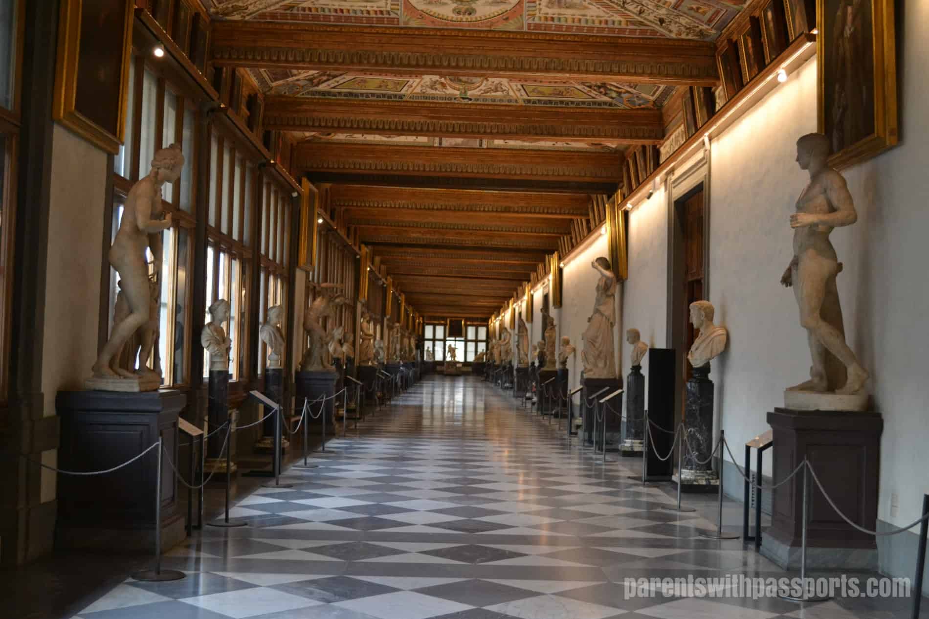 And that’s exactly what we did. I had heard nightmares of waiting on line for up to 5 hours just to get into the Uffizi, only to end up shoulder to shoulder with thousands of strangers trying to get a peek at Botticelli’s The Birth of Venus. The museum closes at 6:50 pm and we arrived a little before 5:30. The line to buy a ticket was less than 10 minutes long so we ended up with about an hour and 15 minutes to explore. But here’s the thing… it was almost completely empty. Seriously, this is an empty hallway in the Uffizi on a Saturday in April. Not a (living, non-marble) person in sight.