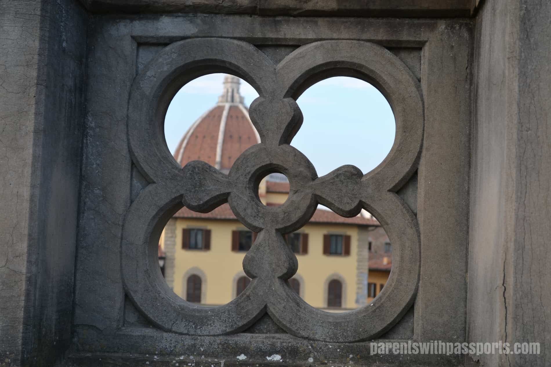Originally a private museum for the Medici family, the Uffizi and its vast collection of art was gifted to the Lorraine family in 1743 with the condition that the whole collection remain intact and that it always stayed in Florence. In 1769, the family opened it to the public. We roamed the halls and rooms of the gallery, following the progression from Medieval to Renaissance art. In addition to the impressive collection of paintings and sculptures, the building itself is a work of art in many places, most notably La Tribuna. This octagonal room houses some of the Medici’s favorite pieces, but the opulently decorated room is as much a focus of attention as the art. The four elements are represented in the amazing details: the walls are covered in red velvet (fire), the domed ceiling is lined with thousands of mother-of-pearl shells (water), the marble floor flower mosaic (earth), and a weather vane in the lantern at the top of the dome (wind).