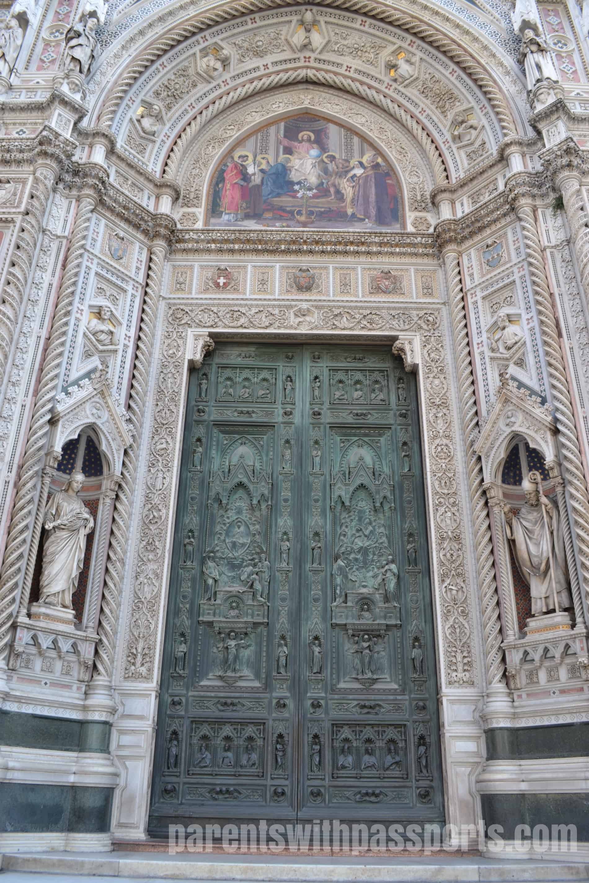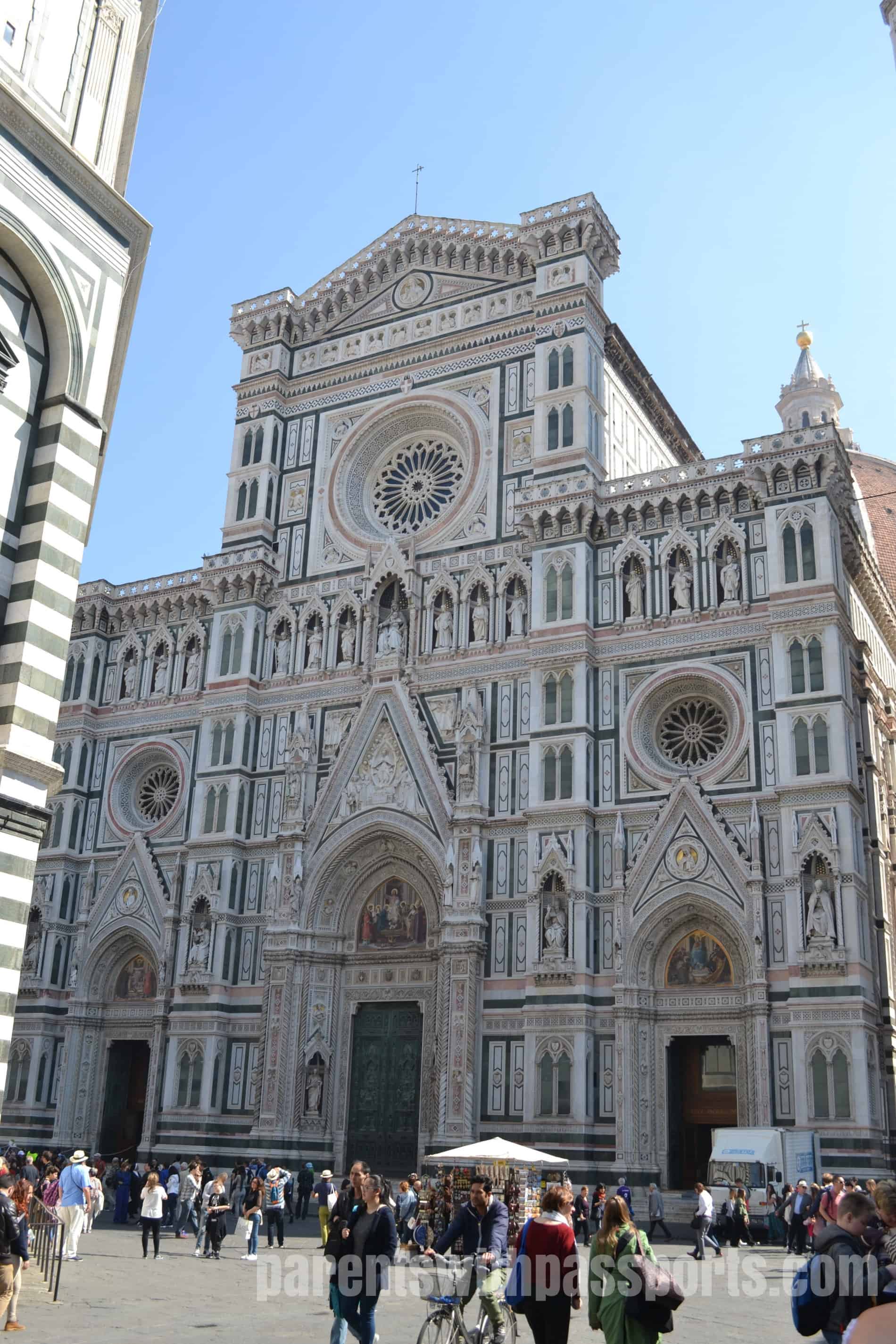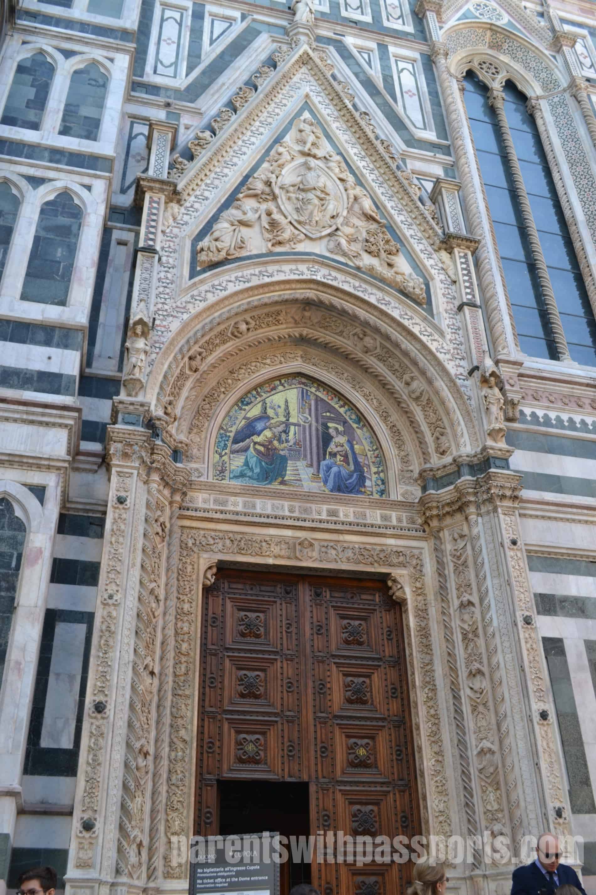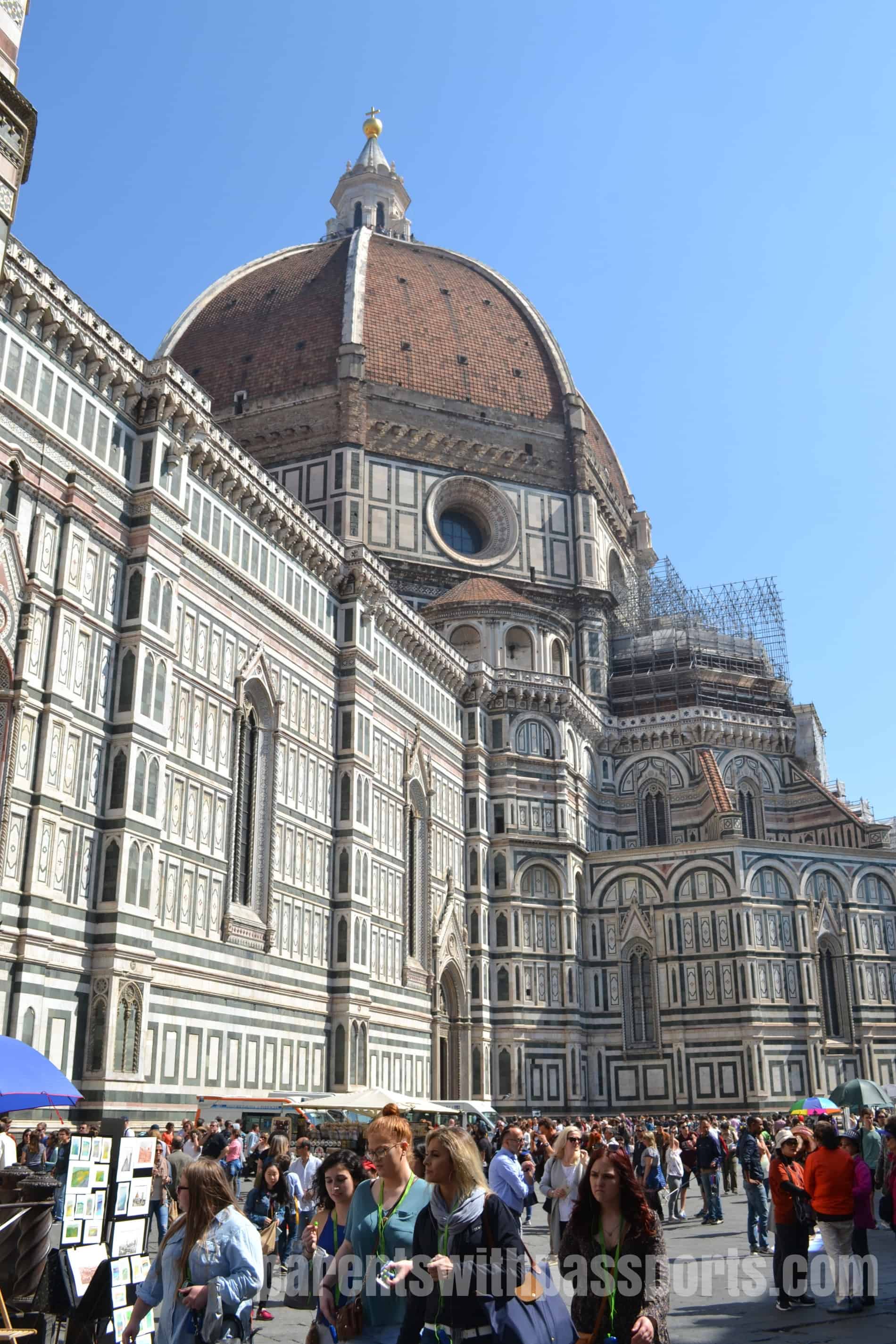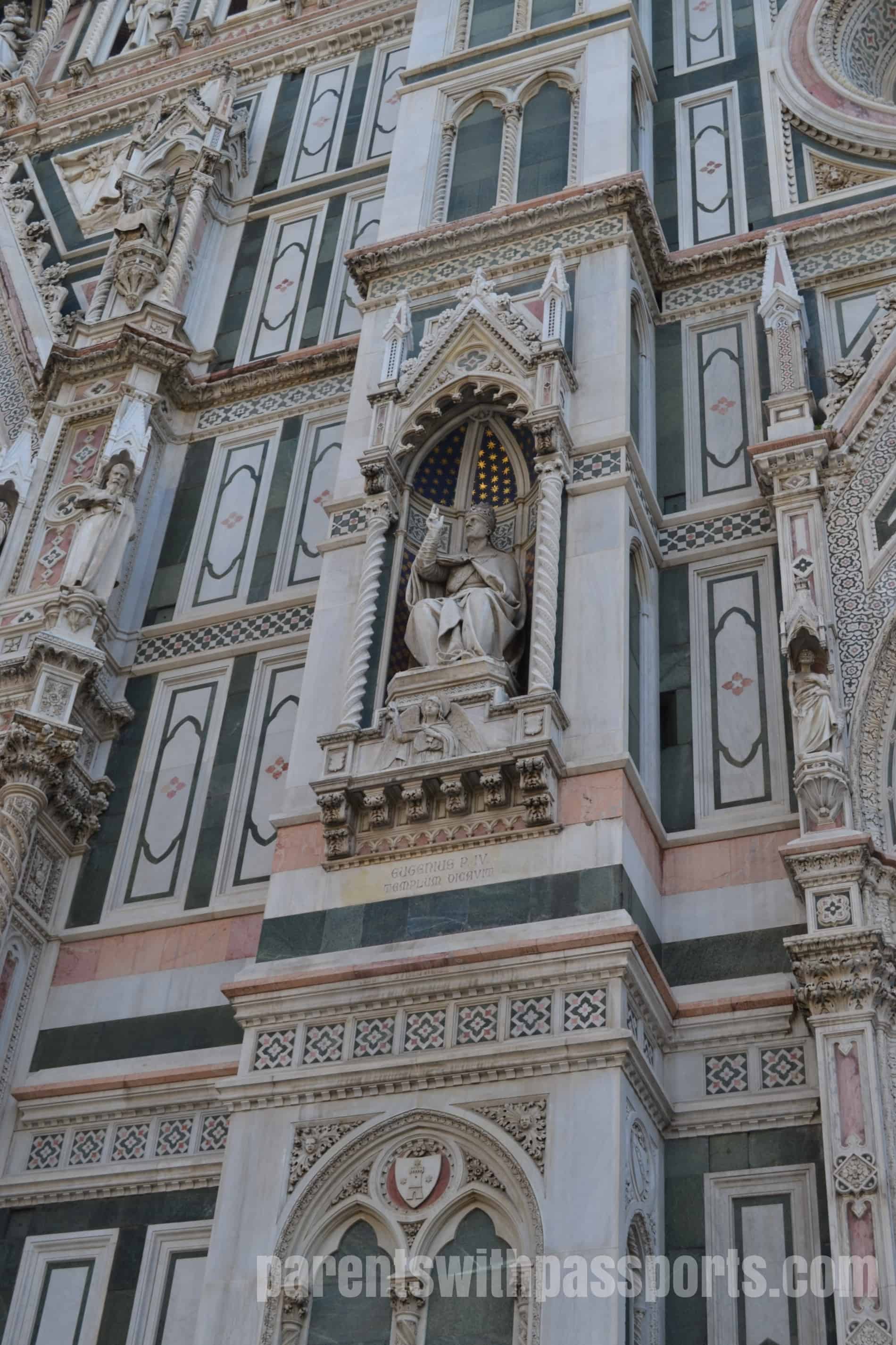 You don’t need to go into the dome to realize how impressive the cathedral is. While the dome itself is clearly an impressive architectural feat, the exterior of the cathedral cannot be overlooked. The pink, green and white marble facade is simply stunning. From the geometric pattern to the impressive bronze doors to the dozens of statues built into the facade, you could spend hours just examining the details of the outside of the building.