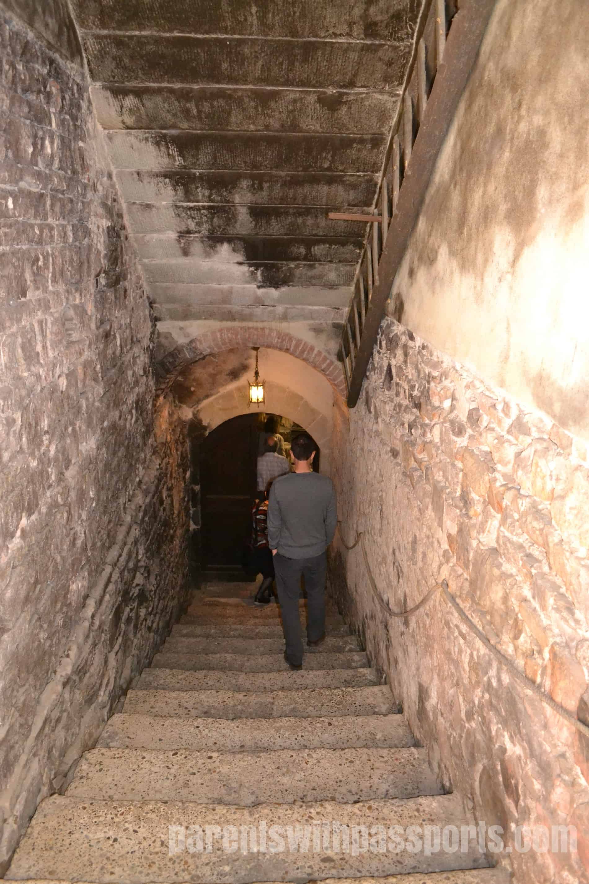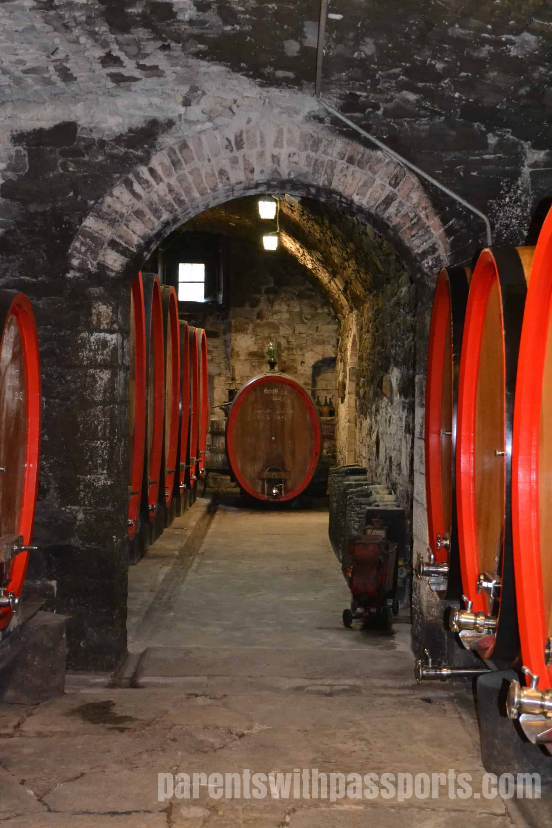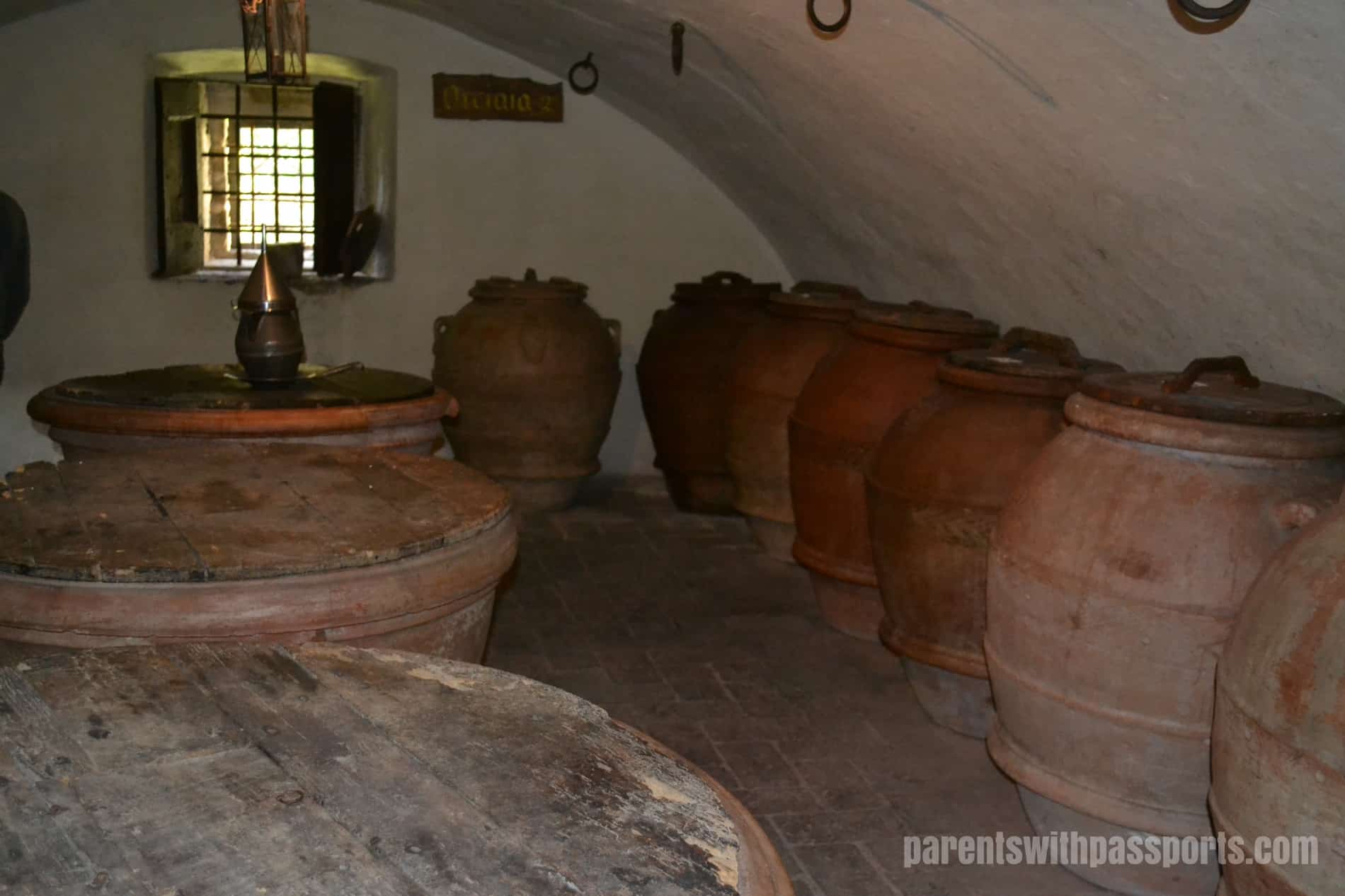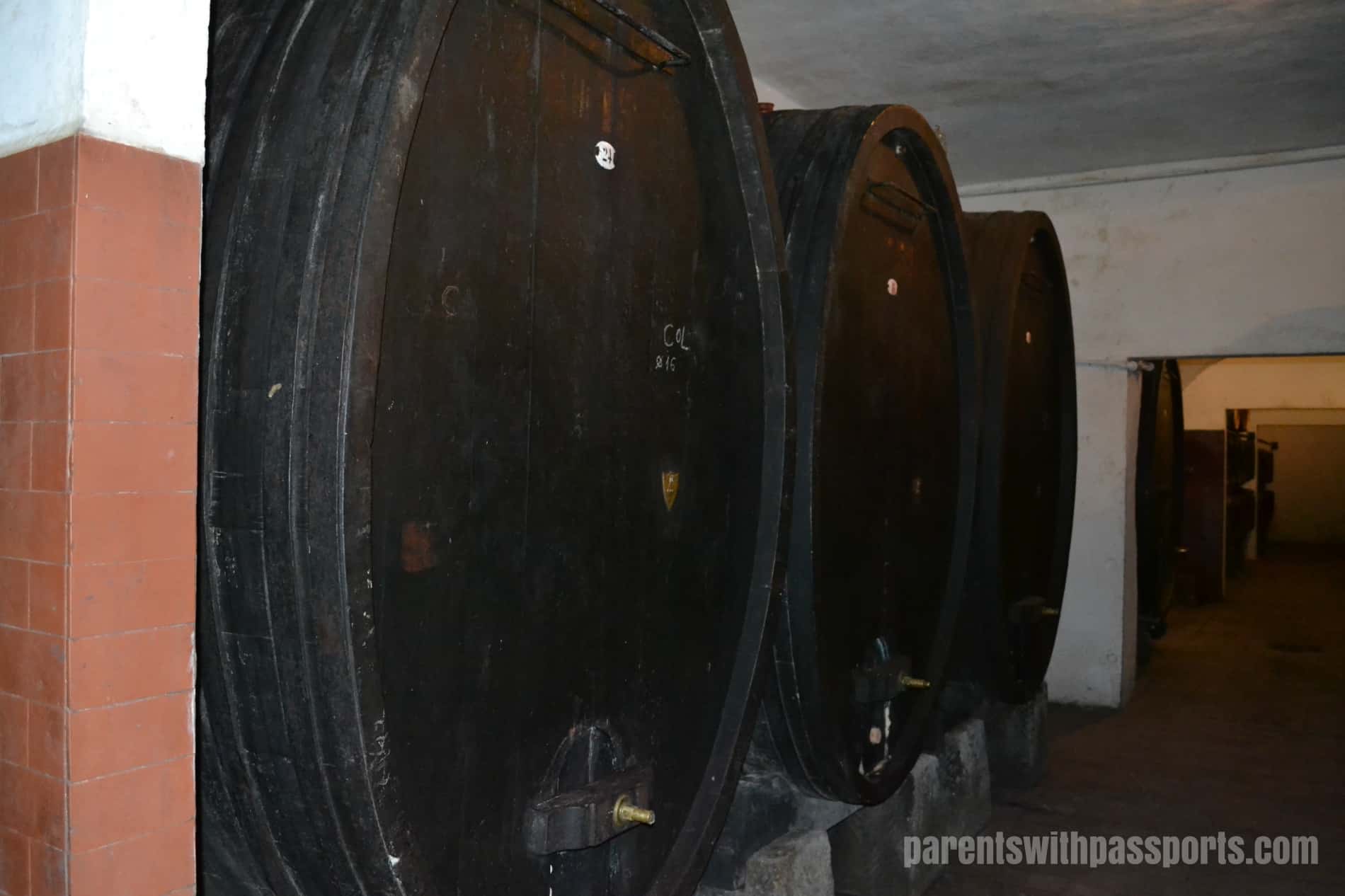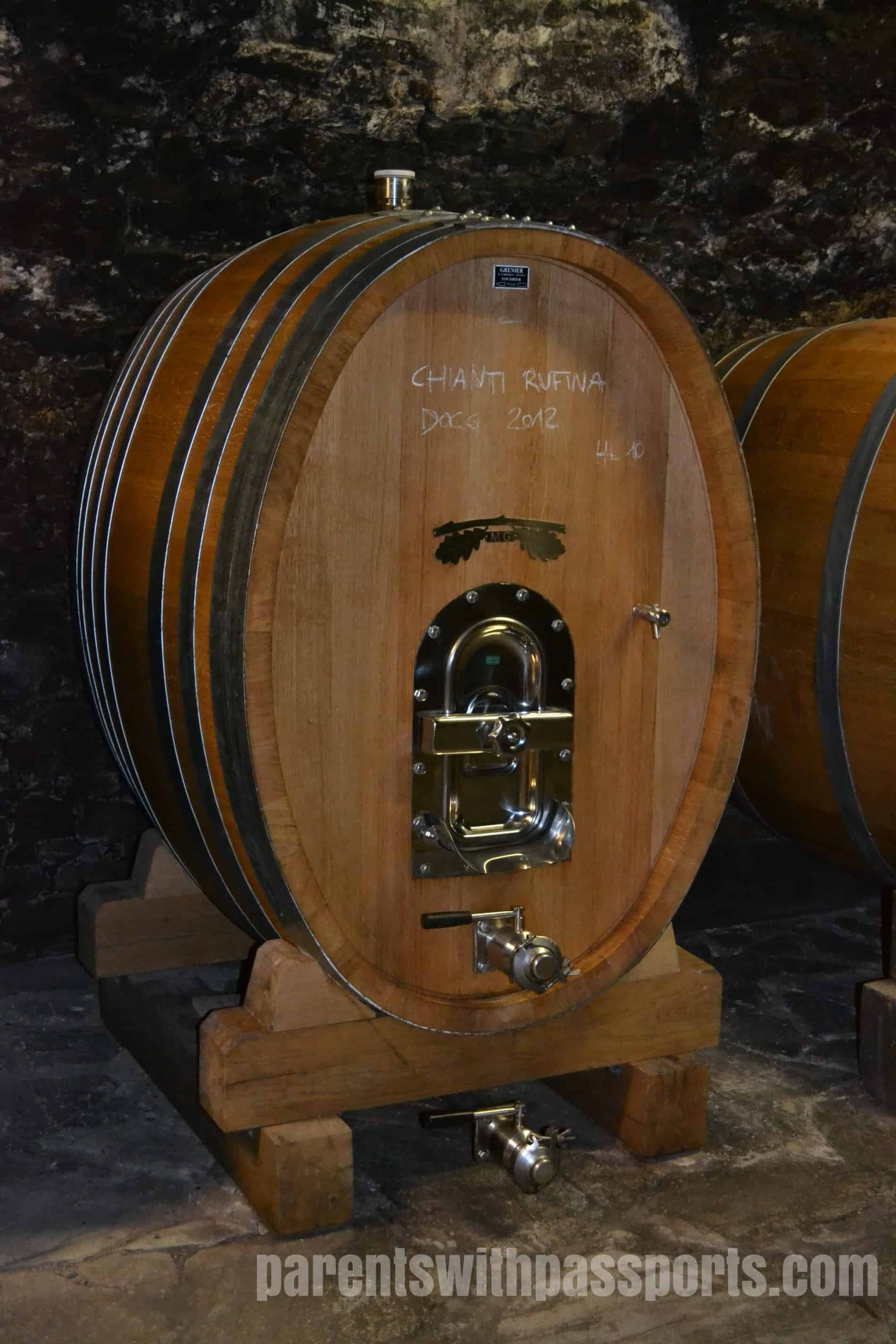 After this fascinating history lesson, we were taken down into the cellar to learn more about their wine making. This region is obviously most famous for its Chianti, which is made with at least 80% Sangiovese grapes. On the 60 hectares of vineyards on the estate, they grow Sangiovese, Merlot, Syrah, and other grape varietals. Their cellar is filled with large oak casks where the wines age. We were shocked to learn that the barrels were cleaned by hand from the inside. Someone actually climbed inside the tiny little doors to clean it, a dangerous and sometimes deadly job.