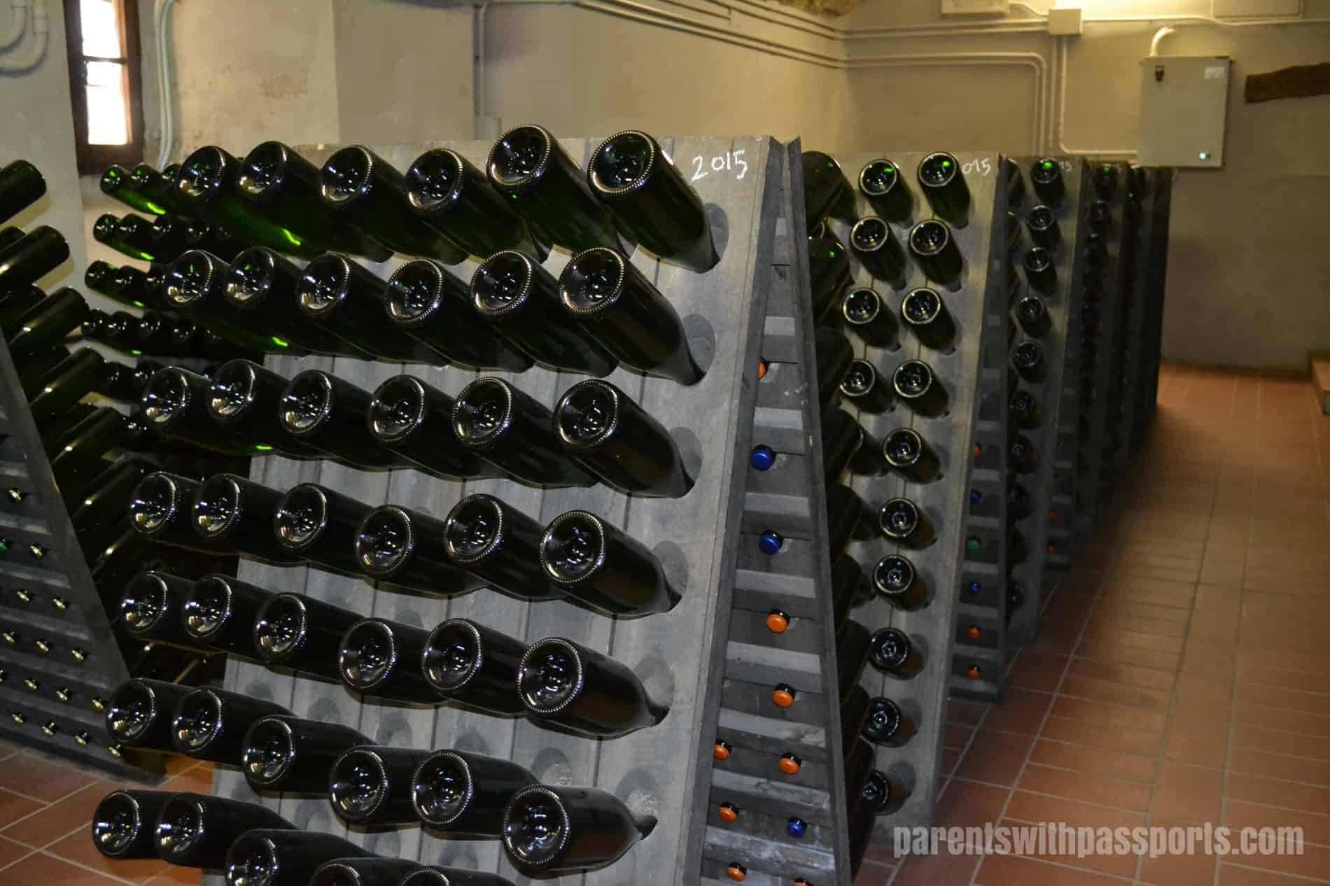 They also make olive oil and champagne on site and we saw the two storage rooms for those as well. The olives are picked, pressed, and filtered, and then stored in huge terra cotta pots. To make champagne, the wine must first lie horizontally for at least 15 months. After that period, the riddling process must be completed in order to remove the sediment that was created during the fermentation process. During this stage, the champagne is stored in a pupitre, a wooden frame drilled with 60 tapering angled holes. While stored in the pupitre, the bottles are rotated and the angle changed on a very precise schedule in order to remove the most sediment and produce a clear champagne.