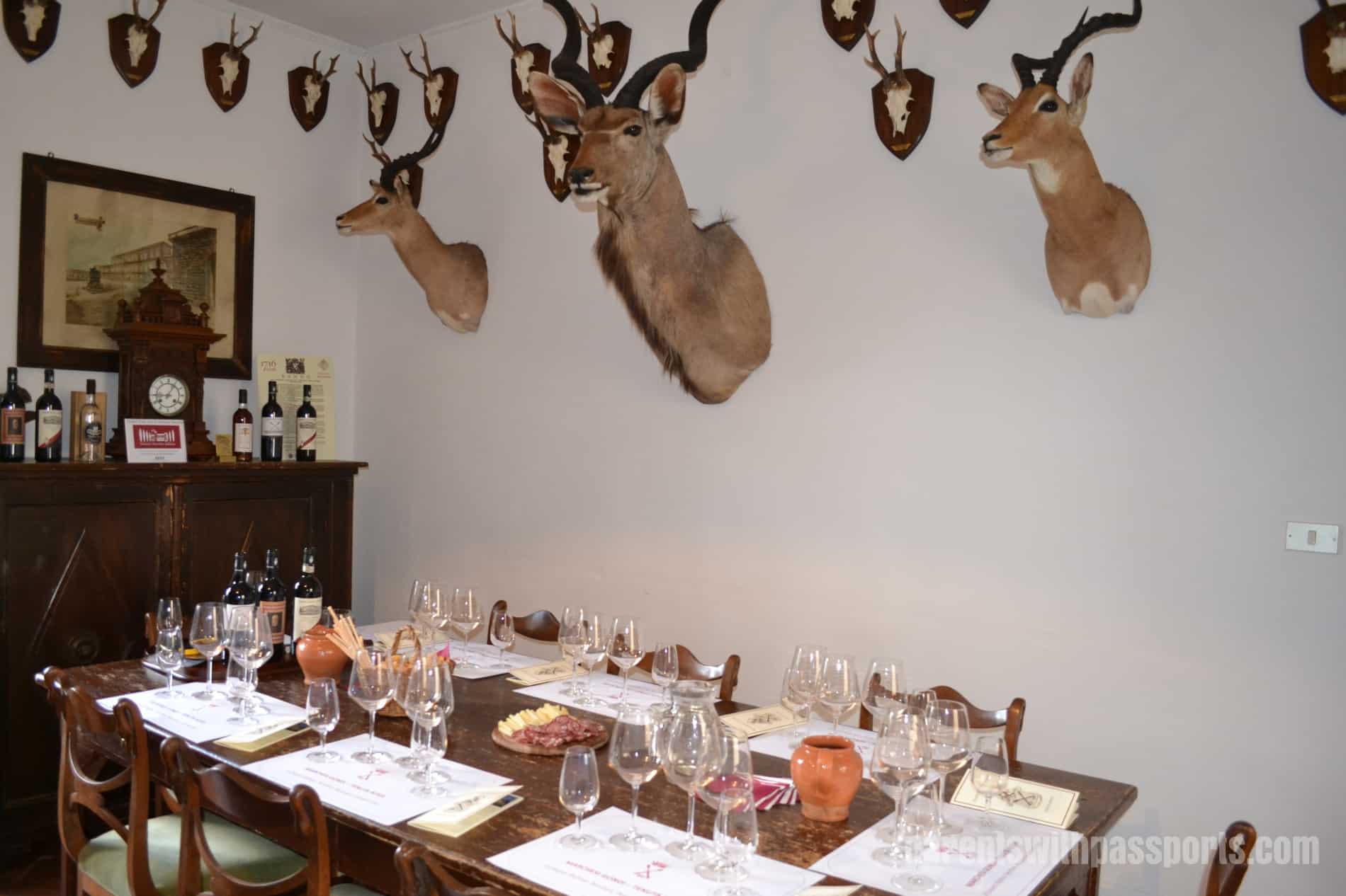 Our tour was led by Donatella and she gave a wonderful history of the estate, including the fact that it was “a little bit bombed” during World War II. We visited the cellar to see where they stored their wine and olive oil before heading for a tasting. We were slightly surprised to find the tasting room walls covered with not just deer heads but mounted wild boar skeletons. Apparently they are hunted on the grounds quite regularly. We enjoyed 5 different wines, as well as a few olive oils, and ordered several bottles of each to take with us. It was a wonderful end to a fabulous day.