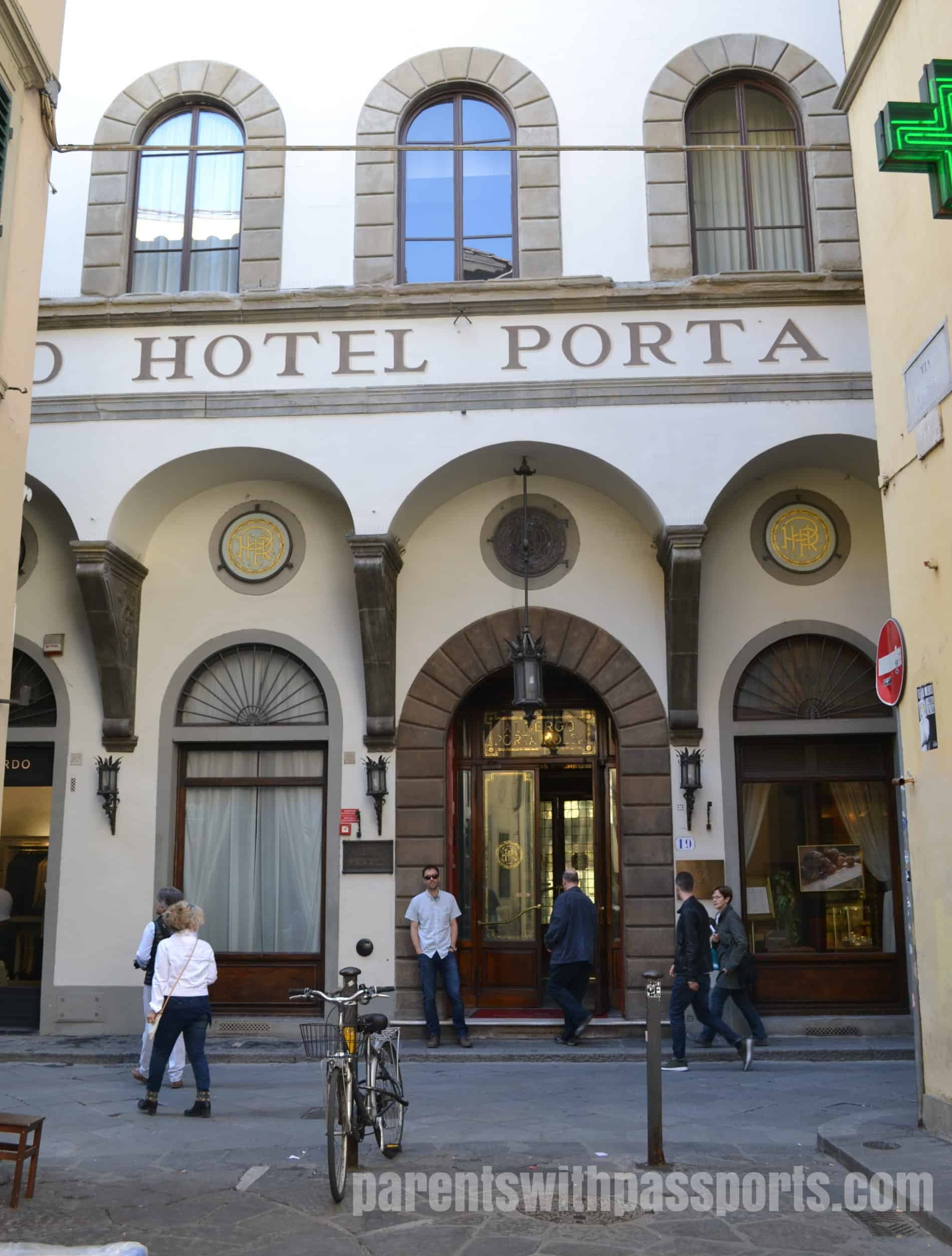 Hotel Porta Rossa is an NH Collection hotel and claims to be the oldest hotel in Italy. It is located on a narrow street in Florence, close to the Uffizi Gallery and a short walk away from the Duomo and other sites. The historic building has modern updates but retains its charm.
