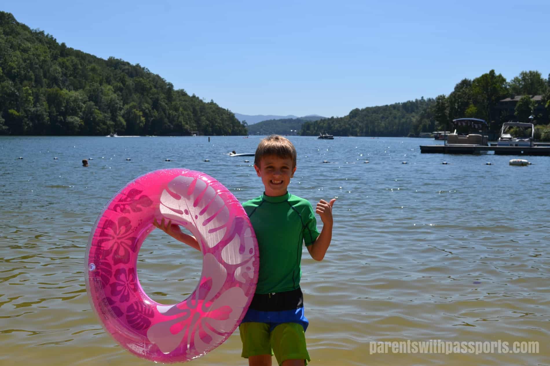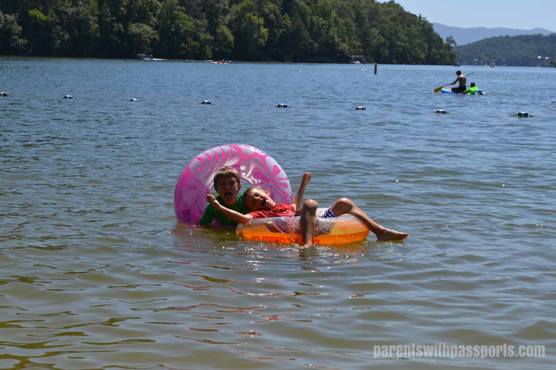 When you’ve had your fill of the pool, the lake is just steps away.  The kids played in the sand on the beach, swam in the lake, and used their inner tubes to laze around in the water.  With the lake spread before you and the mountains in the background, the beach at Rumbling Bald is a great place to relax and just soak in the scenery while the kids play.