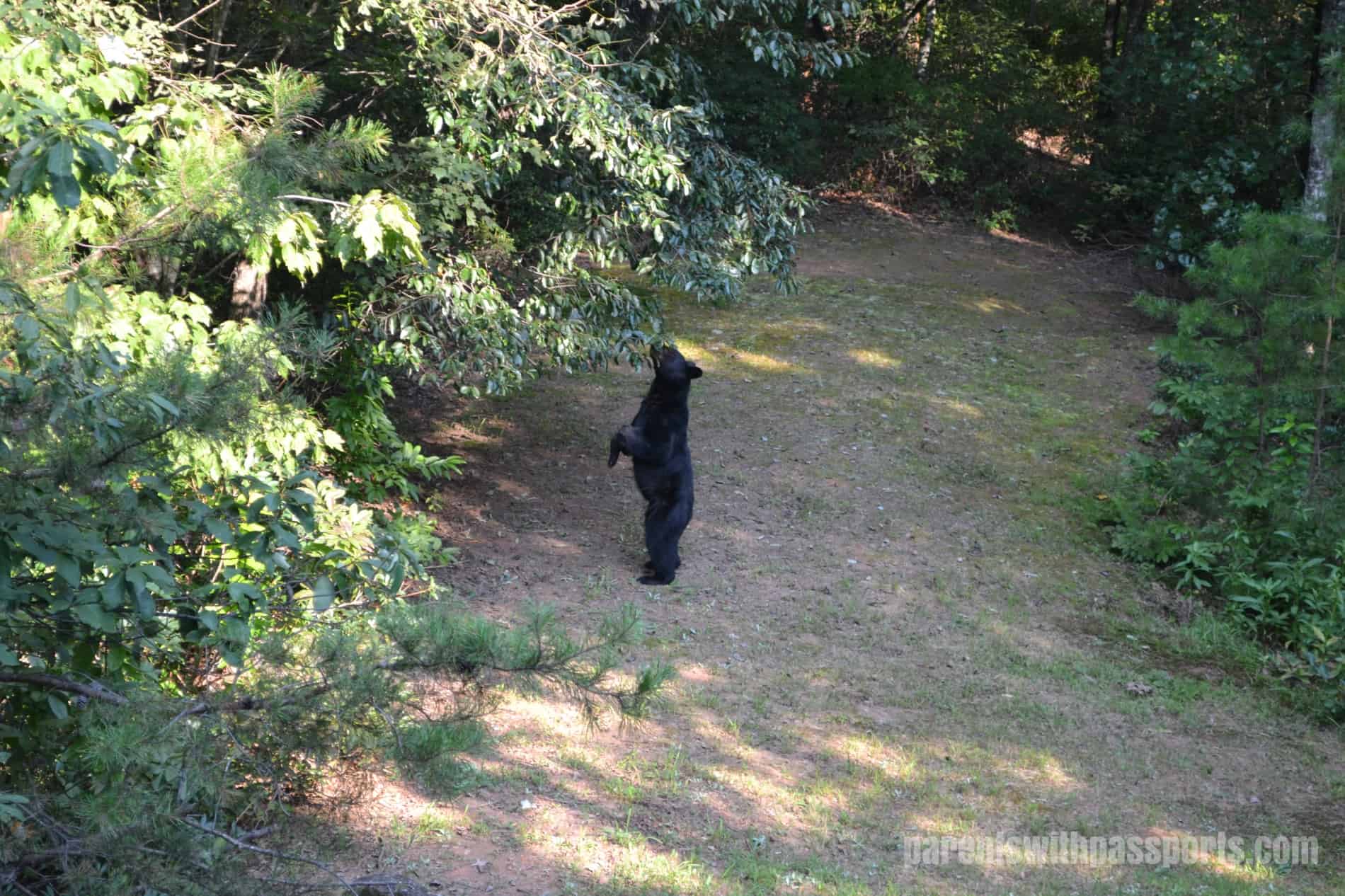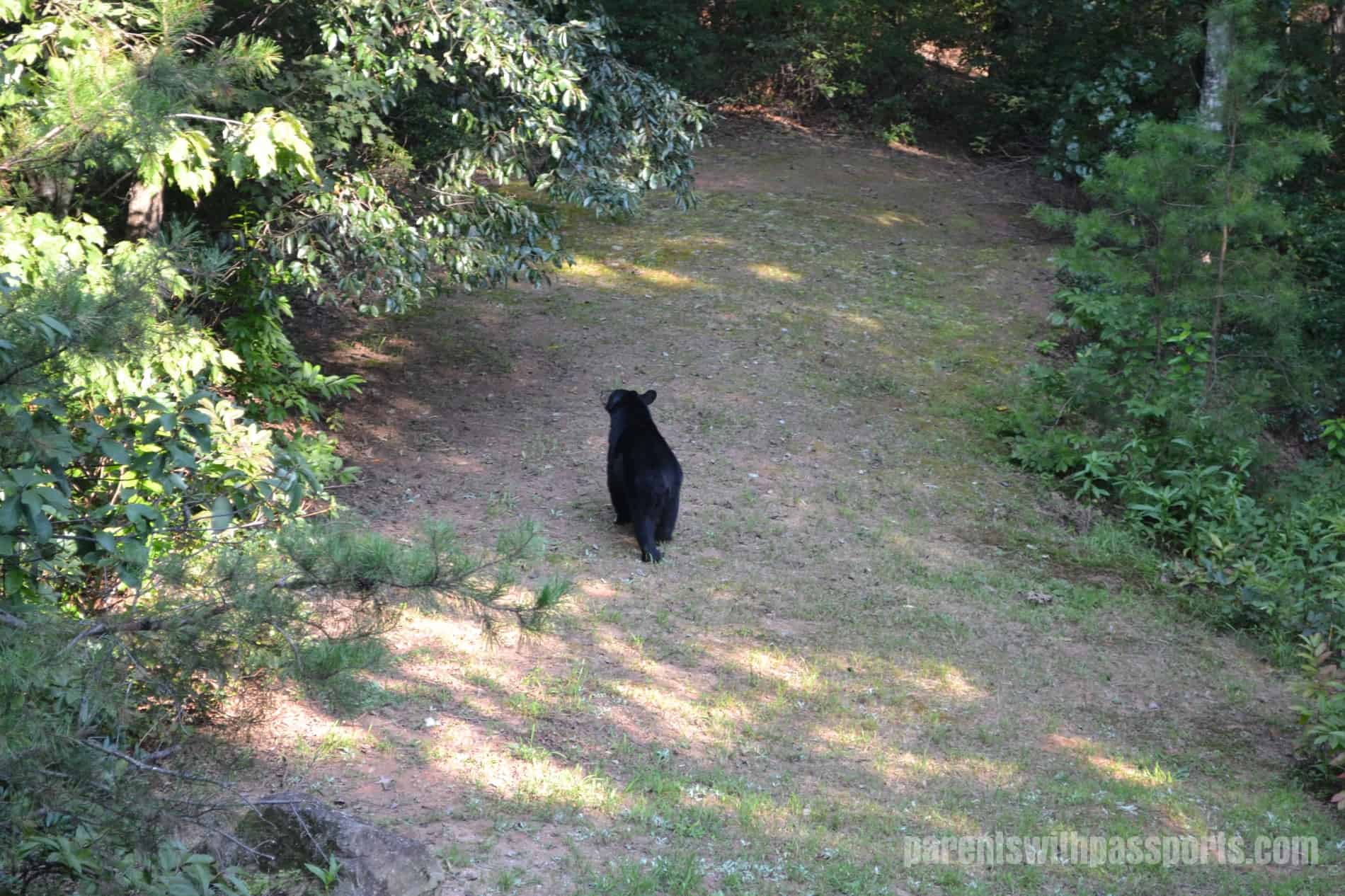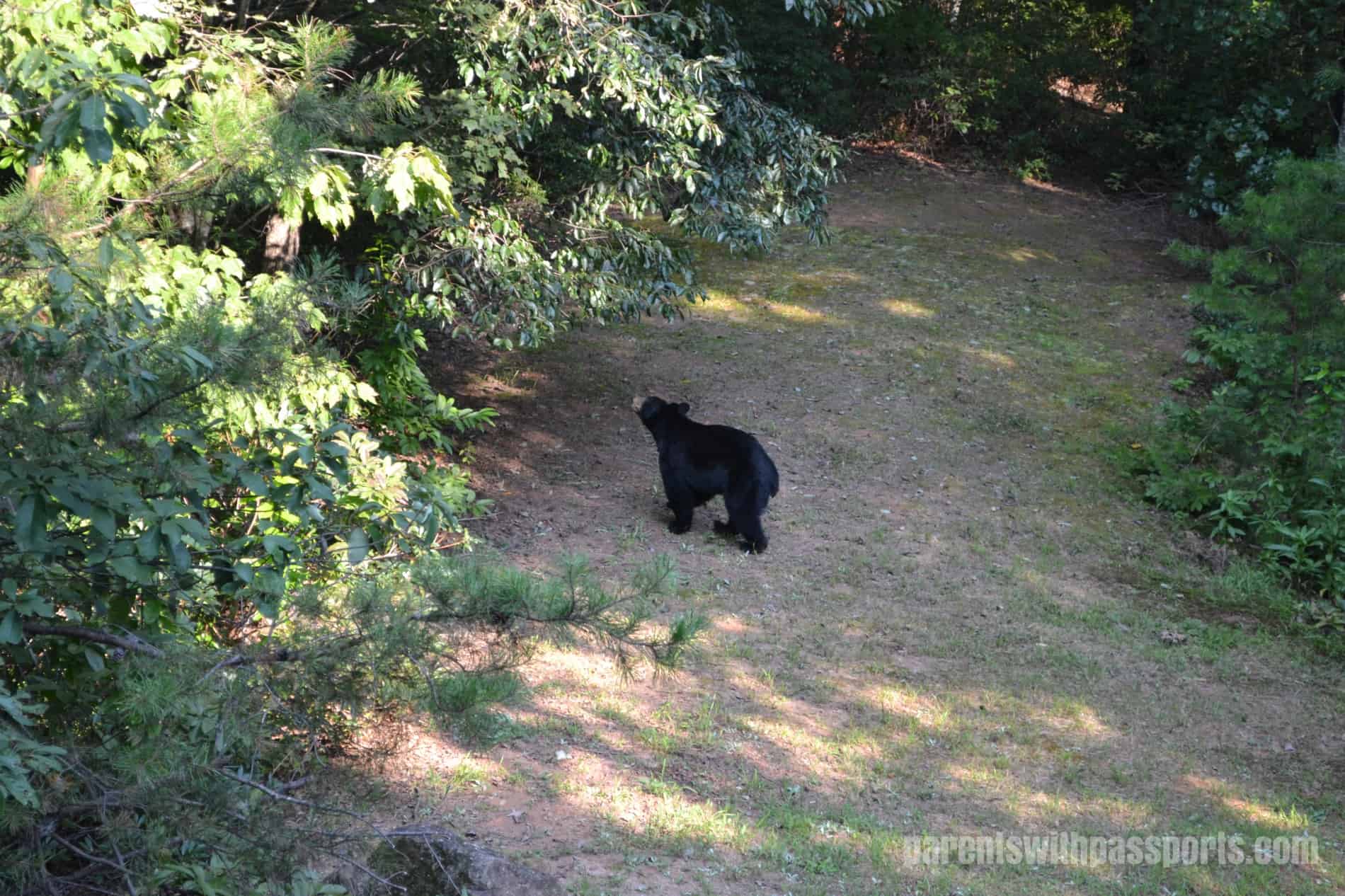 Late in the afternoon one day, we were relaxing in the living room of our cabin when one of our friends went to the car to get something.  A minute later, he came running back with a look of fear on his face and fumbled at the door to get back in, yell/whispering “there’s a bear!”.  Since we had been joking about it all weekend, we were sure he was pulling our leg but when we stepped back out on the deck, there he was.
