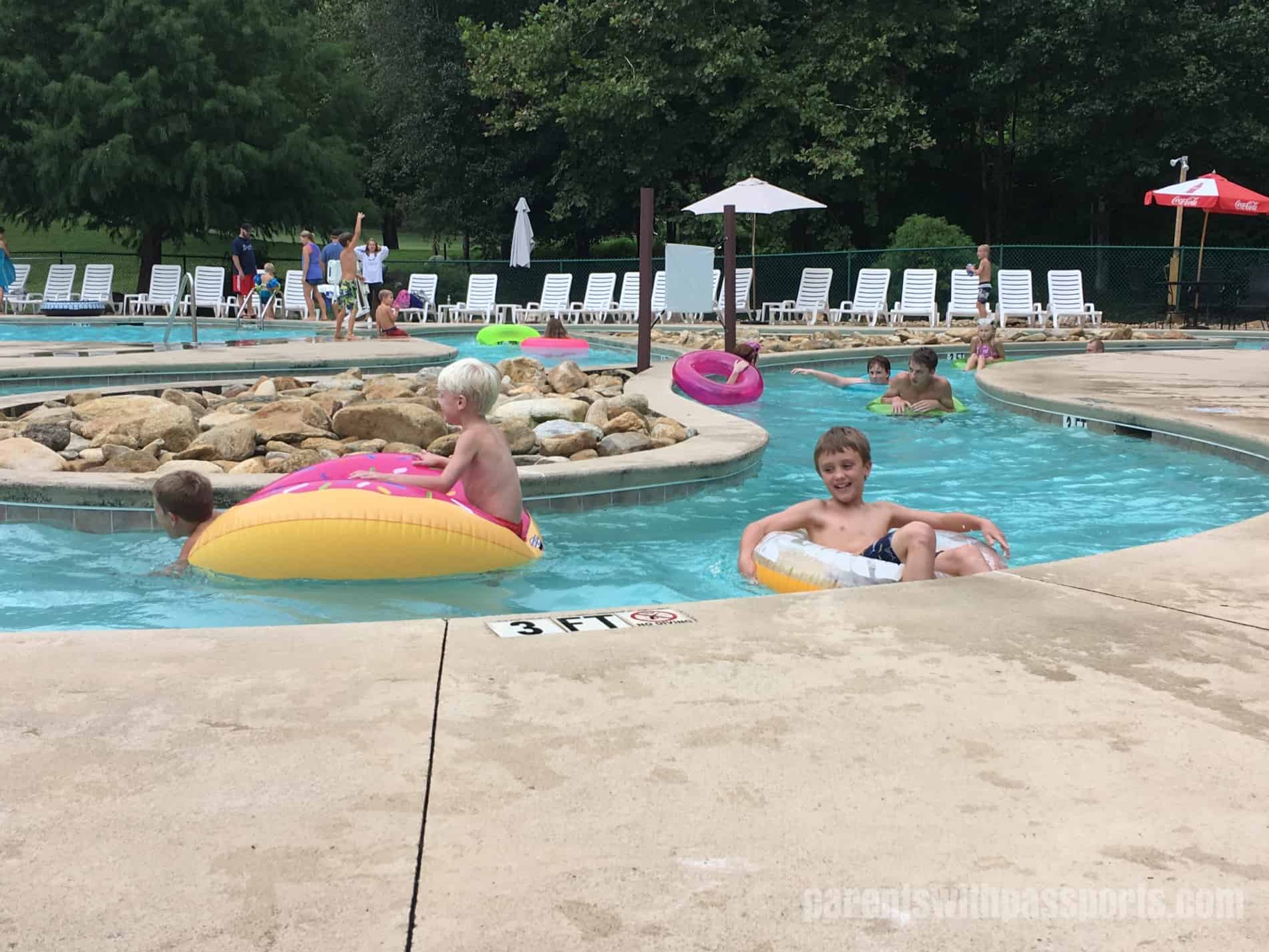 The resort has a single pool area with two separate pools and a lazy river.  One of the pools is a traditional rectangular pool with lap lanes available for fitness swimming and a removable volleyball net.  The other pool, known as the Trout Stream Pool, is ideal for kids.  A zero-entry swimming pool, it allows small kids to sit and splash in the water or cool down under the mushroom waterfalls.  The lazy river isn’t especially long but still entertained the boys for hours.  You cannot be in the lazy river without an inner tube – you can bring your own from home or purchase one from the concession stand.