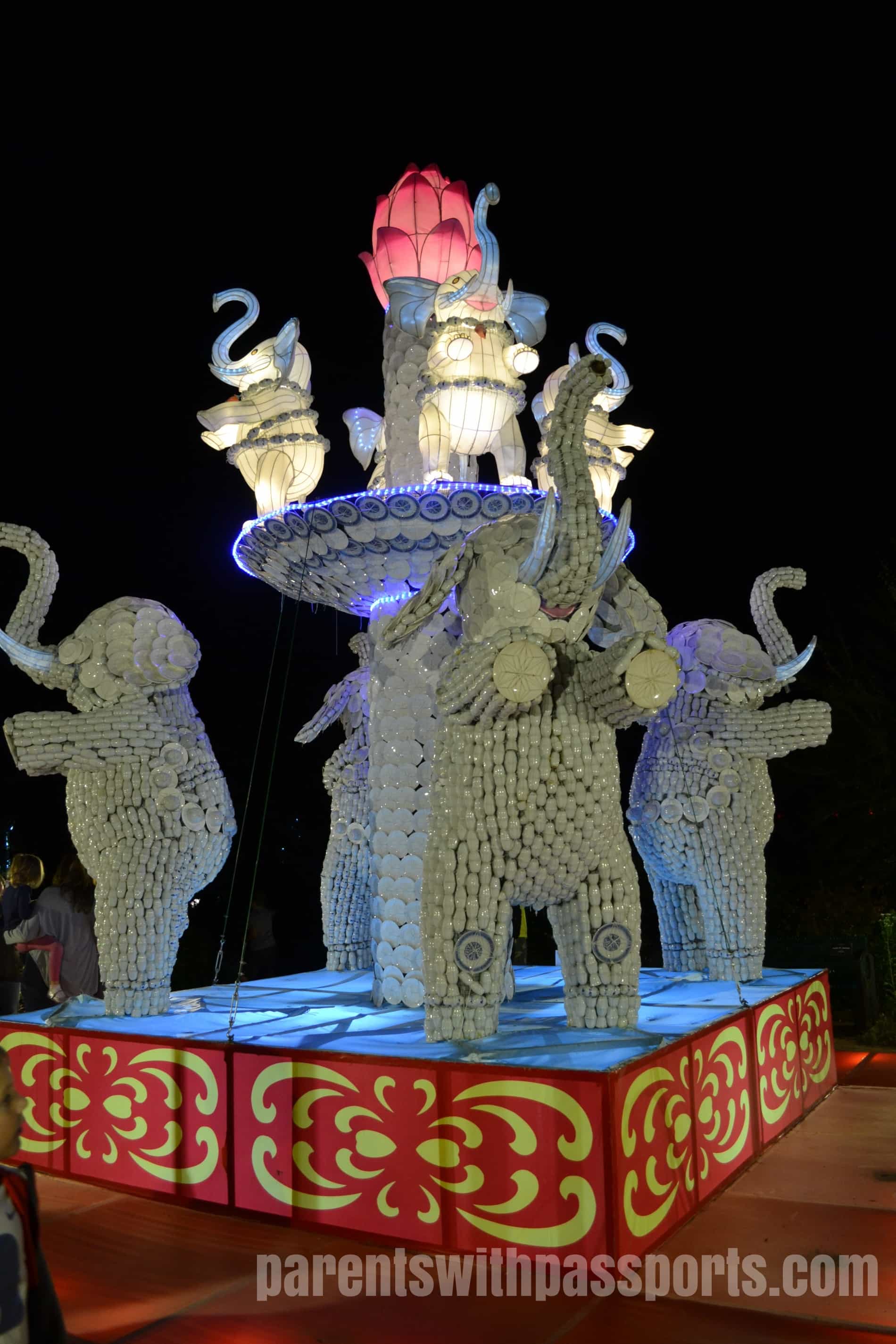 There were many other traditional lantern displays, including bugs, panda bears, dinosaurs, and more. But there were also two unique displays that were just as eye catching. The peacock in the center below is made of small glass medicine bottles filled with colored liquid. And the elephant display pictured below that is made entirely of ceramic plates and tea cups.