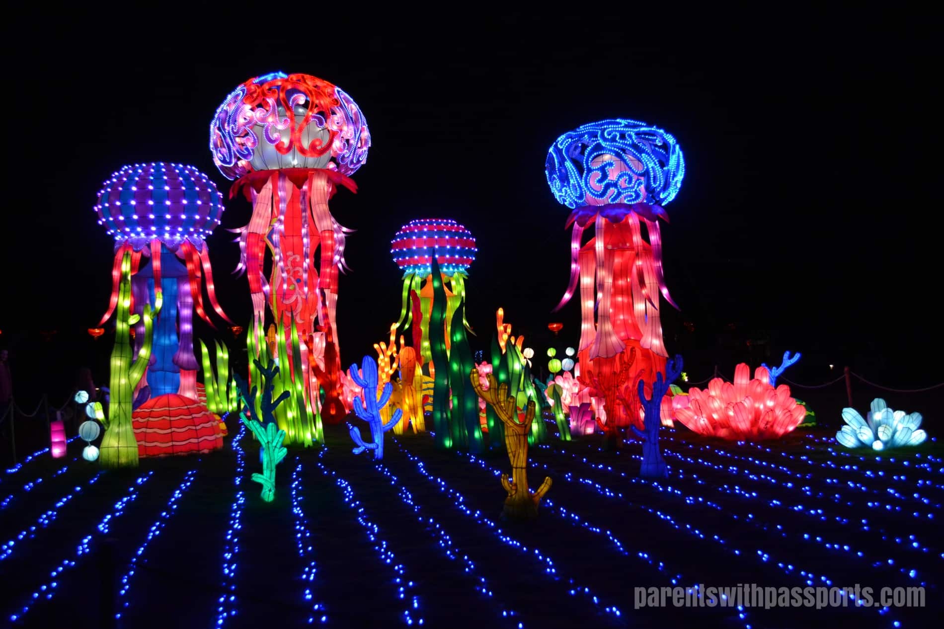 Immediately behind the Visitor Pavilion, the grassy area of the Four Seasons Garden was overtaken by jellyfish. The colors were amazing and we were instantly memorized by the whole display. The jellyfish stood probably 30 feet tall and beautiful corals sprang from the land underneath them. Viewed from the side, blue lights gave the illusion of water. It was a stunning display and we hadn’t even entered the main part of the gardens yet.