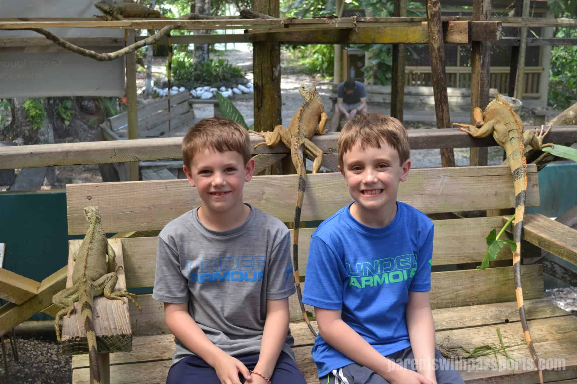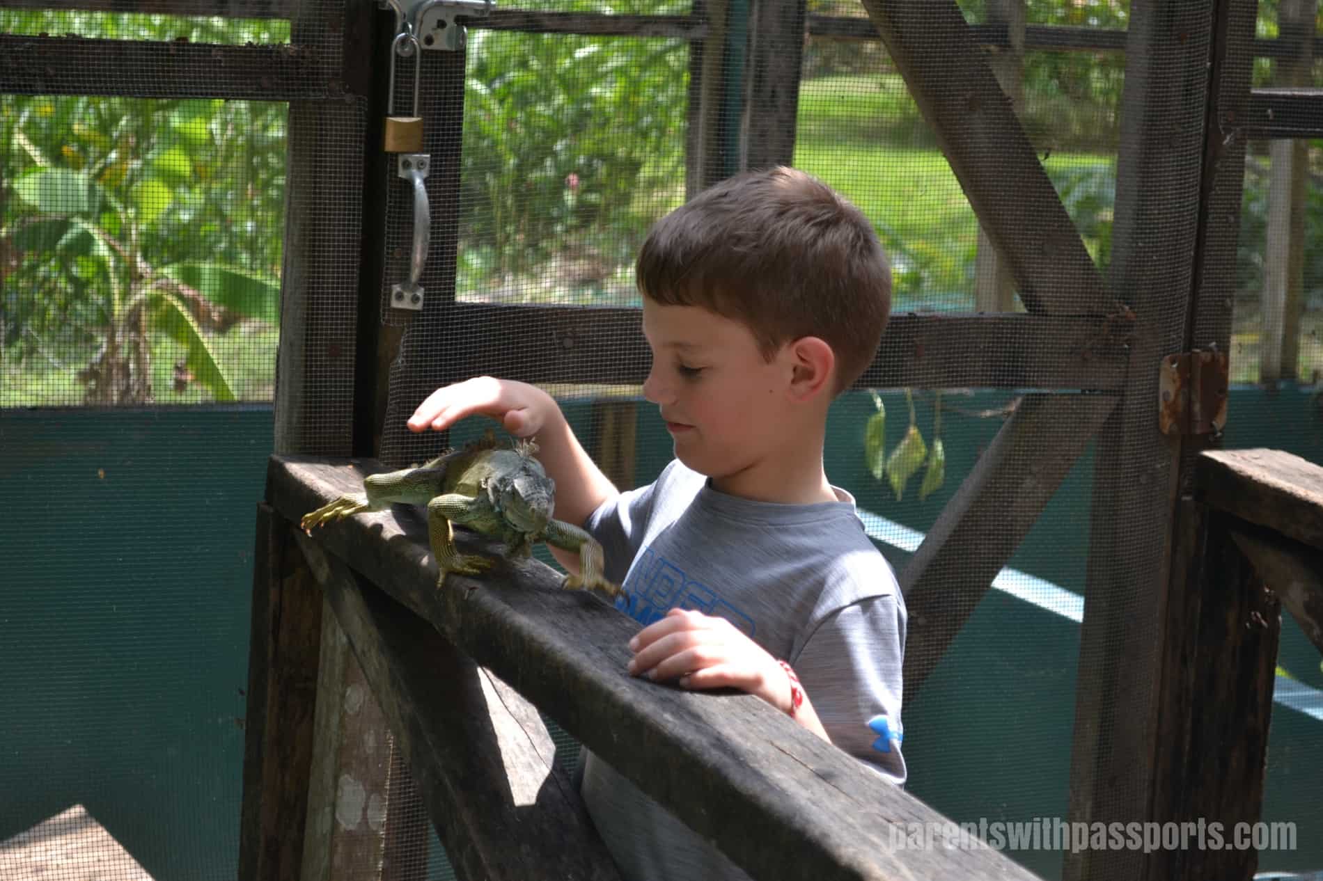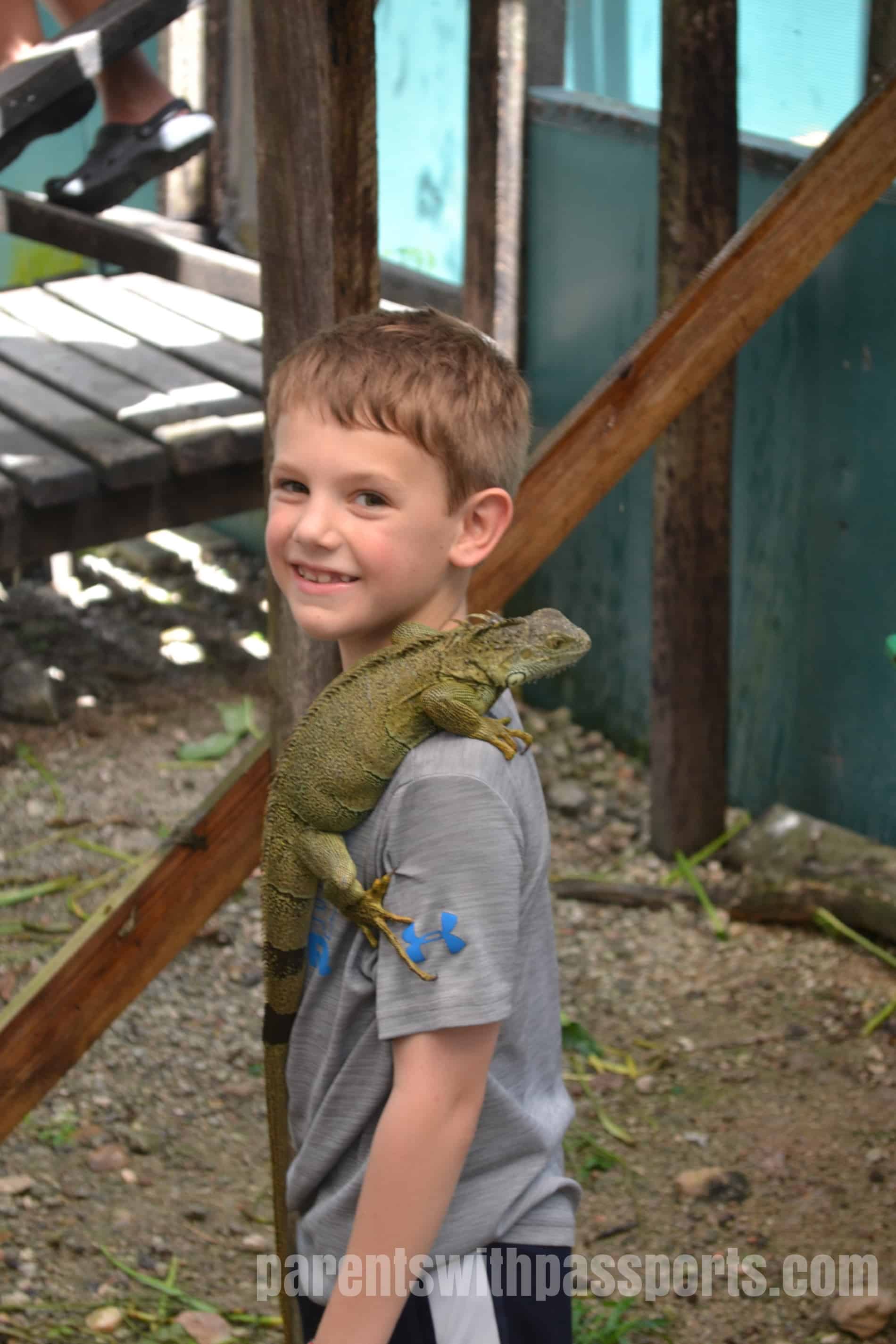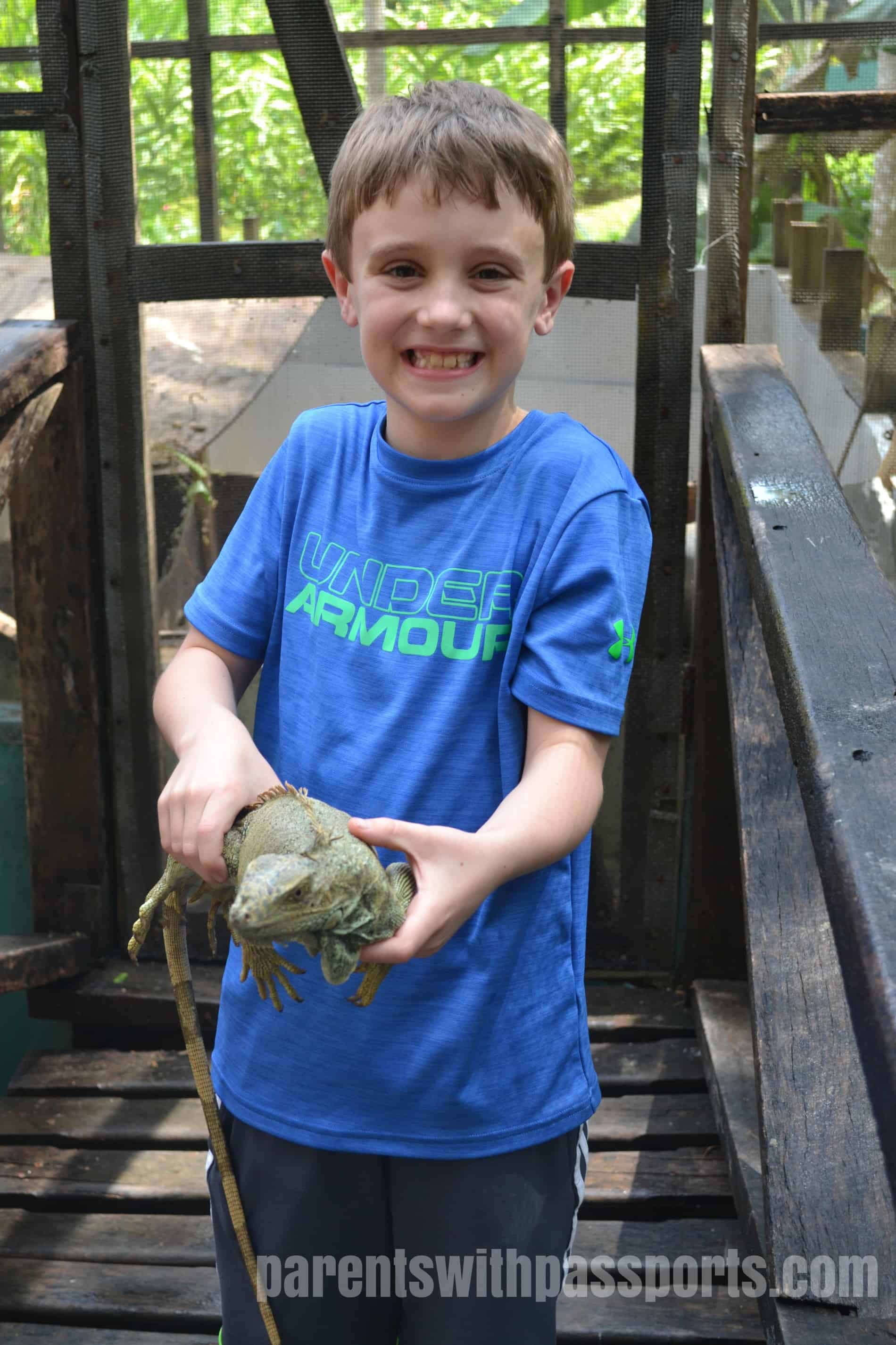 The iguanas seemed perfectly content to be held, but their nails were super long and sharp and both boys came away with claw marks all over their arms and snags in their shirts.  The boys eventually got the hang of picking the iguanas up themselves but learned quickly that if you get too close to a railing or branch, the iguanas think the ride is over and scurry off of you and onto the railing.  But they had plenty of time to watch them, feed them and hold them.