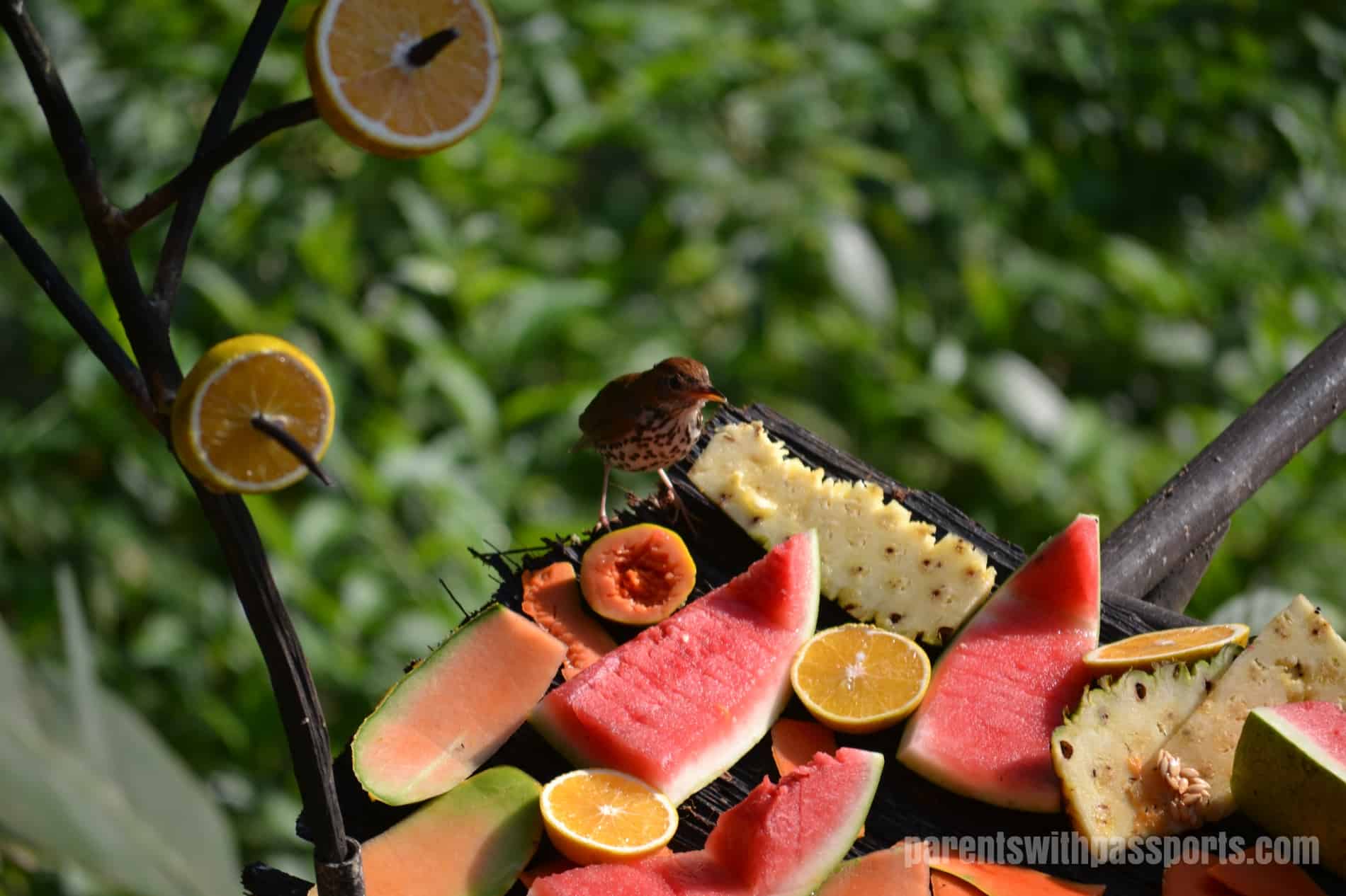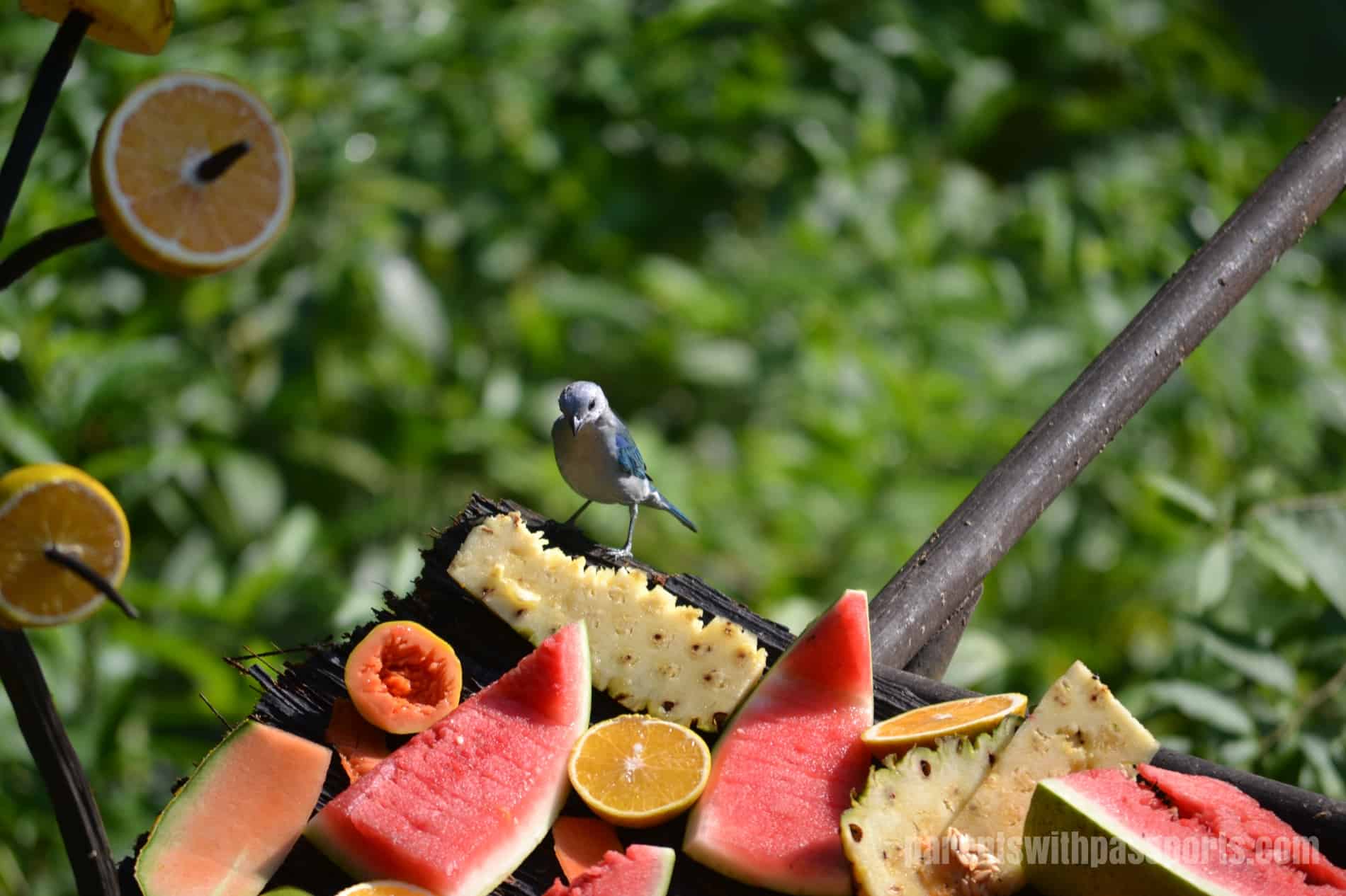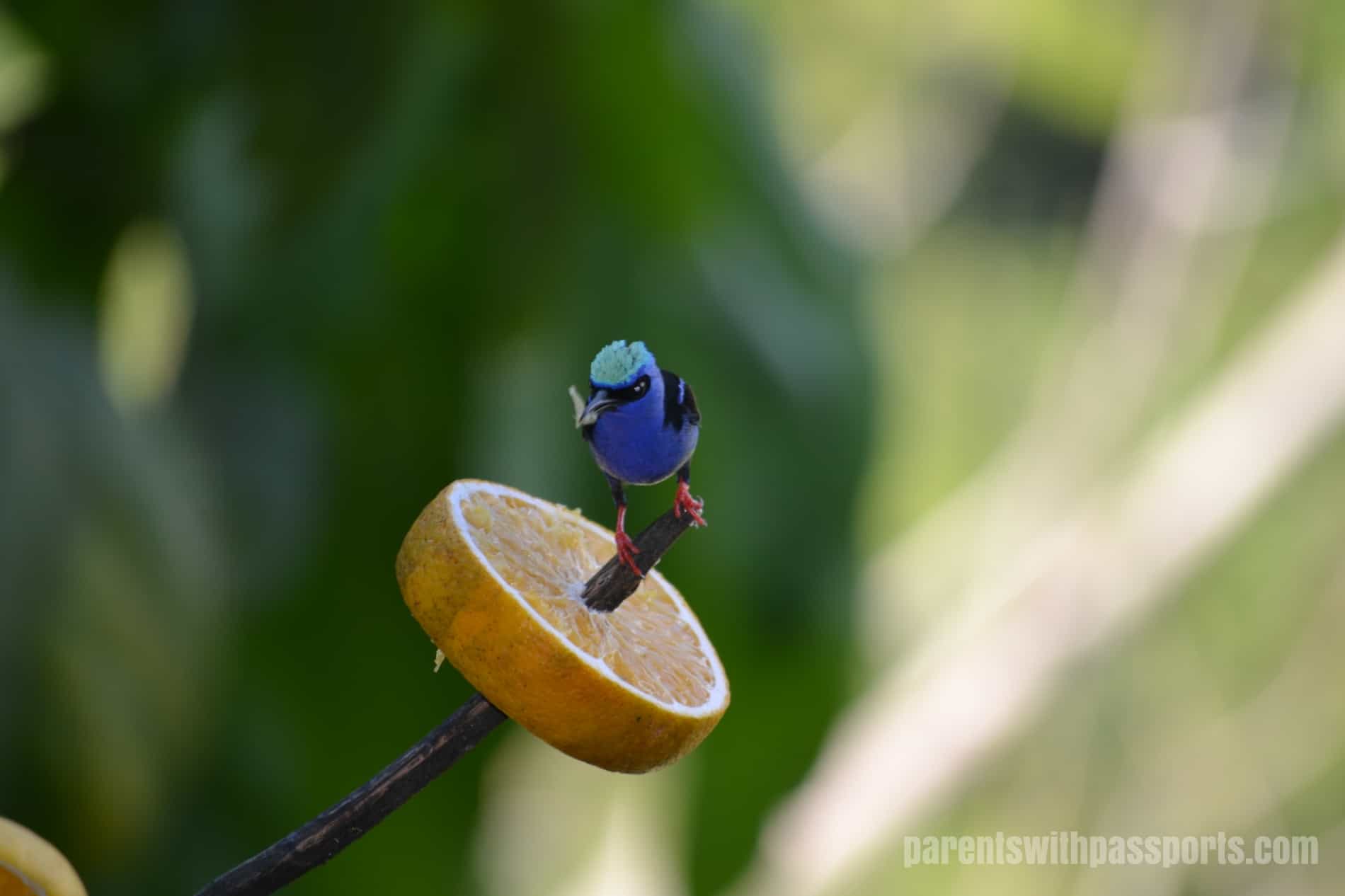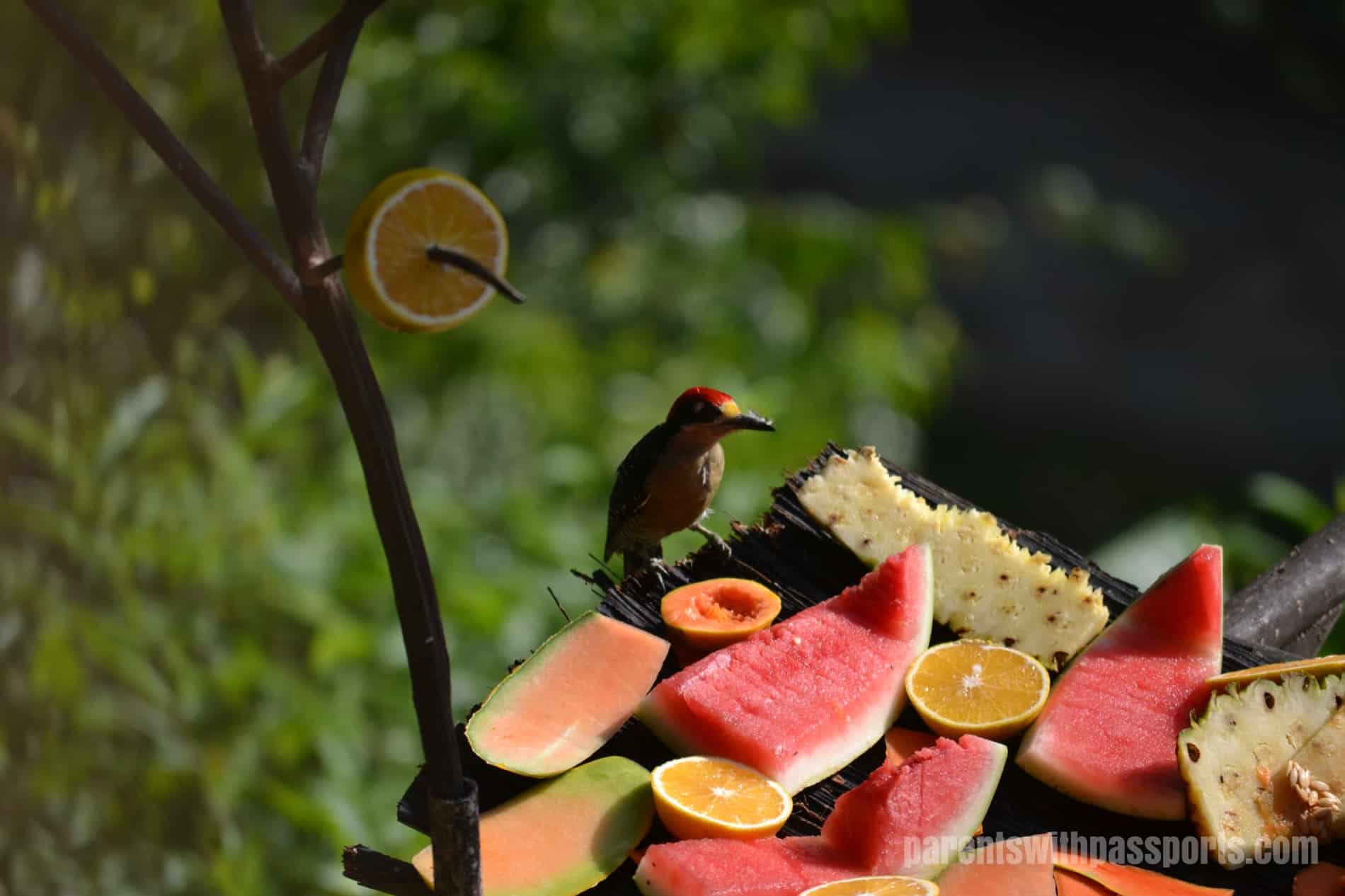 If you are not an avid birder, you can take the more passive approach to bird-watching like we did. The lodge had two high-powered telescopes set up to watch a toucan’s nest across the river. Once we caught them leaving their nest and watched them fly across the river right towards us. The lodge also has a fabulous bird feeder set up below the restaurant and we sat and watched the colorful birds feed from the fruit all day long.
