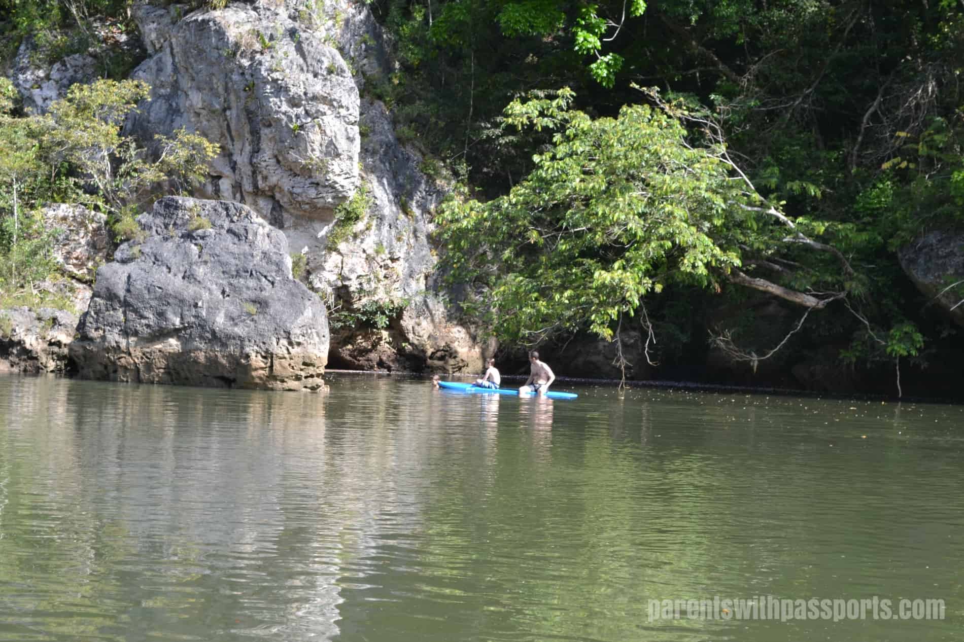 JB preferred the more laid back approach. He loved just swimming around in the river and paddling on the SUP board (although never actually standing up). He and Blair paddled over and explored a little cave behind the rocks on the other side of the river and saw bats and some cool birds.