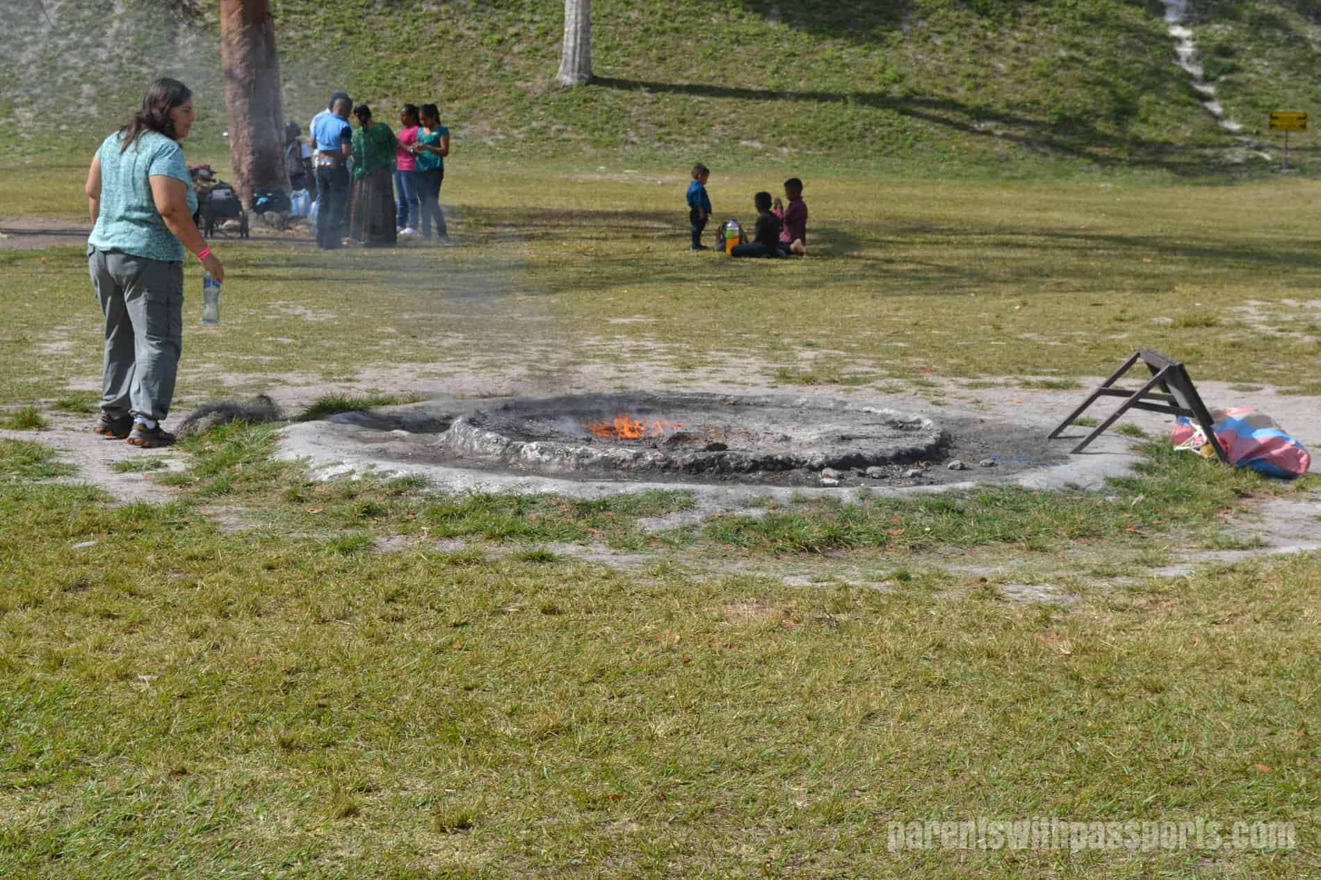 When we passed through the Great Plaza earlier, we had seen a group of Mayans preparing for a ceremony. Present-day Mayans retain rights to hold ceremonial celebrations in Tikal, and it was Easter Sunday. From the top of Temple IV, we could see the smoke rising from between Temples I and II as their celebration got underway. When we headed back through the Great Plaza on our way of the park, the people had mostly cleared out but we could see the still smoldering fire.