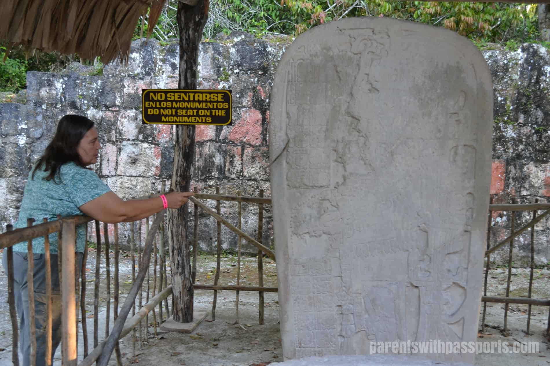 Roxy showed us the stela and altar that were housed in the north building. The stela features Yax Nuun Ayiin II (also known as Chitam), the last known ruler of Tikal, while the altar depicts captives of war with their hands tied. Roxy did a great job explaining the drawings to the kids and pointing out the different features so that they could really make out the scene depicted.