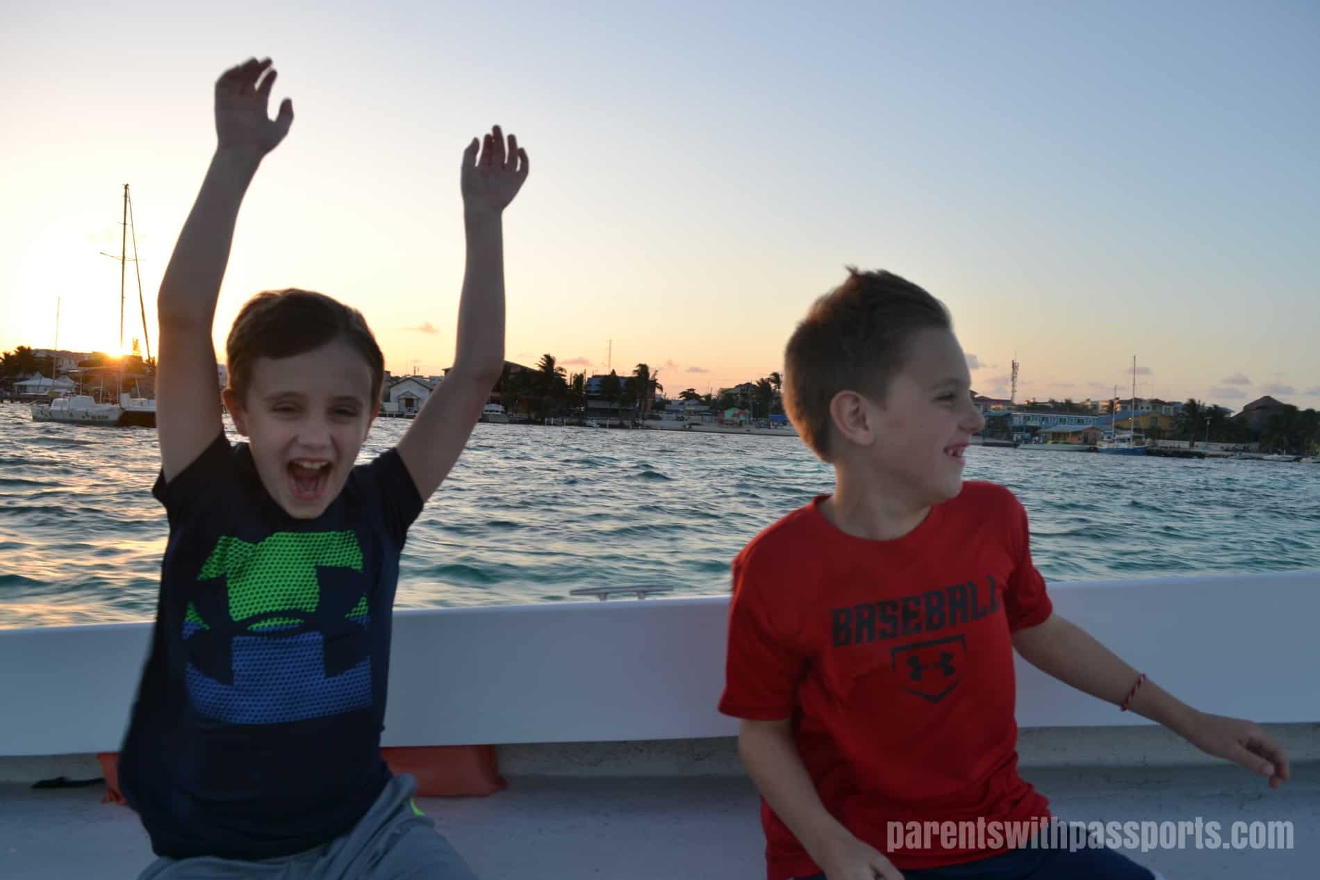 So we got into the boat and as soon as it got out of the harbor and picked up some speed, the boys were ecstatic. It was super windy and fairly bouncy, but they could not have enjoyed the ride more. Watching them laugh as they bounced around on the boat, all the stress of the travel day finally seemed to melt away for me. We had gotten up at 5am, taken a 4 hour tour of Tikal, had a 6+ hour drive from Tikal to Belize City, had our van break down at the side of the road in Belize, taken a tiny airplane with an unplanned stop at another airport, waited 20 minutes for a van to drive us 3 minutes away, and then waited 45 minutes to get on this boat. And we hadn’t eaten anything but snacks since our 5:30 am breakfast. But seeing their faces made it all worth it. Pure bliss. Plus we got to see an amazing sunset over the island.