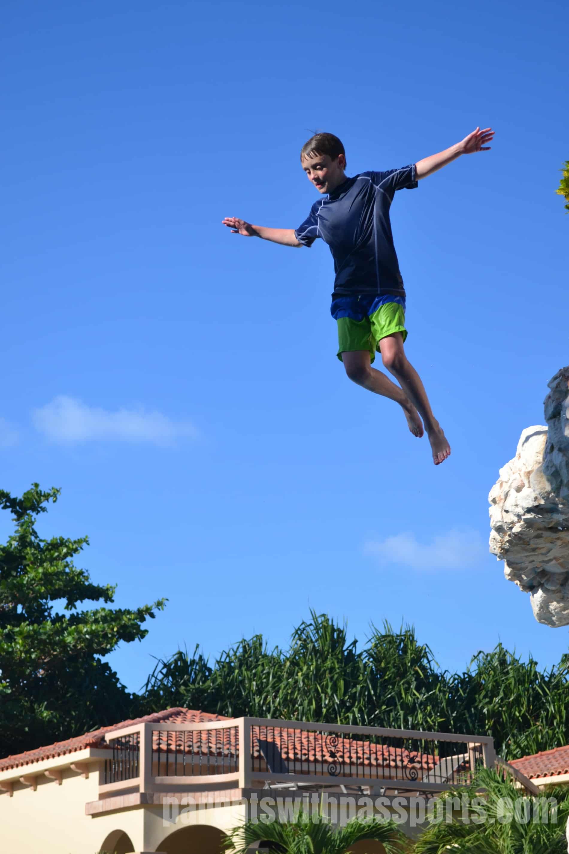 I have to admit that the jump didn’t feel entirely safe to me. There was no platform or designated spot to jump off of. Kids just climbed up to the top level, found a place on the rocks where they could get a foothold, and jumped. The water was plenty deep but the launching point seemed like an accident waiting to happen. We told the boys which sections were ok to jump off of (some kids were doing crazy things like jumping off an inner wall or doing backflips off the highest point) and just made sure they were really careful about their footing. We never saw any issues but definitely held our breath once or twice watching some other kids.