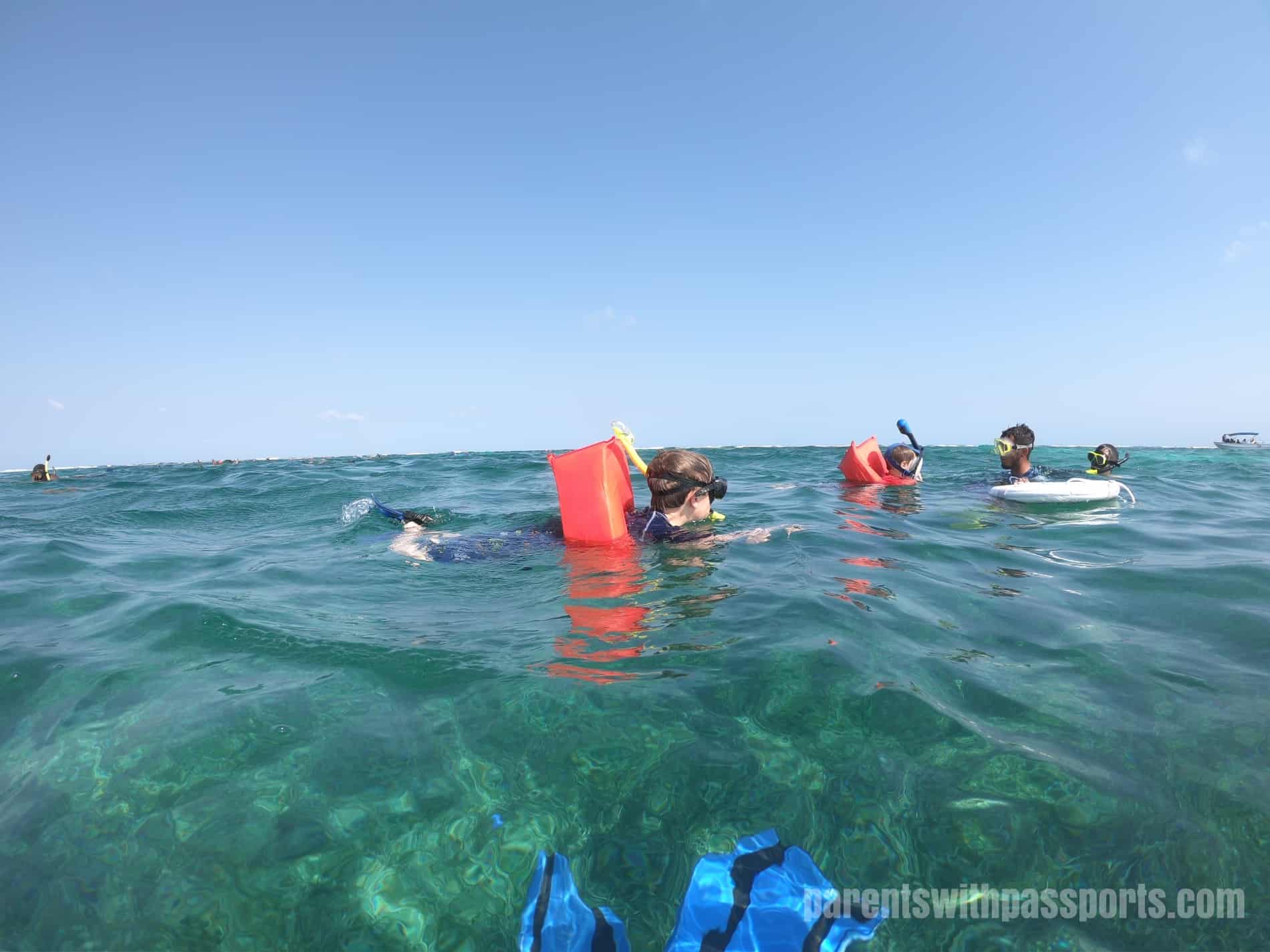 Our guide, Edward, gave us some history of the reef and instructions for snorkeling.  He helped us get our gear on and get into the water.  The boys used life preservers across their bellies so they could focus on snorkeling without worrying so much about swimming.
