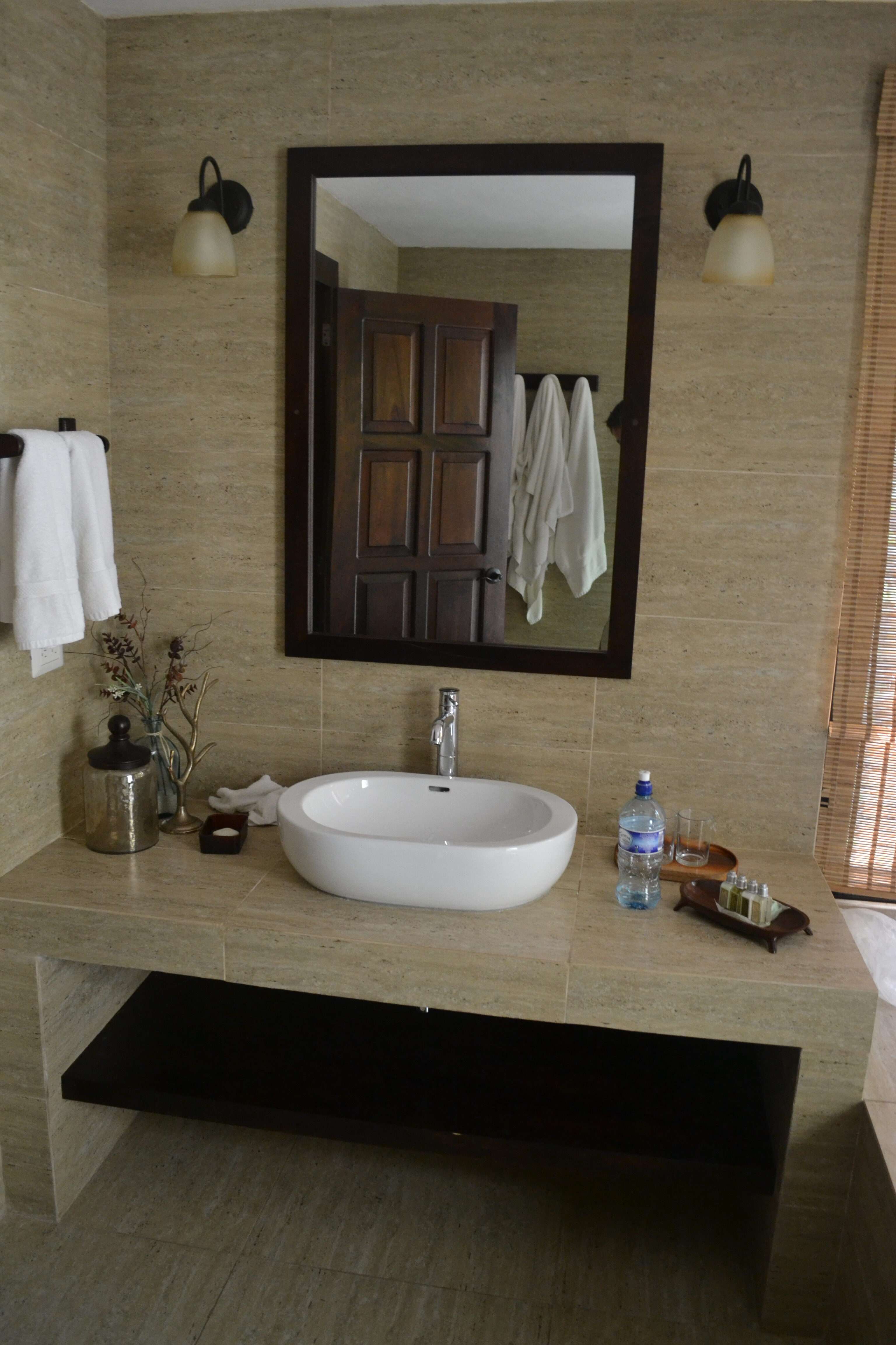 The bathroom was recently remodeled as well and was modern and clean. There was a separate tub and a stall shower that had a door connecting it to an outdoor shower. One word of warning: the toilets and sewage system in Guatemala cannot handle toilet paper so you must throw your used toilet paper in the trash. The toilet in our room was also a little weak in its flushing abilities, but overall it was an incredibly nice bathroom considering we were in the middle of the jungle.