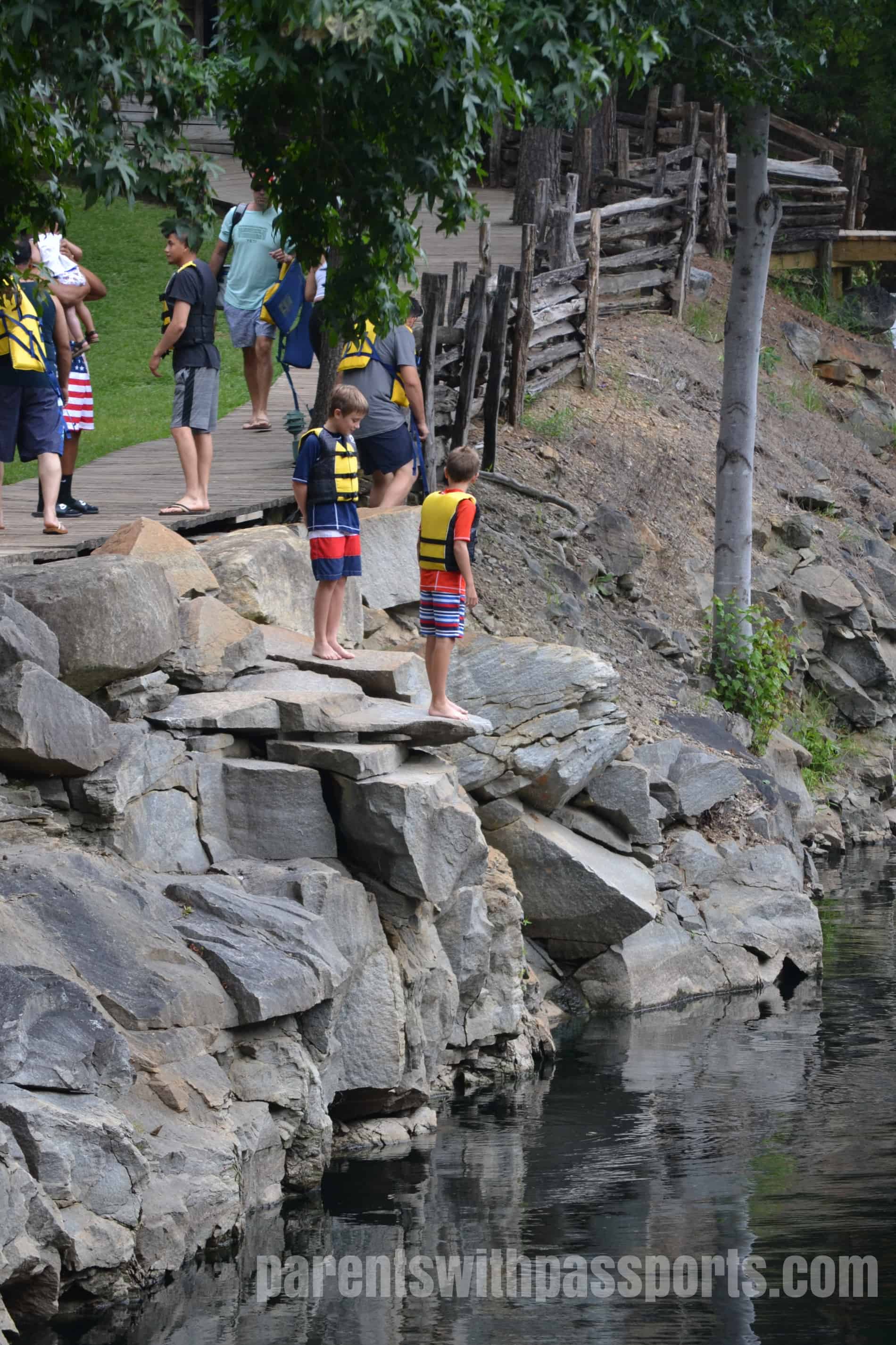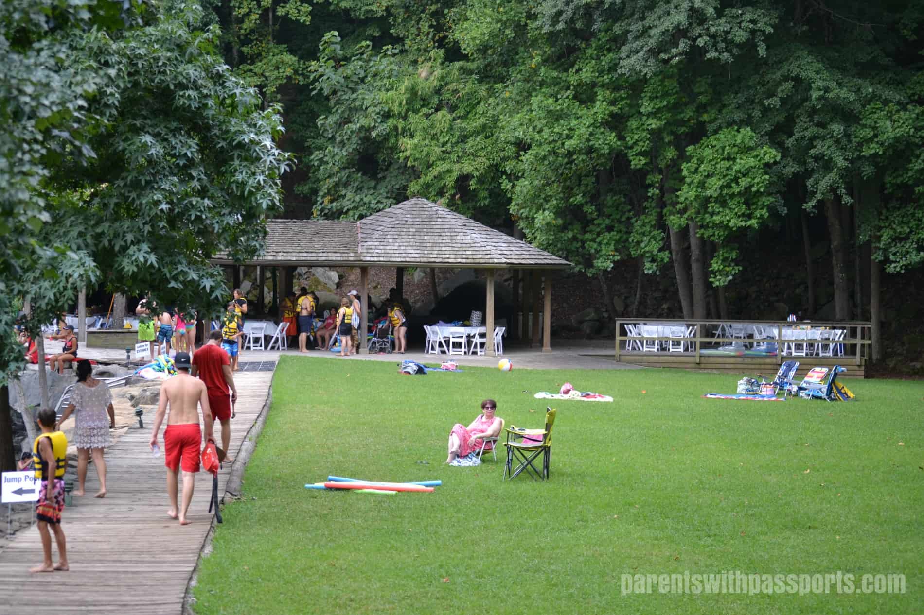 Children 11 and under are required to wear a life jacket. Children 12 and up (as well as adults) can opt to take the swim test. The test involves jumping off the rocks into the water, swimming to the floating dock, treading water for one minute, and then swimming back to the exit ladder. Life guards posted at the dock and at the exit evaluate your swimming abilities and determine whether or not you pass the test. If you pass, you get a wristband to swim without a life jacket. If you do not, you must wear a life jacket. I didn’t bother to take the test as I didn’t plan to be in the water too much and there was a decent line of people waiting to take the test. I did see the life guards tell several people they did not pass and would have to wear a life jacket so it was definitely something that was taken seriously.