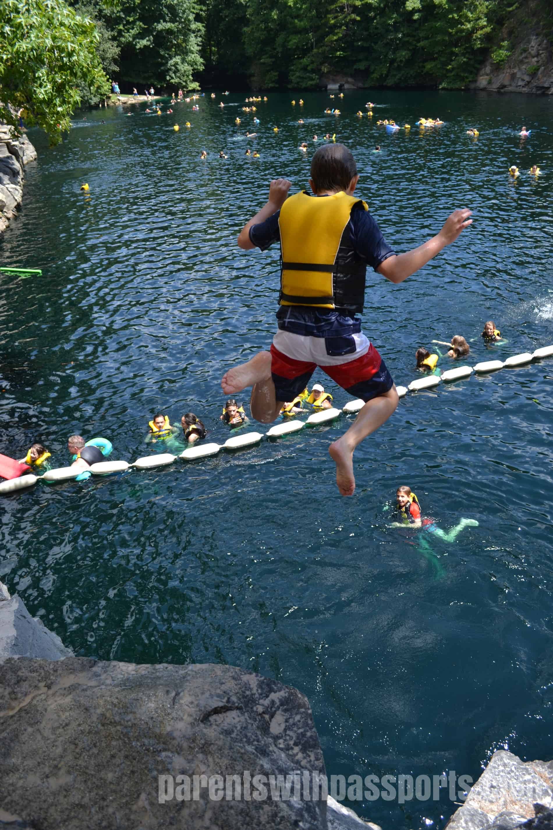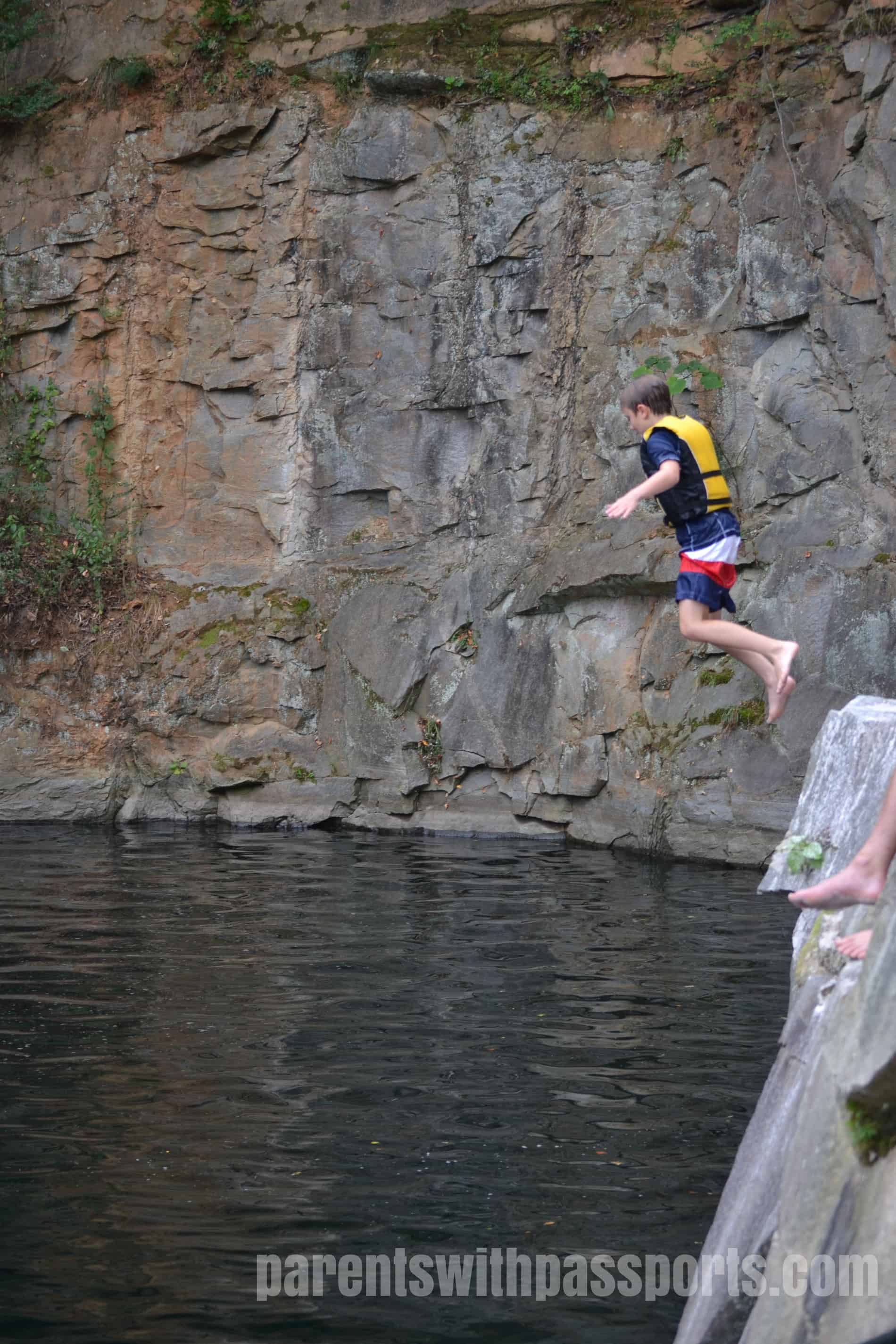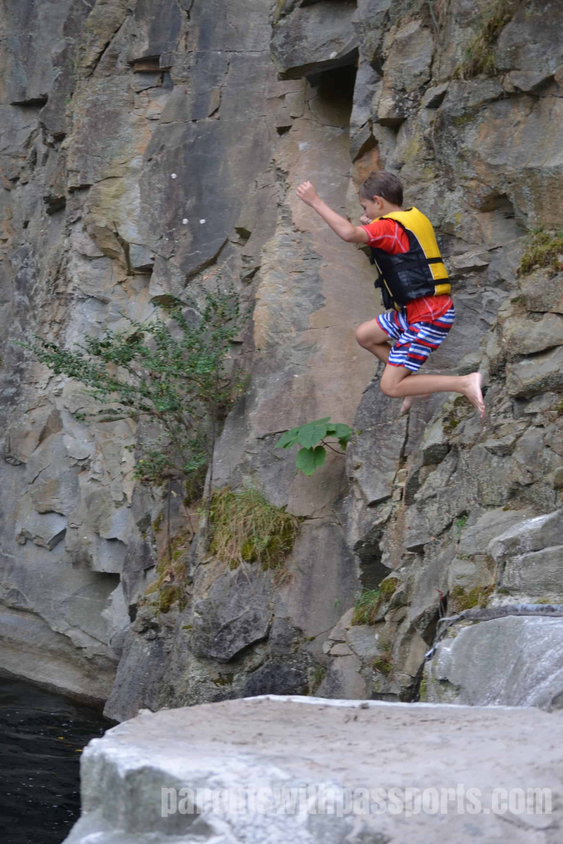 There are a handful of designated jumps – a specific rock that juts out over the water or a small deck built out over the water – but for the most part it is a free-for-all on where you could jump. With the exception of a few spots where the lower rocks came out too far, you could safely jump in just about anywhere. The plus of that is that there were many places to jump, offering a variety of heights and experiences. The minus of that is that it can potentially be chaotic as people could be literally jumping almost everywhere and lifeguards can’t be at ever single spot that someone might jump from. I will say that when we were there, everyone seemed to be respectful and careful of others. But parents should watch their kids to be sure that the spot they are jumping from both has enough clearance from the rocks below and is free of other swimmers immediately beneath them.