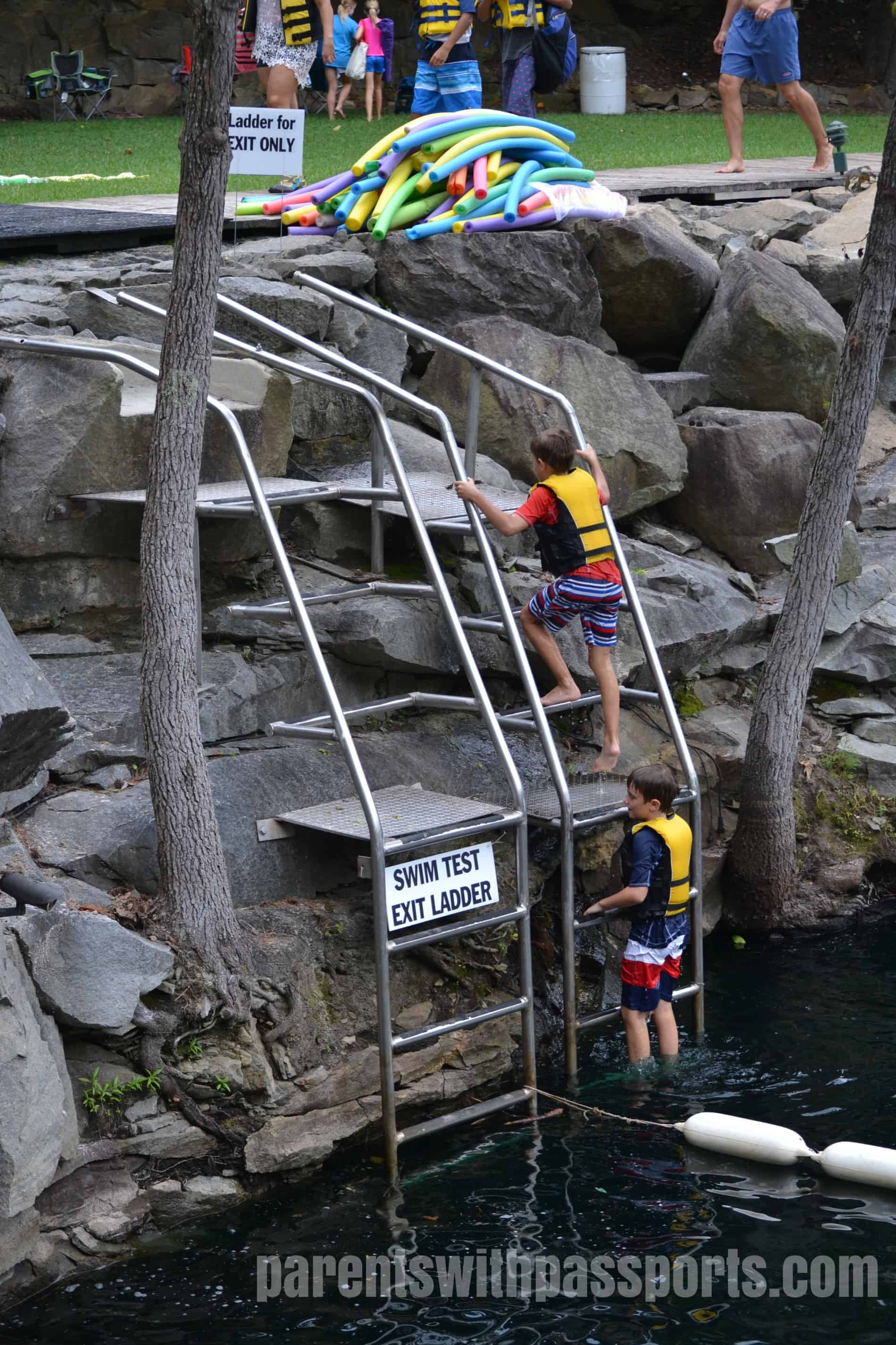 The boys didn’t mind having to wear a life jacket and I was much more comfortable knowing they had them on. The water is 25 feet deep so the life jackets gave me peace of mind. And as it got more crowded, there would often be a line to use the ladder to climb out. Without life jackets they would have had to tread water for decent amounts of time while waiting. The life jackets definitely made it easier for them to enjoy themselves and easier for me to watch them. Between the life jackets and the dozen or so life guards stationed around the quarry, it felt very safe. (Note that the swim test and other safety requirements were implemented in 2014 after the tragic drowning of a 19 year old at the quarry in 2013.)