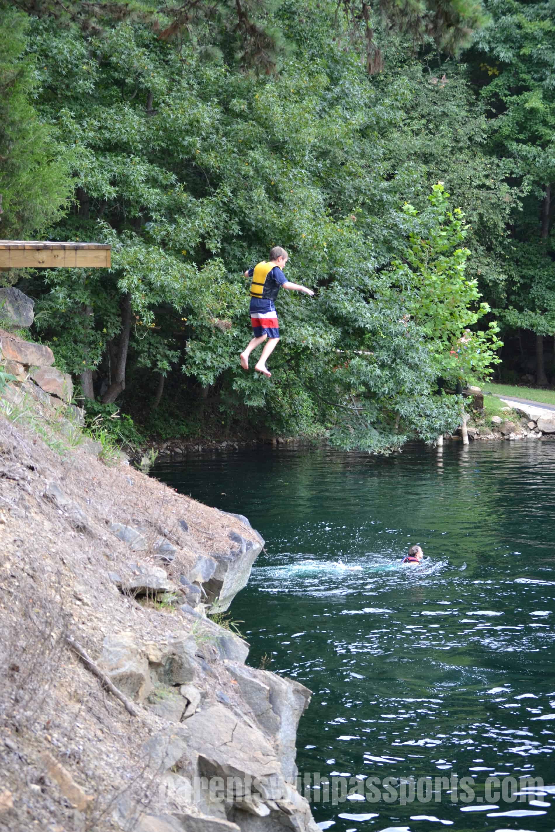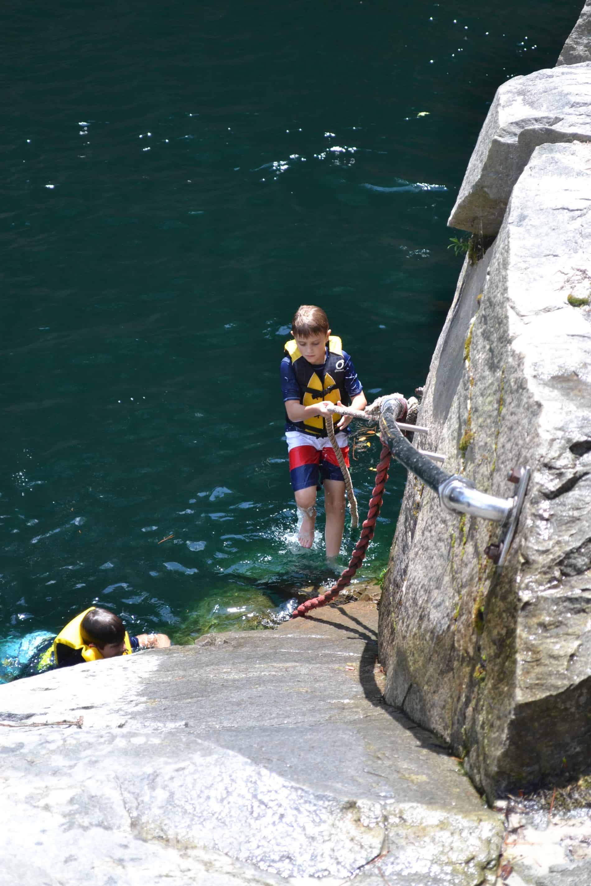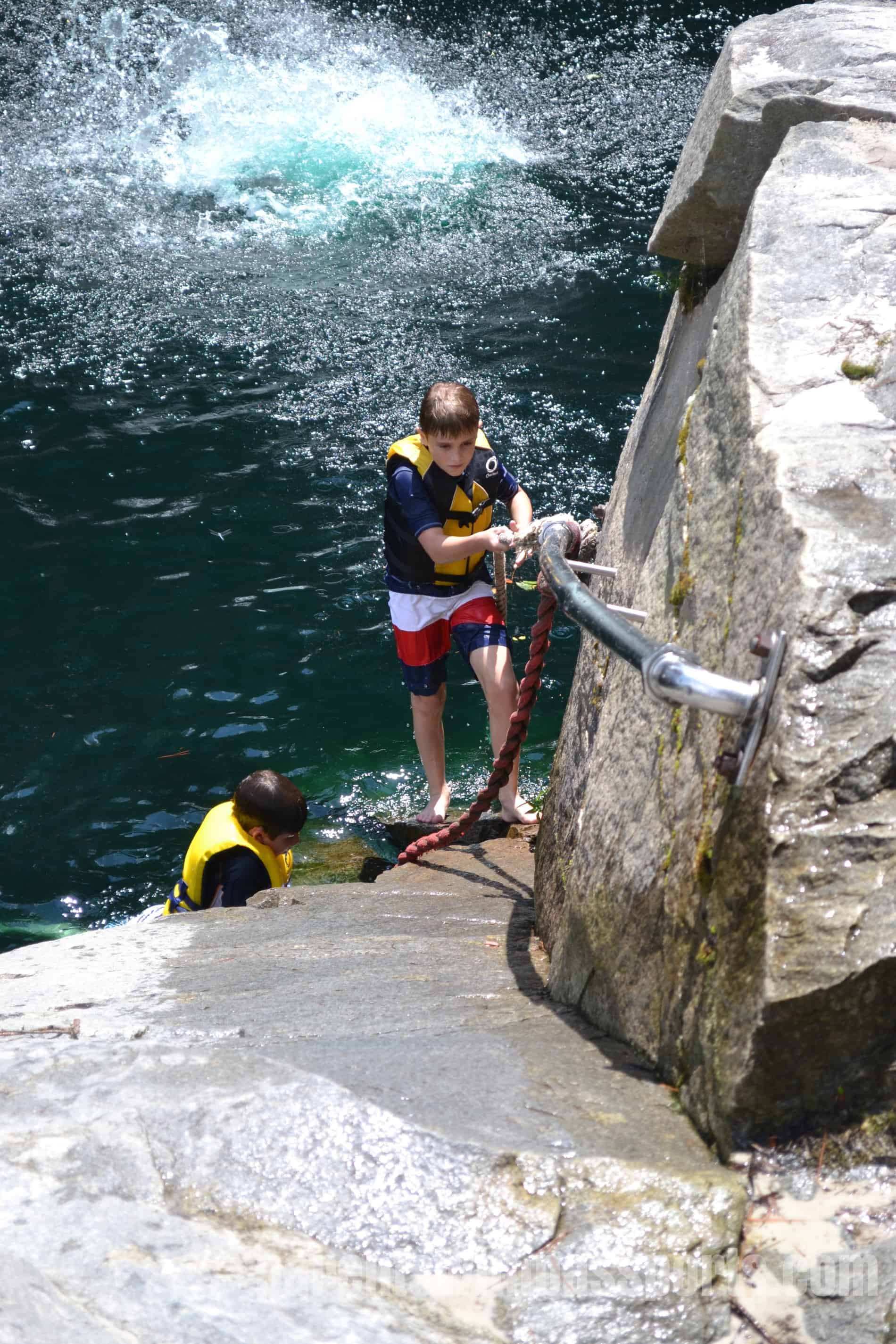 The consensus was that the water was not too cold (I think the water temperature averages in the high 70 degrees in the summer) and the boys were immediately thrilled. They quickly swam to the side and climbed out to find their next jumping spot.
