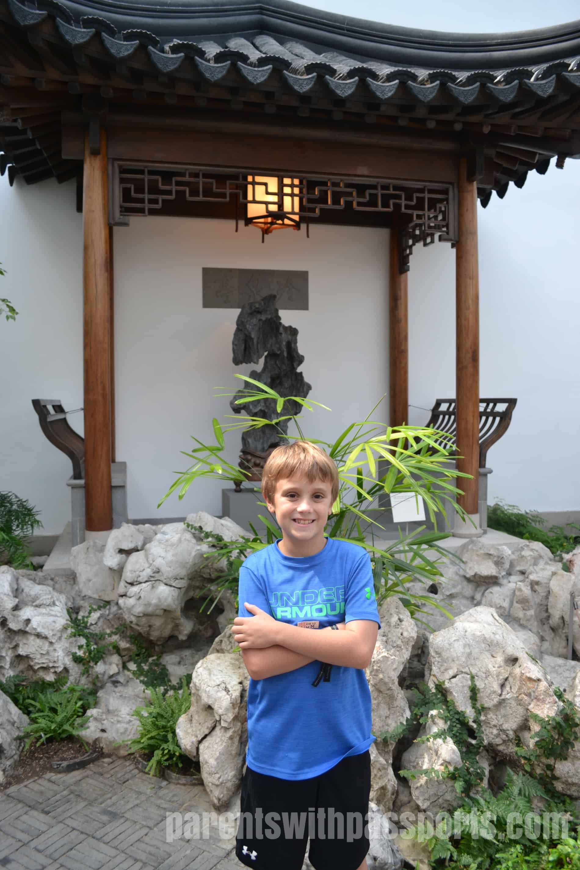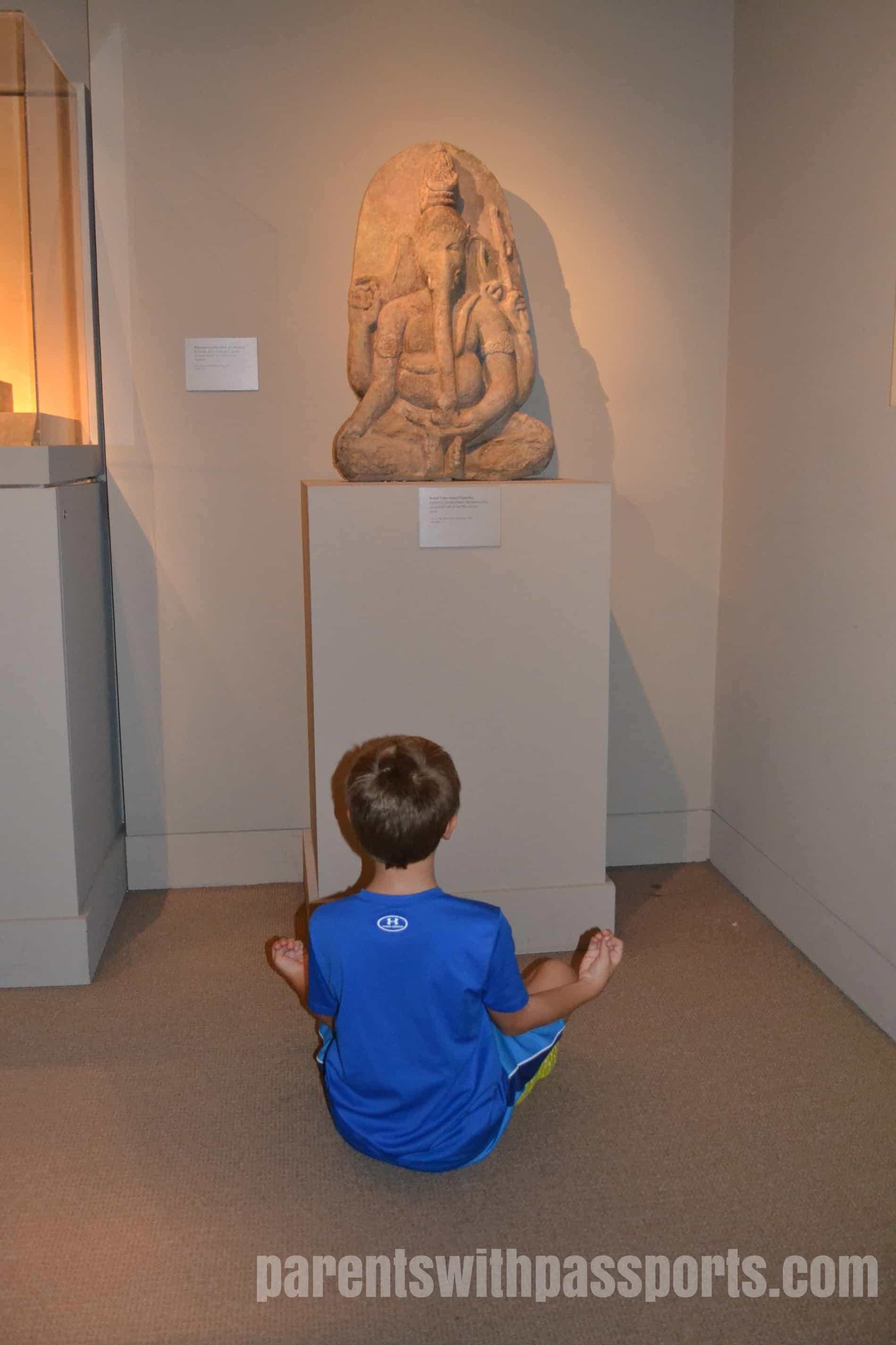 We headed up the Grand Staircase and into the Asian Art collection. This is the area where we spent the most time. The boys enjoyed wandering amongst the sculptures, watercolors, calligraphy, and screen prints. The Astor Chinese Garden Court is a really peaceful spot where we managed to briefly escape the museum crowd.