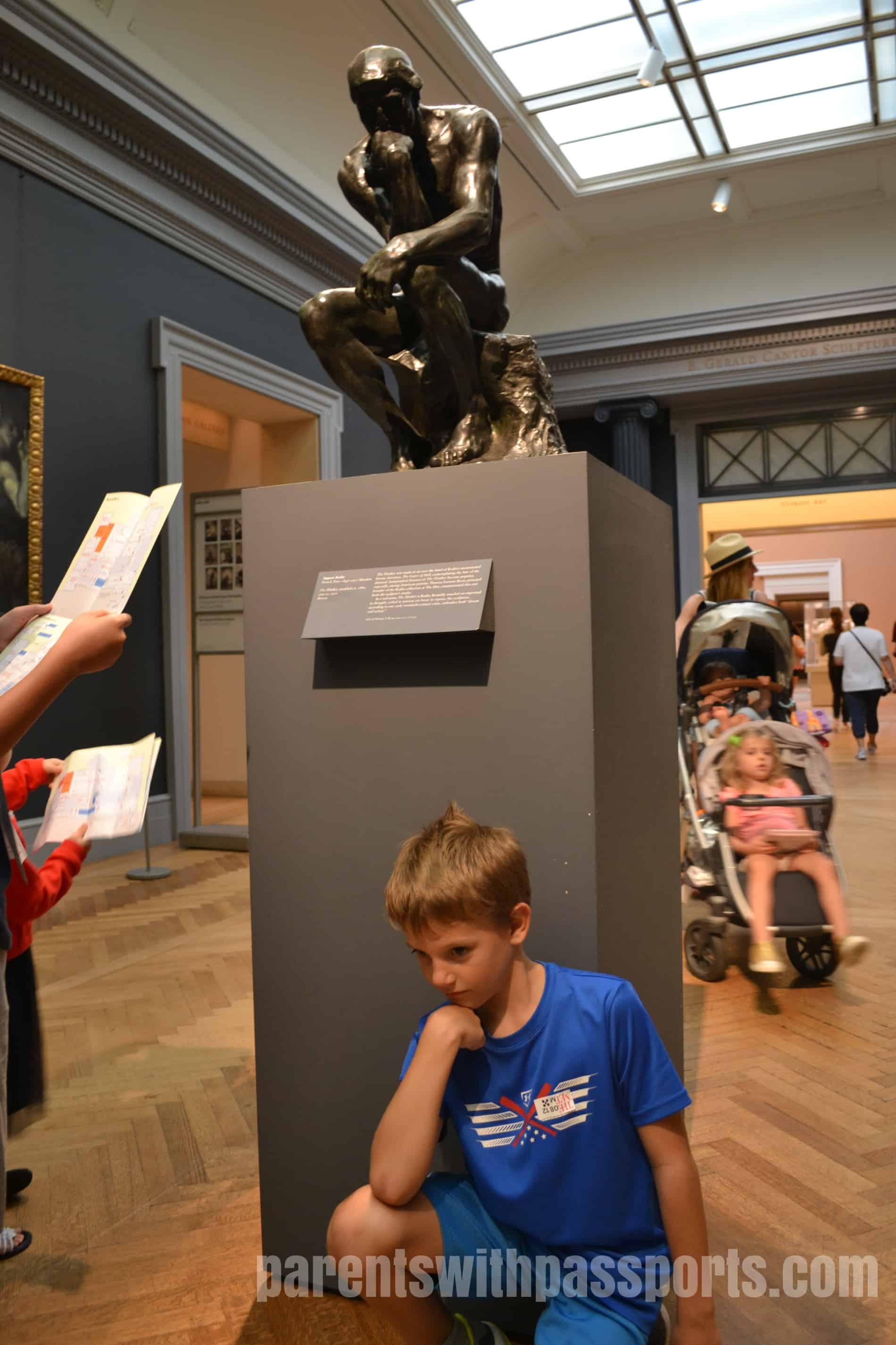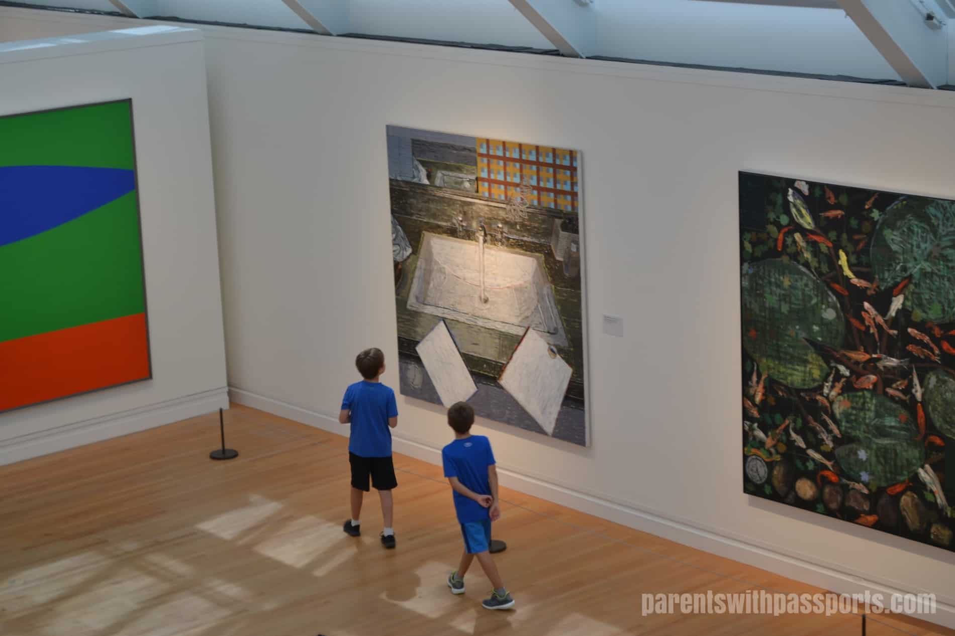 The Modern and Contemporary Art collection is where my oldest really wanted to go, but I suspect he discovered that the “modern art” wasn’t exactly what he envisioned. Still, they enjoyed walking around and viewing the large paintings and sculptures. The modern art gallery covers two stories, with the lower level open to the upper level on one side and flanked by huge angled windows on the other. The natural light coming through the windows and the colorful, modern art pieces really made this collection pop.