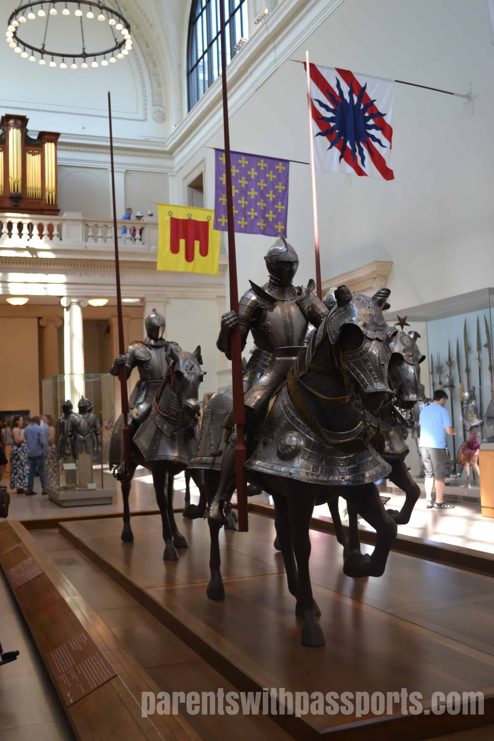 We wandered through some other collections on the way to our final destination, the Arms and Armor room. If you have young kids and their interest seems to be waning, this is the place to head. Focused on the design of swords, guns, and armor, there are a lot of really interesting pieces in the collection. The literal and figurative centerpiece of the collection is 4 fully armored knights atop 4 fully armored horses. The display seemed to immediately captivate all the children who walked through the doors.