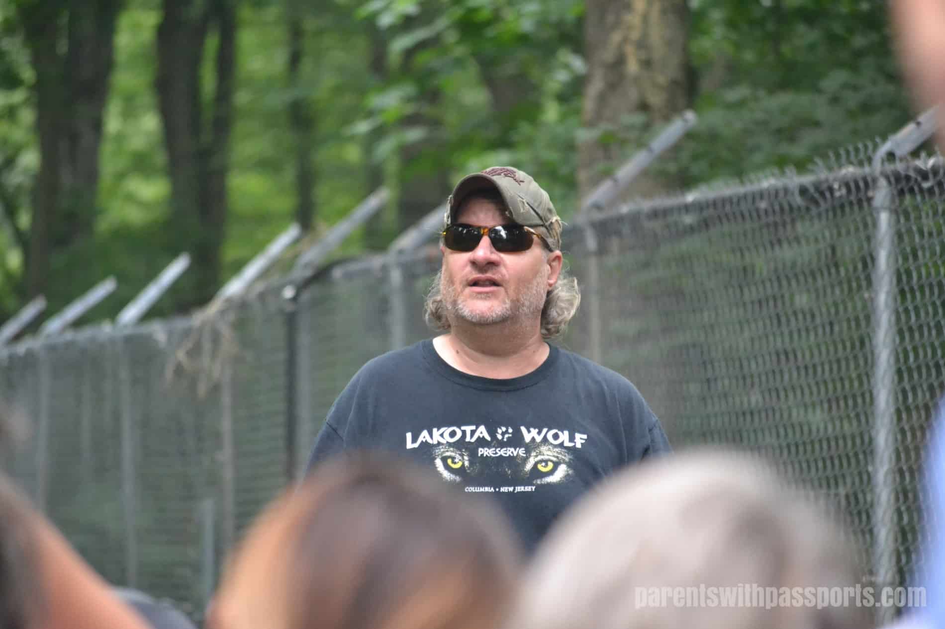 When the tour began, they took our tickets and let us into the observation area.  I think the word “tour” is really a misnomer here.  It is more of a presentation or an educational lecture.  Jim stopped at two different points in the observation area, stood up on a bench, and taught us all about the wolves.  He clearly has an amazing amount of knowledge about the animals and his personal anecdotes about raising them were really interesting and entertaining.