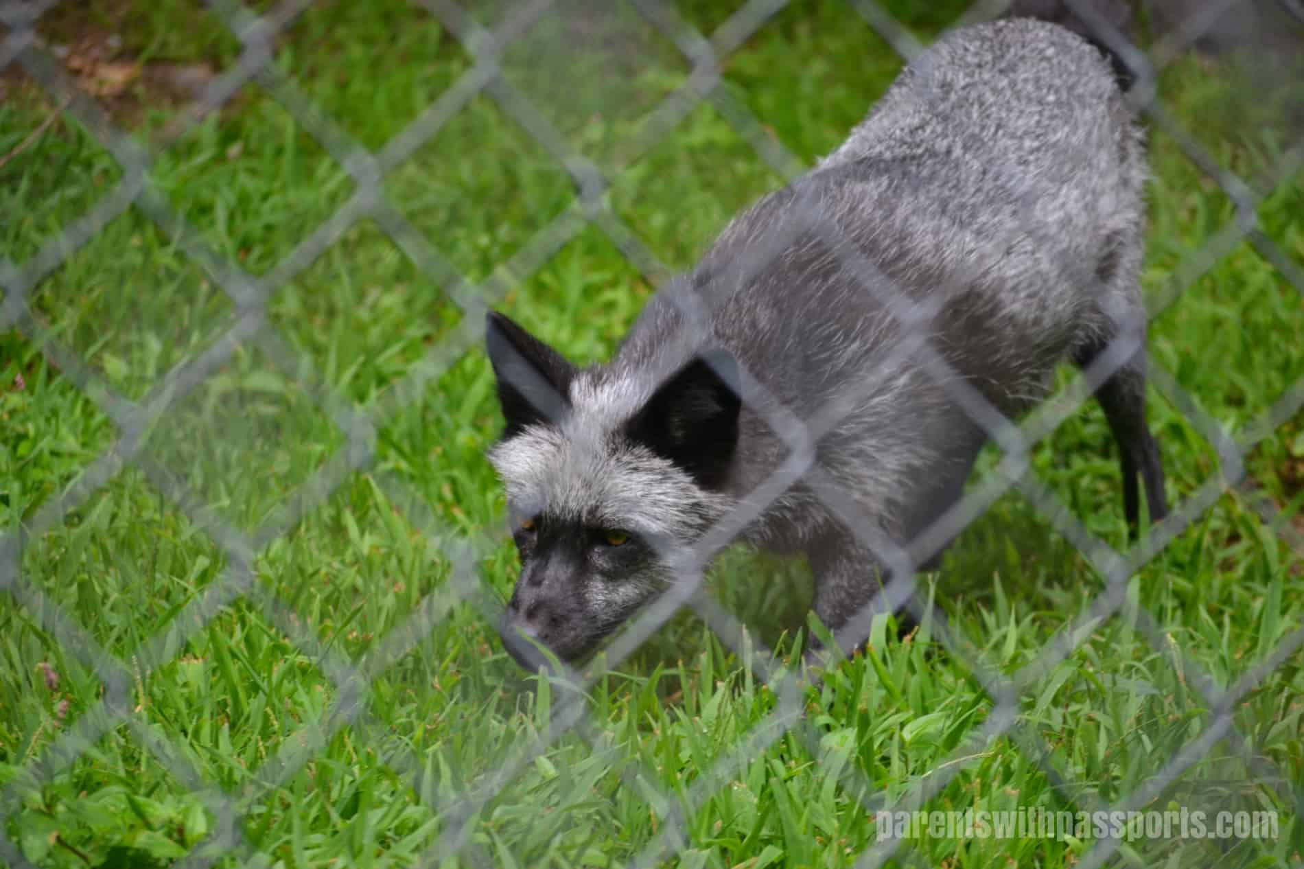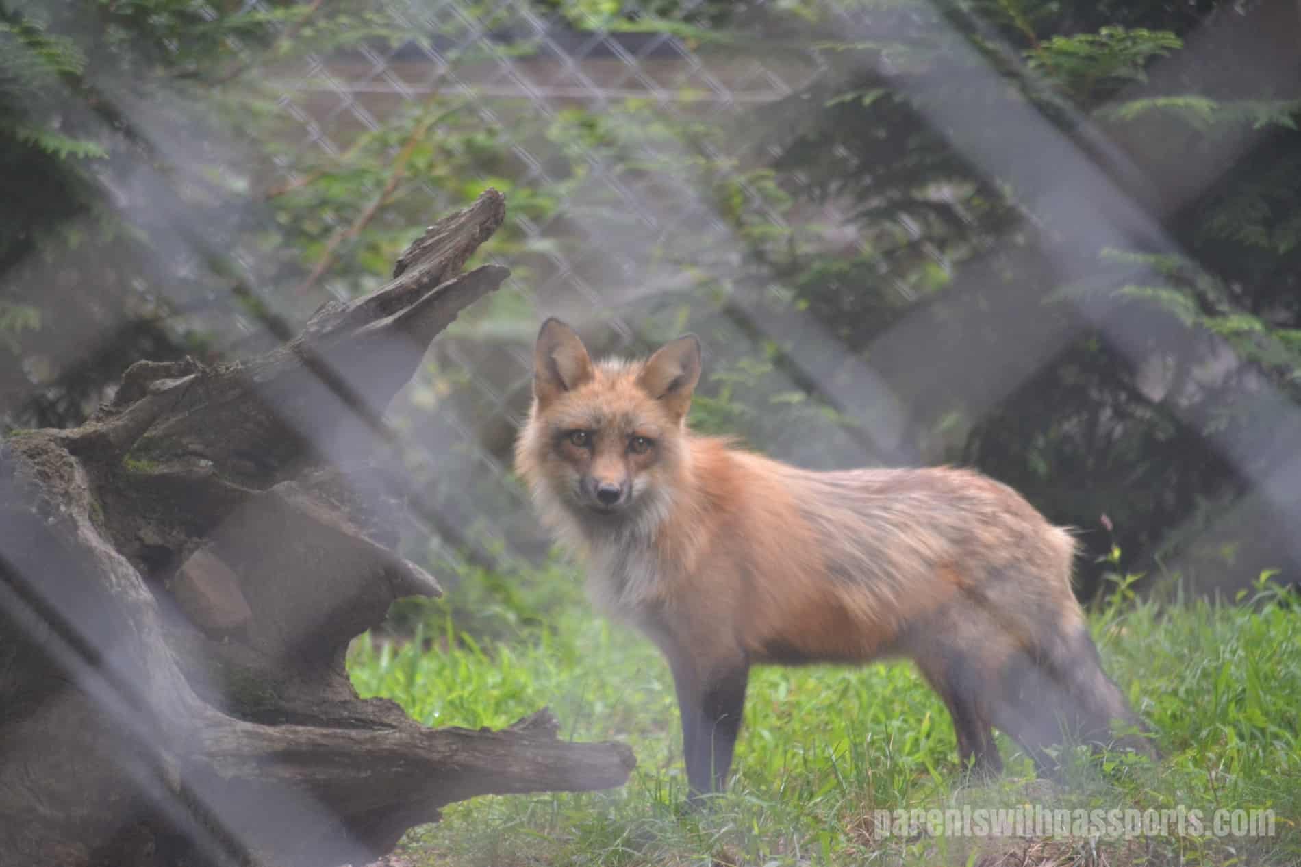 After that we shifted over to the fox enclosure.  There were two foxes inside – one who was scared and shy and one who acted like a playful yet well-trained puppy.  The shy one was red and hid behind a log for most of the presentation.  The other was a cool grayish color.  He was absolutely adorable and would do pretty much anything for treats.
