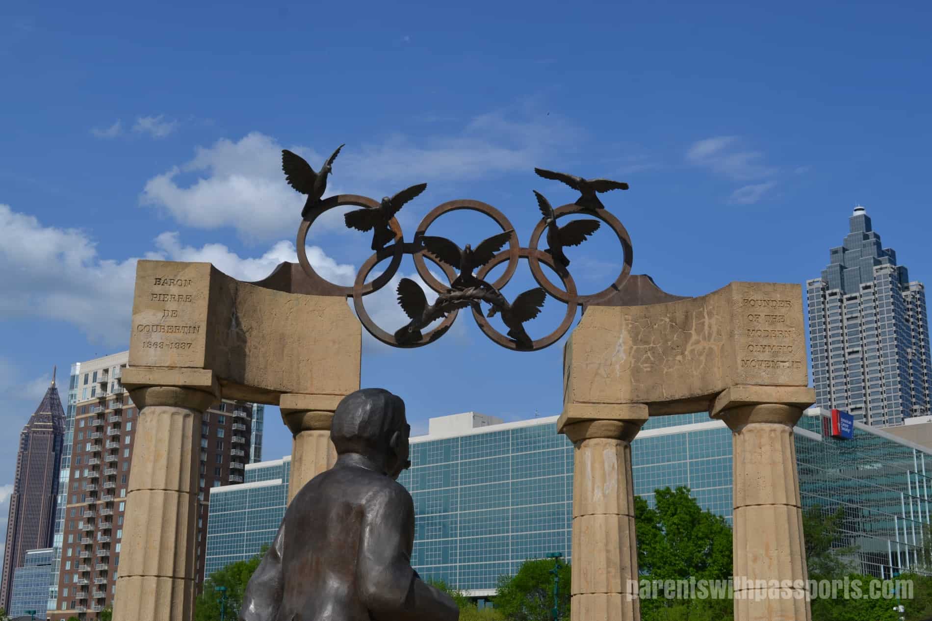 After walking across the large lawn area, we came to the Gateway of Dreams statue. This statue honors Baron Pierre de Coubertin, the founder of the modern Olympics. Climbing stairs to the Greek columns, the Baron is about to receive a wreath made of olive leaves from a group of doves. With the backdrop of a bright blue sky, the Olympic rings really stood out and the birds seemed lifelike perched on the rings.