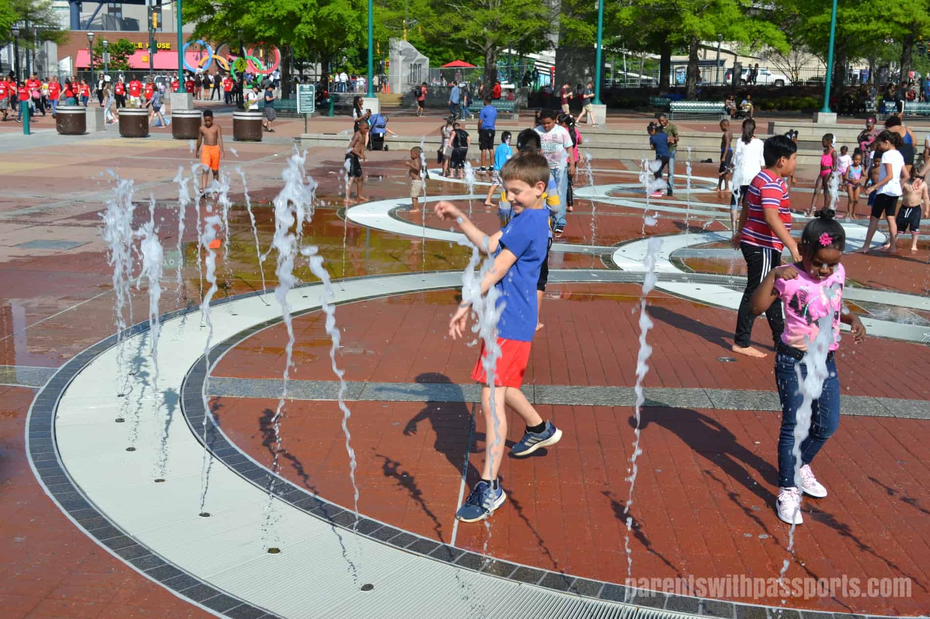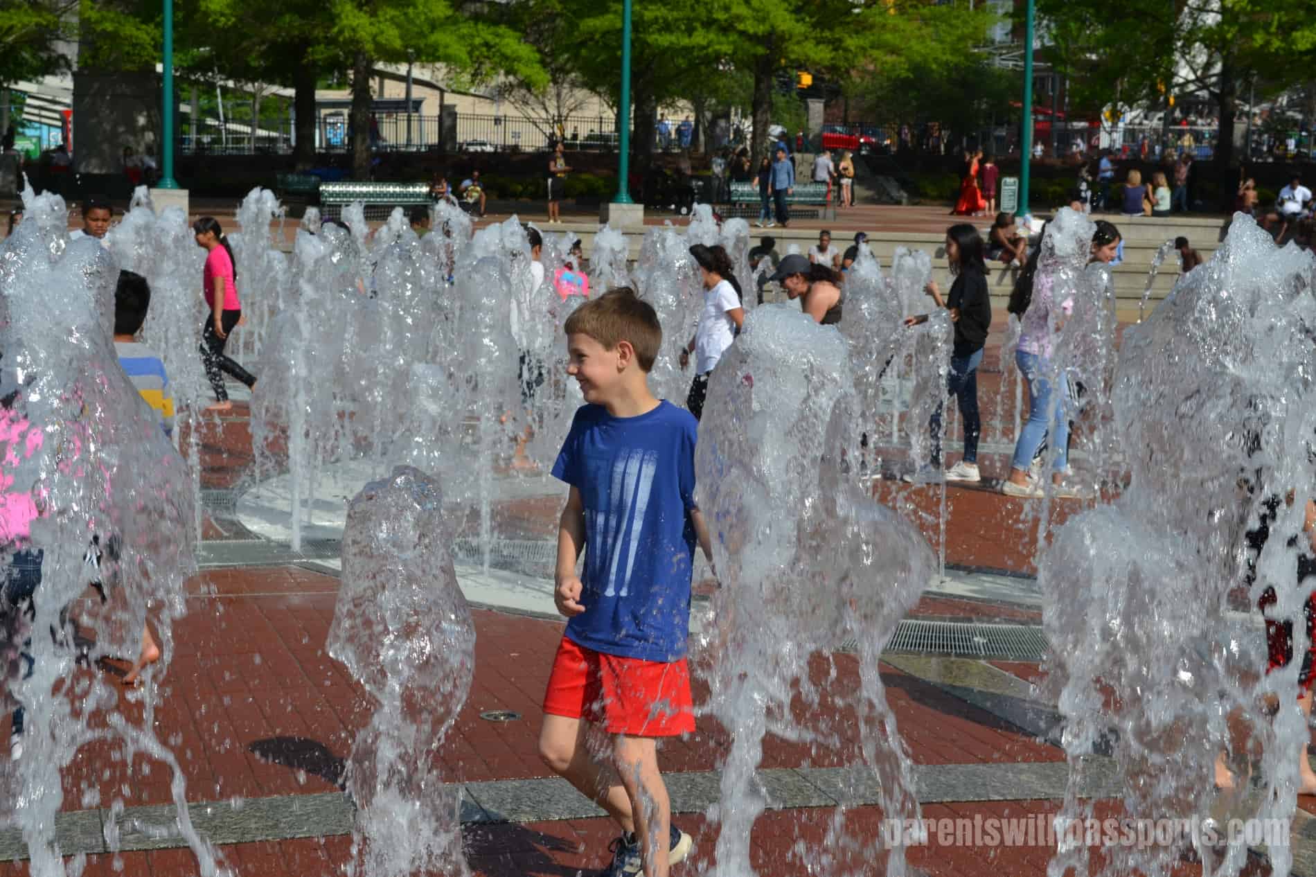Just beyond the Reflecting Pool and Centennial Plaza was the park’s most exciting feature (for my kids at least) – the Fountain of Rings. Where else can you run in and out of the Olympic rings, with water shooting up all around you? This was such a unique, surprising and fun experience for the boys. At first they just stood back and watched. But it was surprisingly hot even at 5:30 pm in April and soon the boys were inching towards the fountains, tentative at first, hoping not to get too wet since they were in their sneakers and clothes.