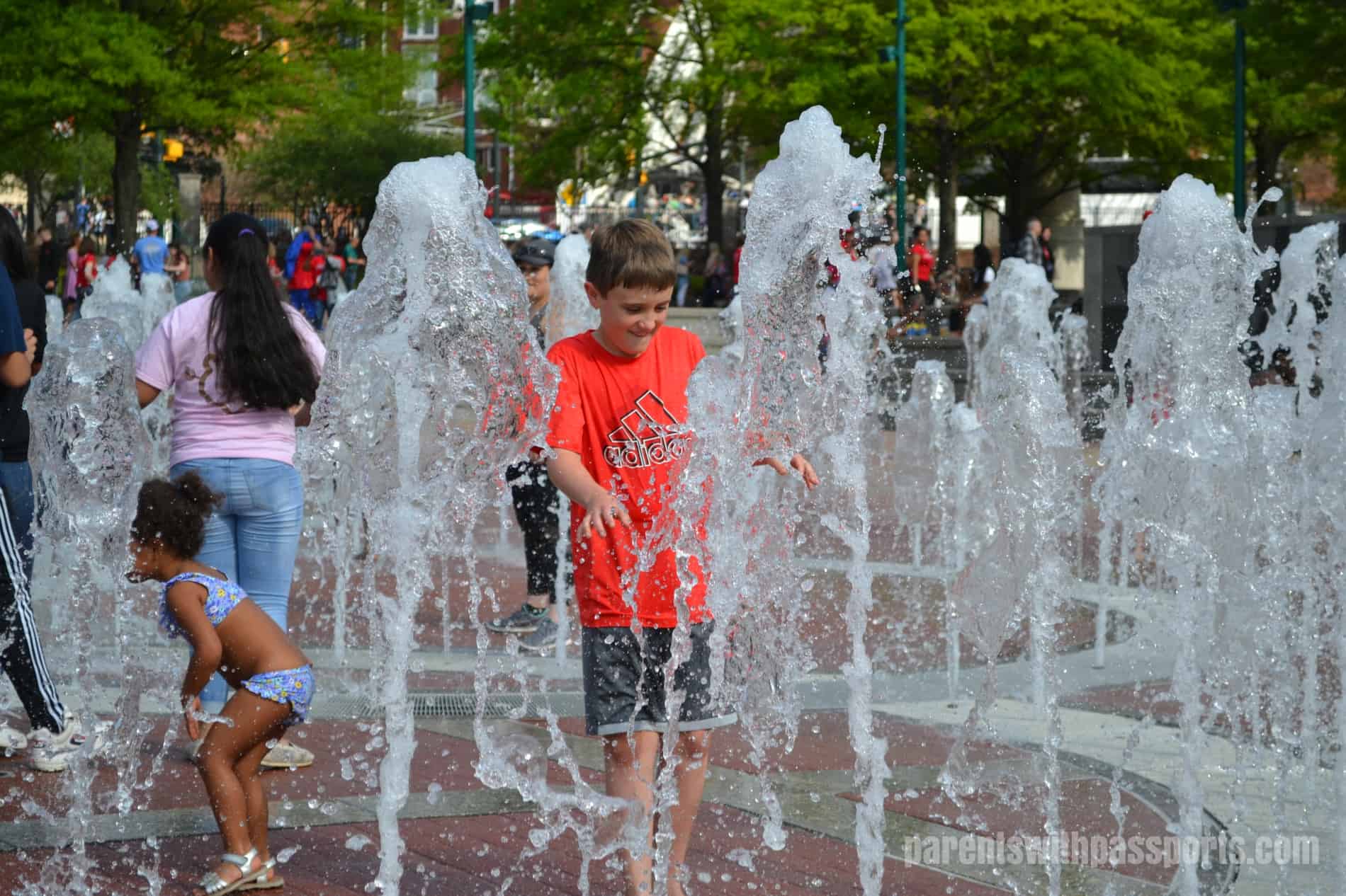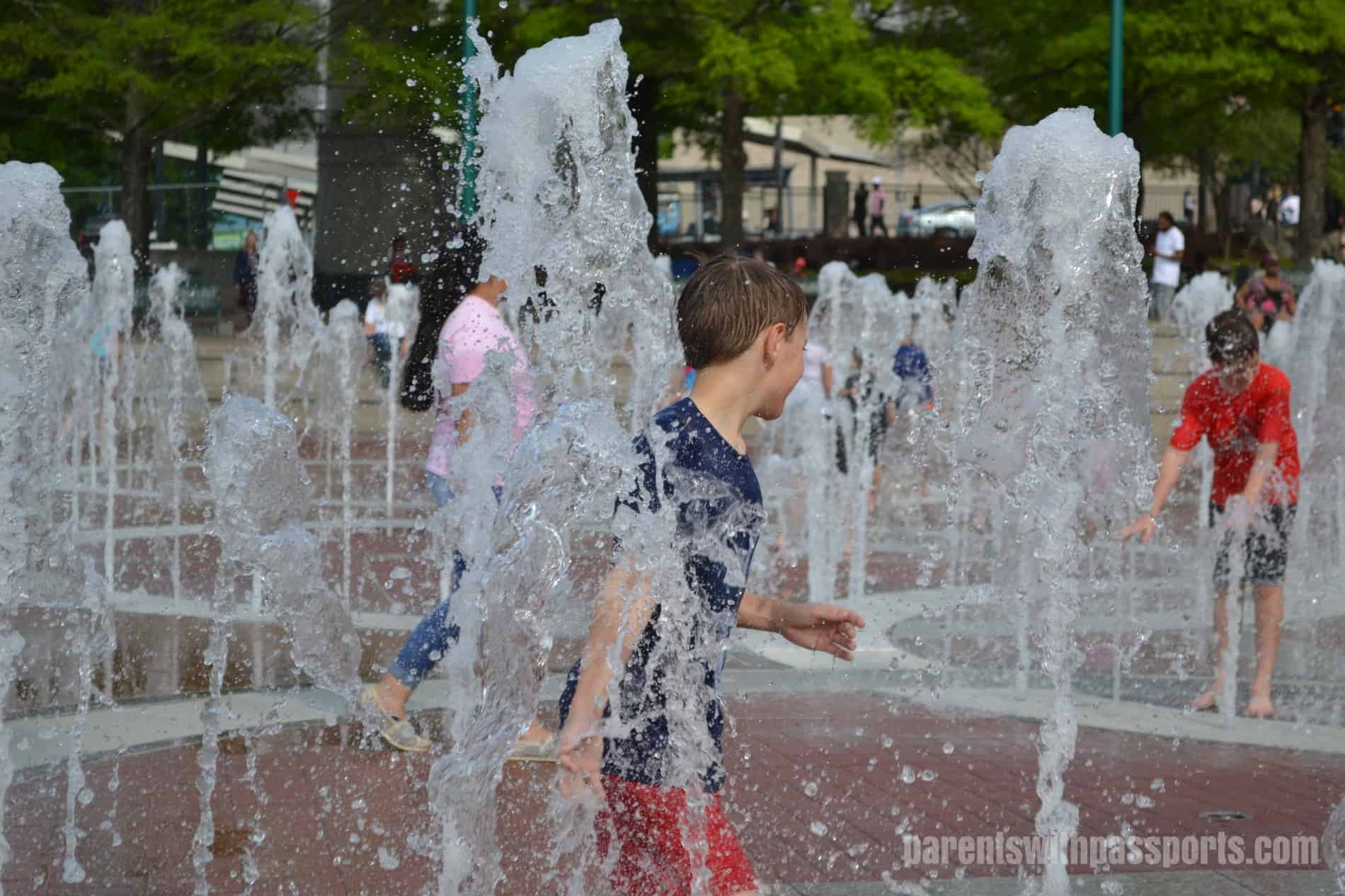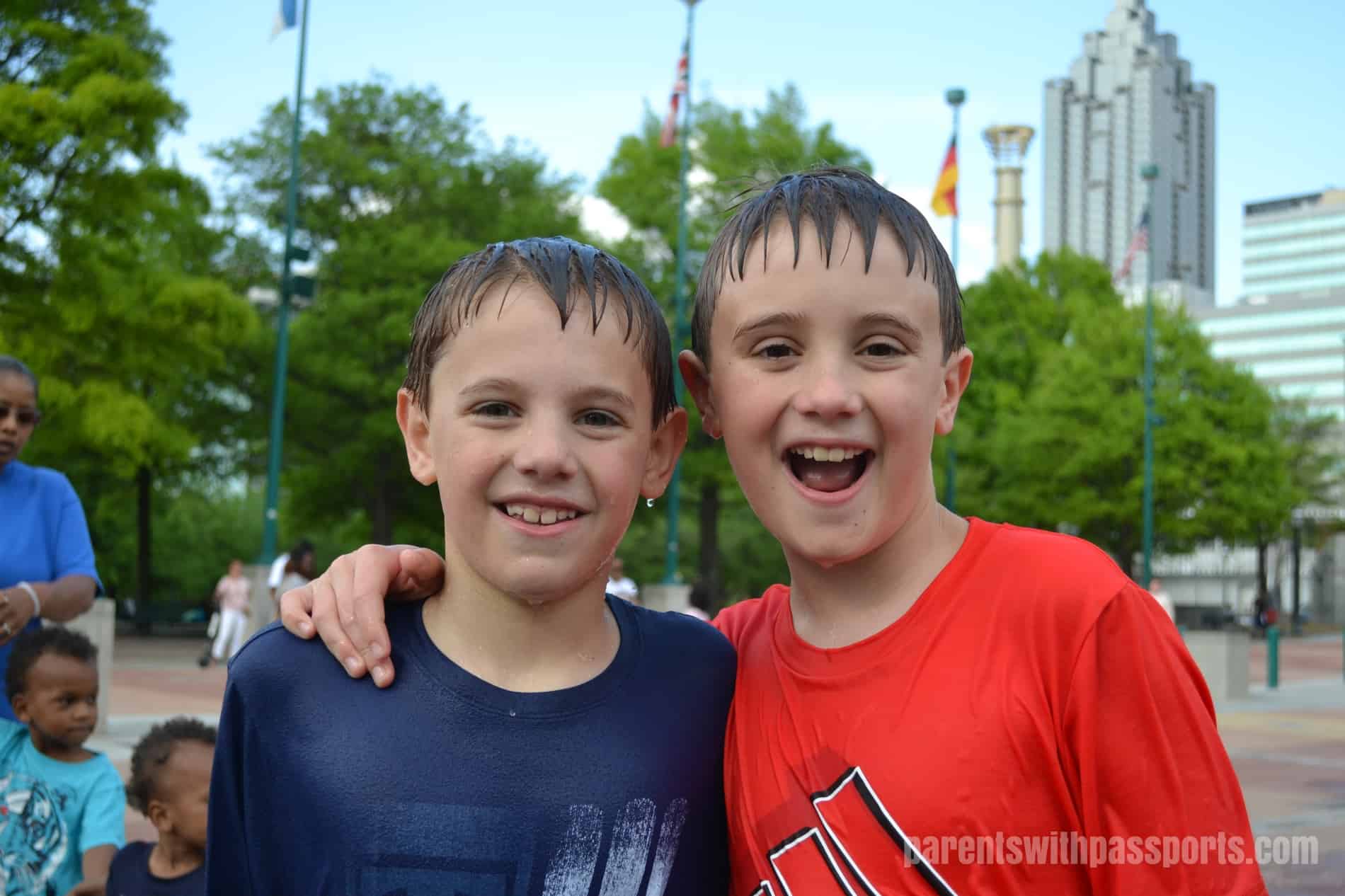 But soon all hope of – and interest in – staying dry were out the window. Before long the boys were trying to anticipate where the water would come up next so they could jump in at just the right moment to get soaked. They ran full circles around the rings while the fountain was up. They ran in and out, straight through the stream of water. They just could not get enough. I was so happily surprised at how much fun they had there. I haven’t brought them to fountains or splash parks for years because I thought they were too old, but the pure joy that this brought them was amazing to witness. They got soaked to the bone and loved every minute of it. (At least until it came time to walk back to the hotel in dripping clothes and soggy shoes.)