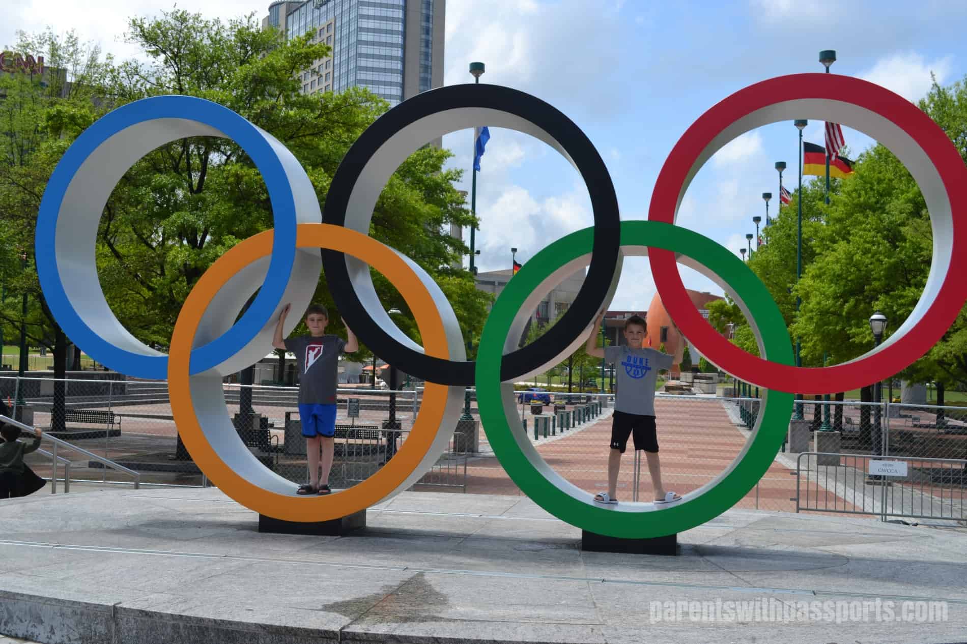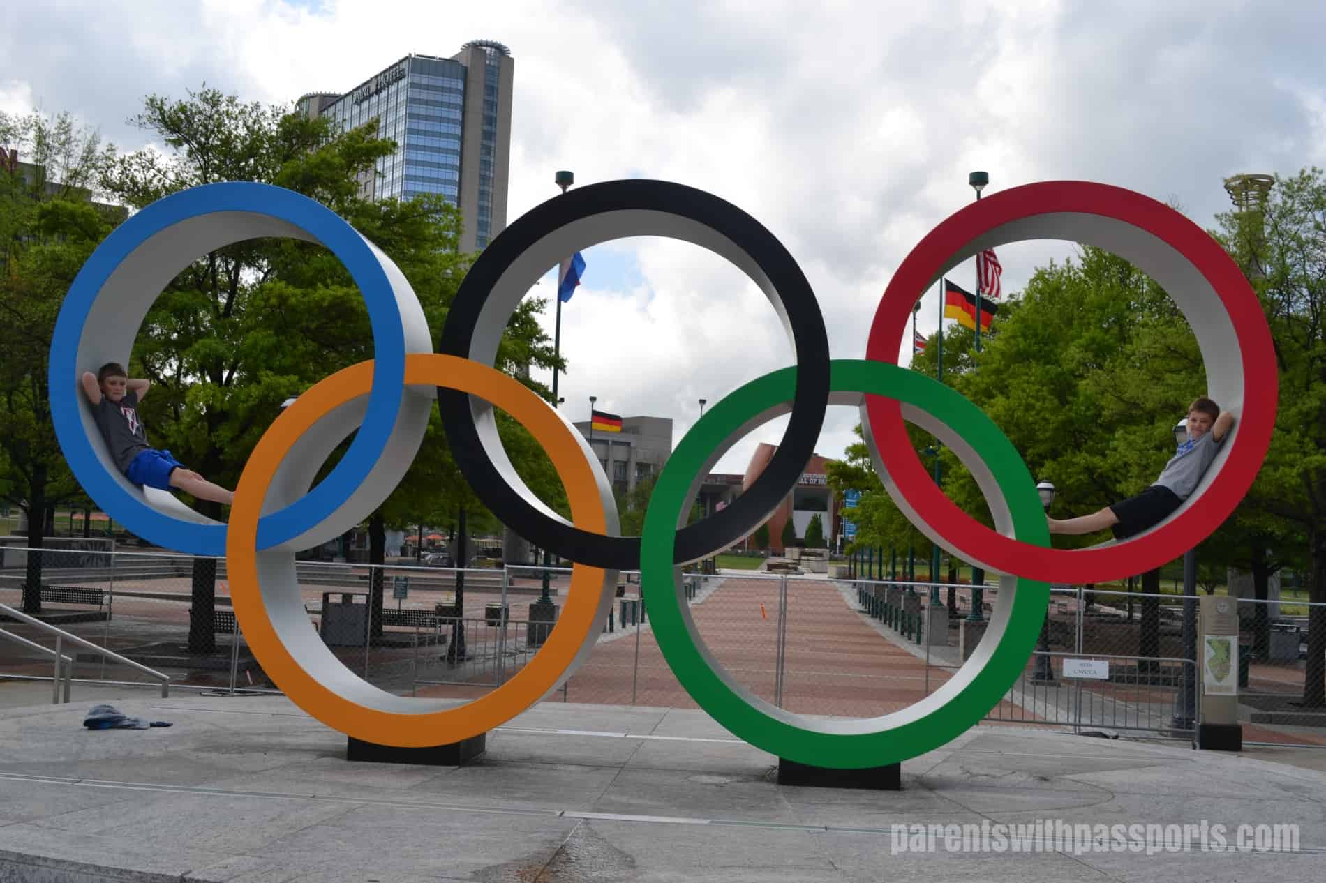 We headed straight back to the hotel to dry off on that day, but we were in and out of the park every day of our visit. One other highlight for the boys was the Olympic Rings at the east entrance of the park. The first day we were there it was impossible to get a photo of the rings without two dozen people in it, but on one of our trips past later in the week, we were lucky enough to find them nearly empty. The boys had fun climbing in the rings and posing for pictures.