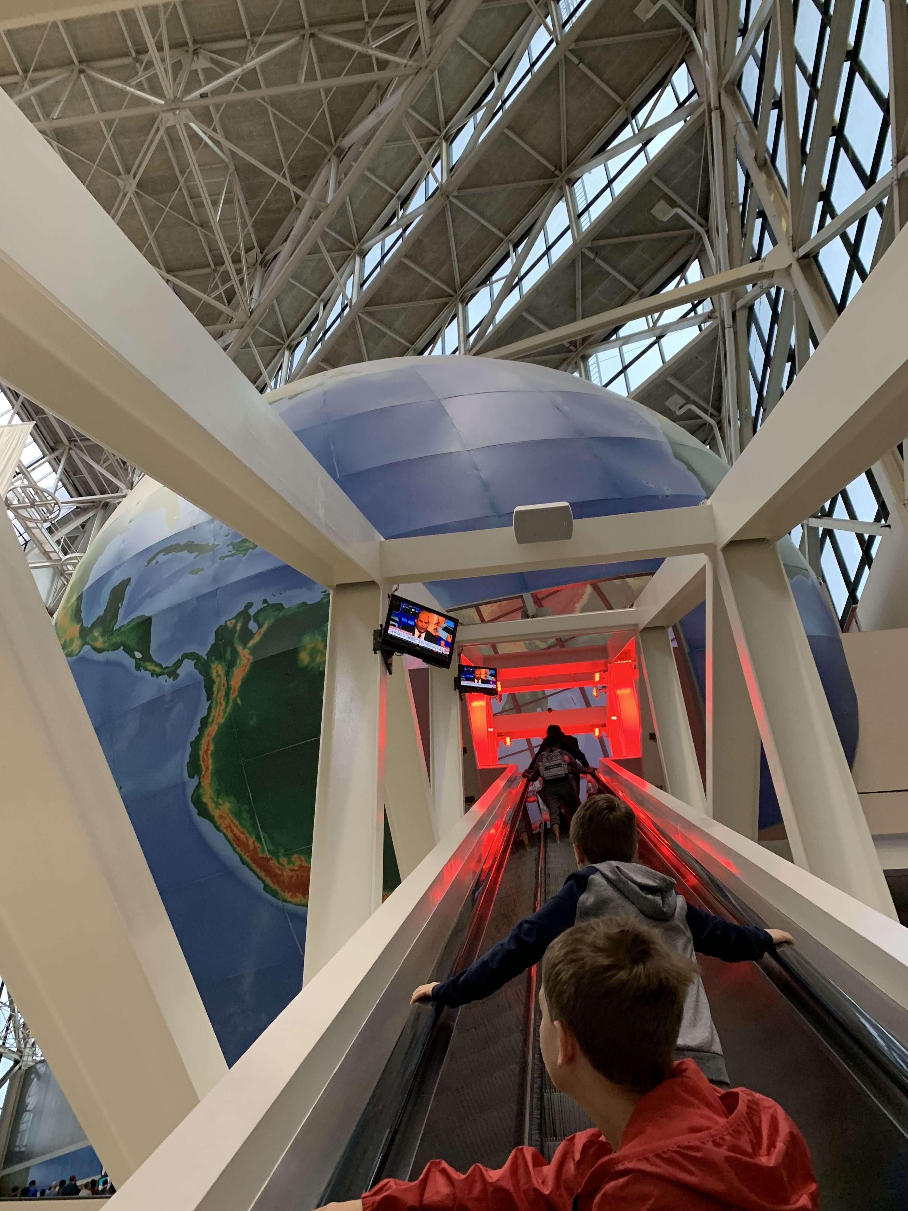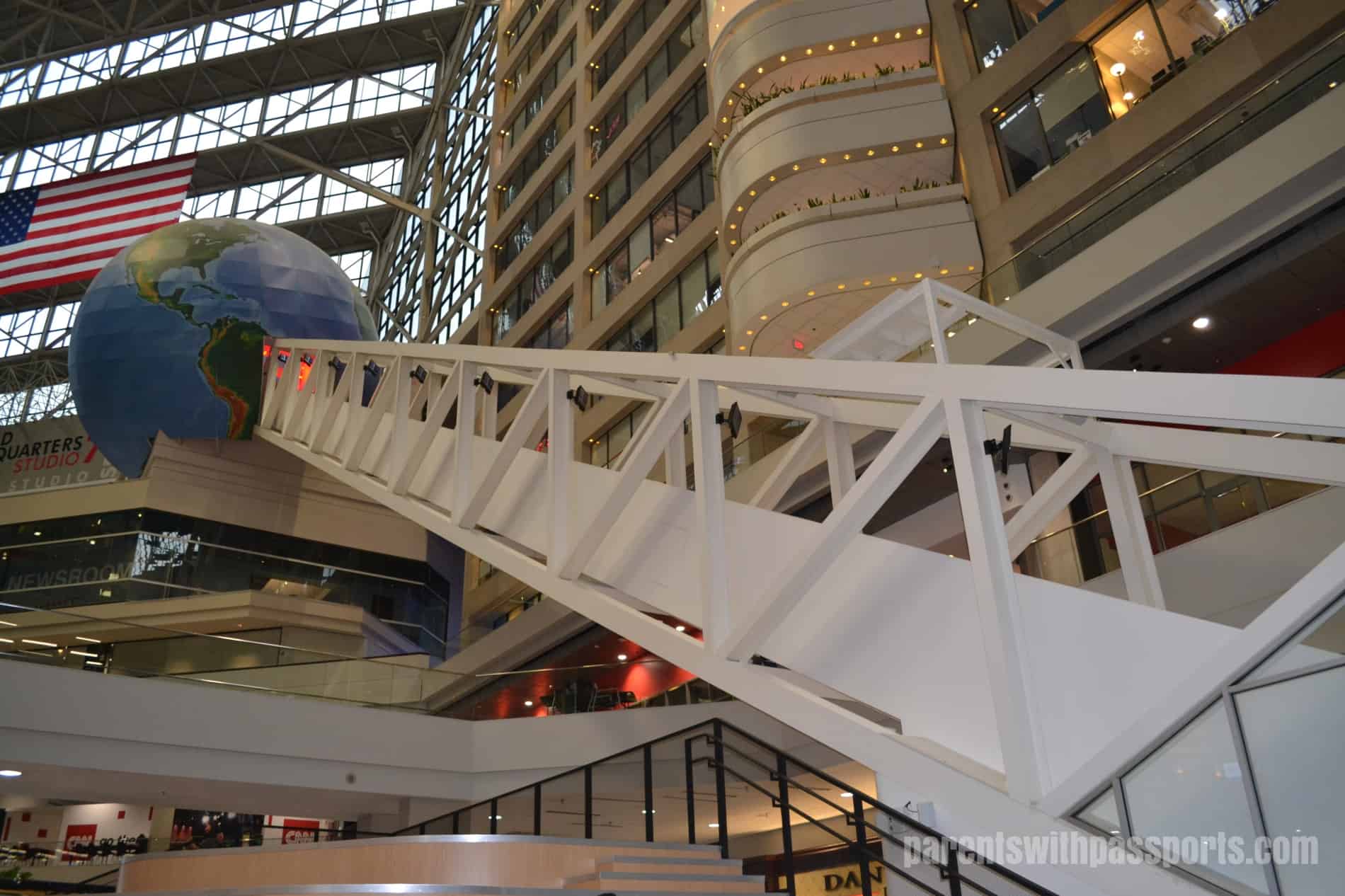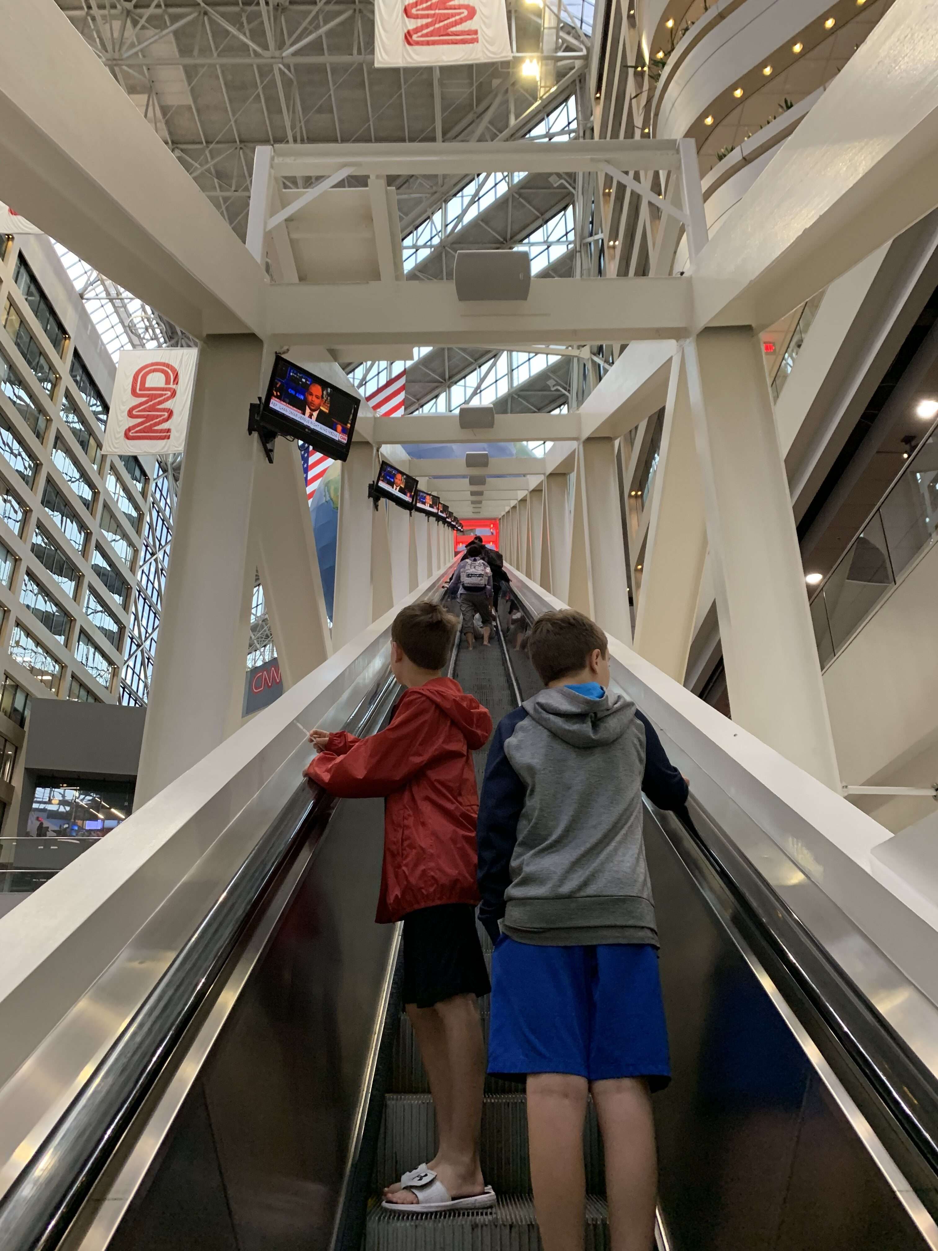 About 5-10 minutes before our tour time, we entered the line that queued behind the escalator. Shortly after that they started checking tickets and leading people through the security screening (similar to an airport). Then it was on to the thrill of riding the world’s longest freestanding escalator to the top of the globe. The escalator is 196 feet long and 8 stories high. (The CNN Center main floor is open to the public but you can only ride the elevator if you are part of the tour.)