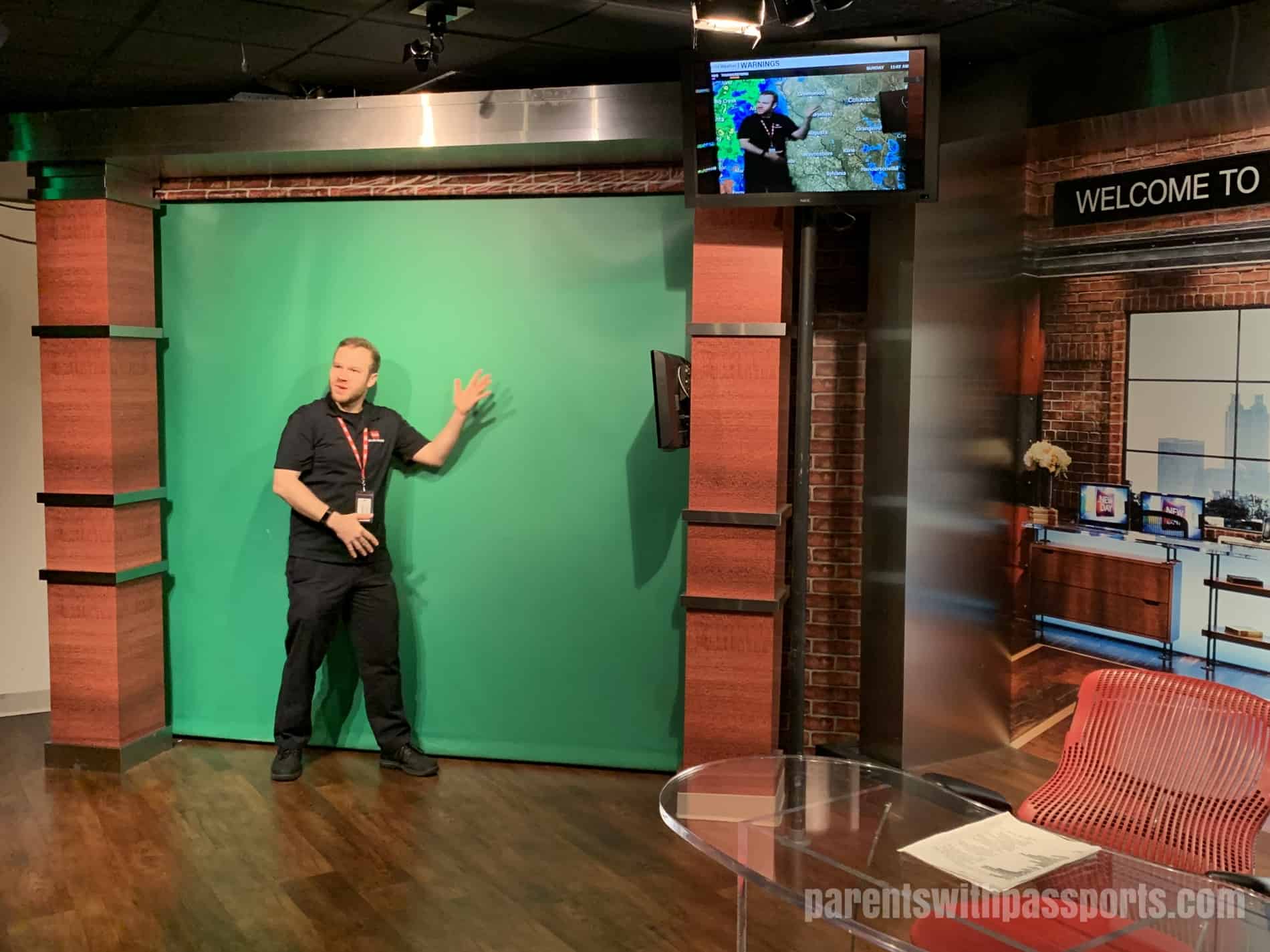 After the film, we moved into a sample studio where the tour guide demonstrated how a teleprompter and green screen worked. The boys thought it was cool to see how the weather reports work – the guide was standing in front of the green screen in real life but on the television he was standing in front of a weather map. And they thought it was even cooler when he called up a volunteer and made her disappear behind a green screen blanket, something straight out of Harry Potter with his invisibility cloak.